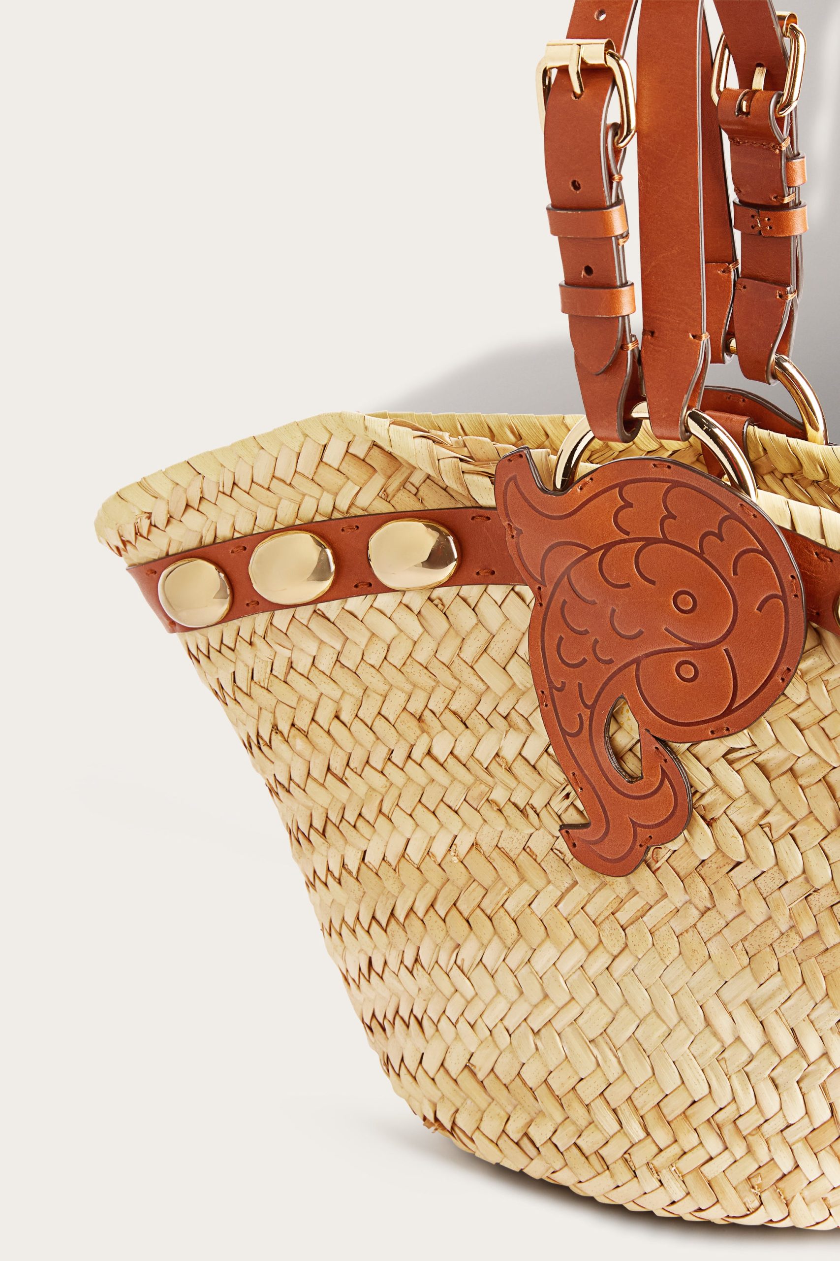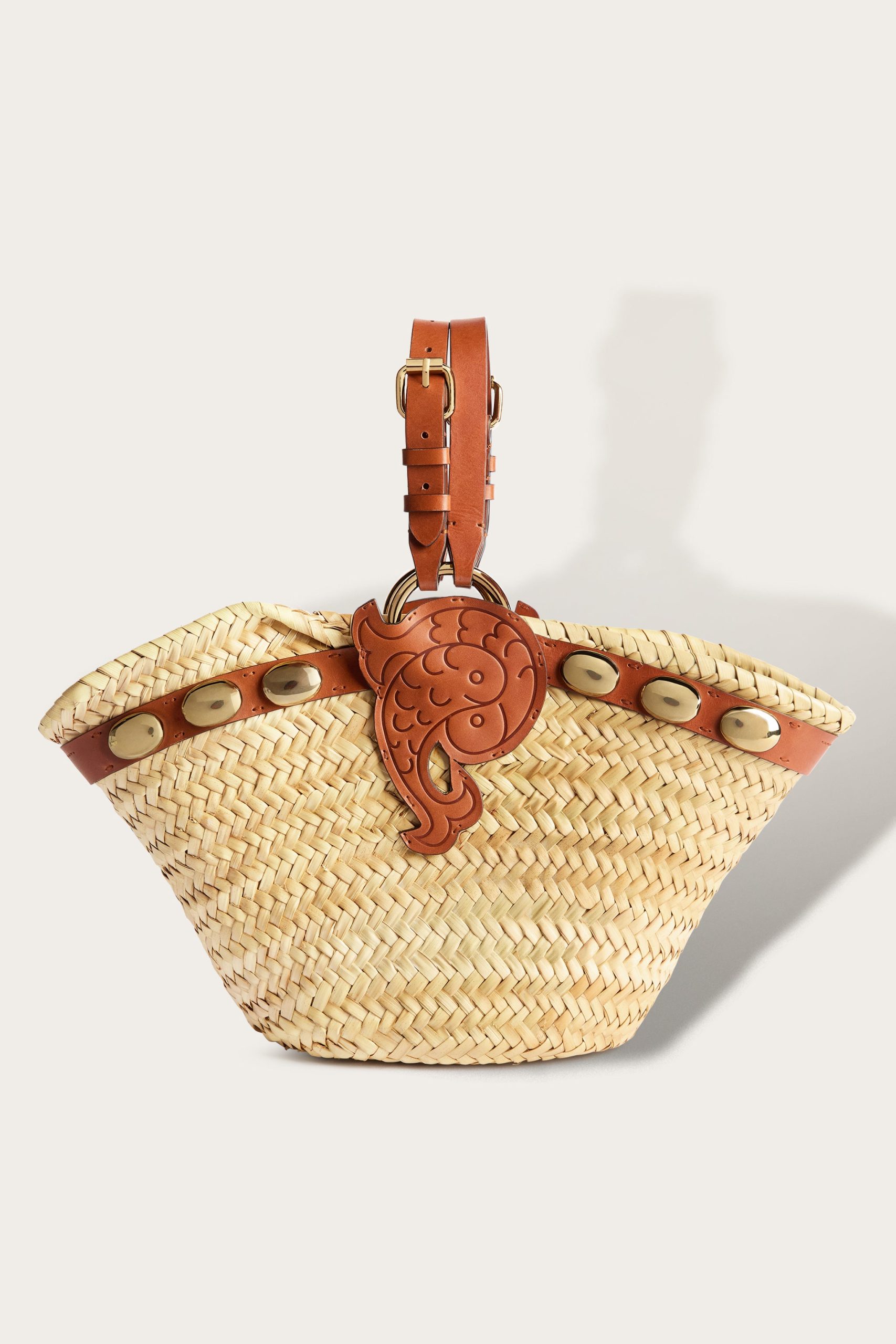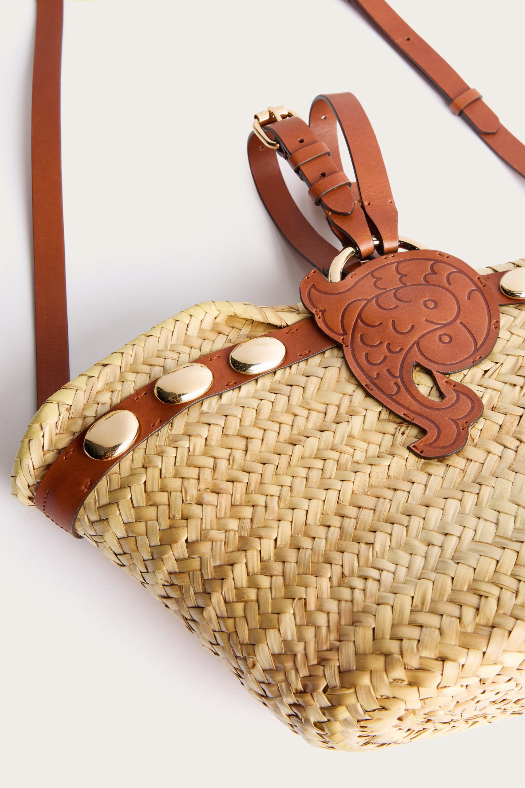 Imagine a bright day, the warmth of the sun on your skin, and the freedom to carry only your essentials-that’s where this panier bag becomes your ideal companion. Made of palm braid, it captures the handcrafted charm of summer traditions, enhanced by a soft tassel strap for a touch of luxury.Inside, a detachable printed silk twill pouch protects your most treasured items, while playful details, such as the metal zipper pull and embroidered Pesci patches, lend a fresh, carefree air. The Iride print completes a design that evokes lightness and sophistication.
