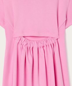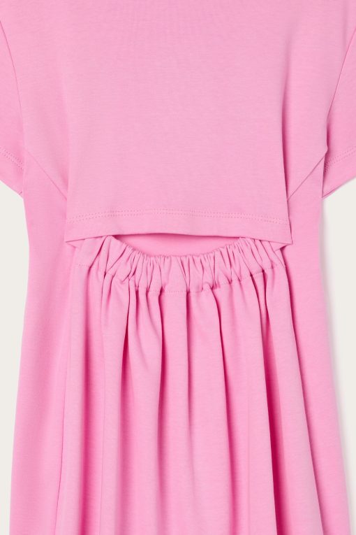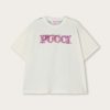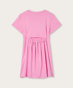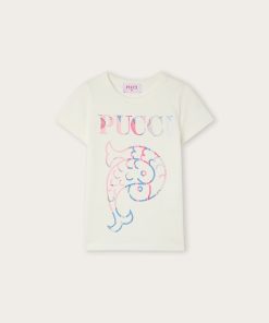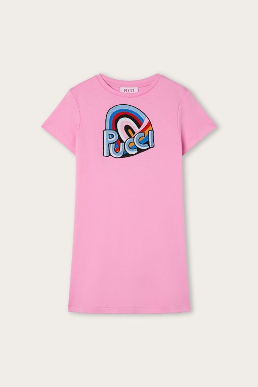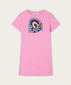 As comfortable as a T-shirt, as cheerful as an outdoor game. This dress is designed to accompany little ones’ days with lightness and color. The top is shaped like a classic short-sleeved T-shirt, while the flared skirt adds movement and freedom. The original elastic detail on the back, leaves a small opening that makes the garment even cooler and more suitable for the season. Completing the look is the colorful Pucci print on the chest: a lively and unmistakable touch, perfect for little women with a bold style.