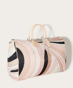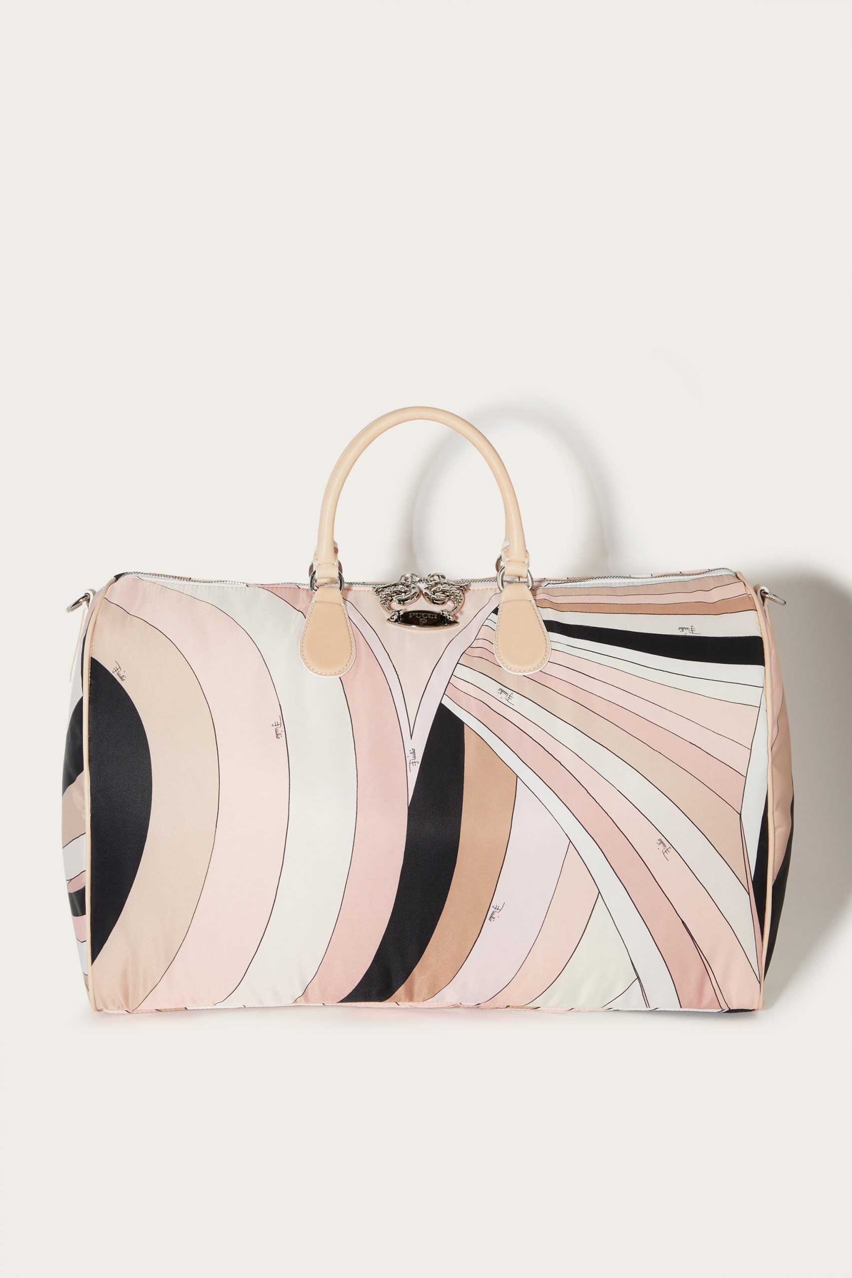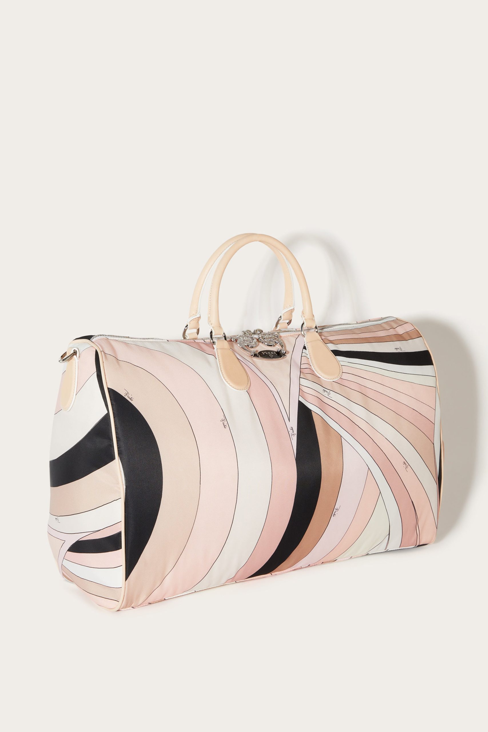 The large padded nylon bag is the perfect ally for those seeking practicality and style in a single accessory. Ideal for tackling the most hectic days with elegance, it combines lightness and sturdiness thanks to its printed nylon structure.The padded design and contrasting edges lend a modern and versatile character, while the iconic Iride print, declined in shades of nude, celebrates Pucci’s timeless aesthetic. Distinctive details, such as the Pucci enameled plaque and Pesci-shaped zipper pull, add a touch of originality. Equipped with handles, an adjustable shoulder strap and an interior zippered pocket, it is perfect to accompany you on your daily adventures, from work to leisure.