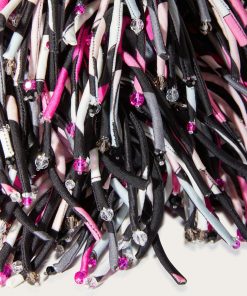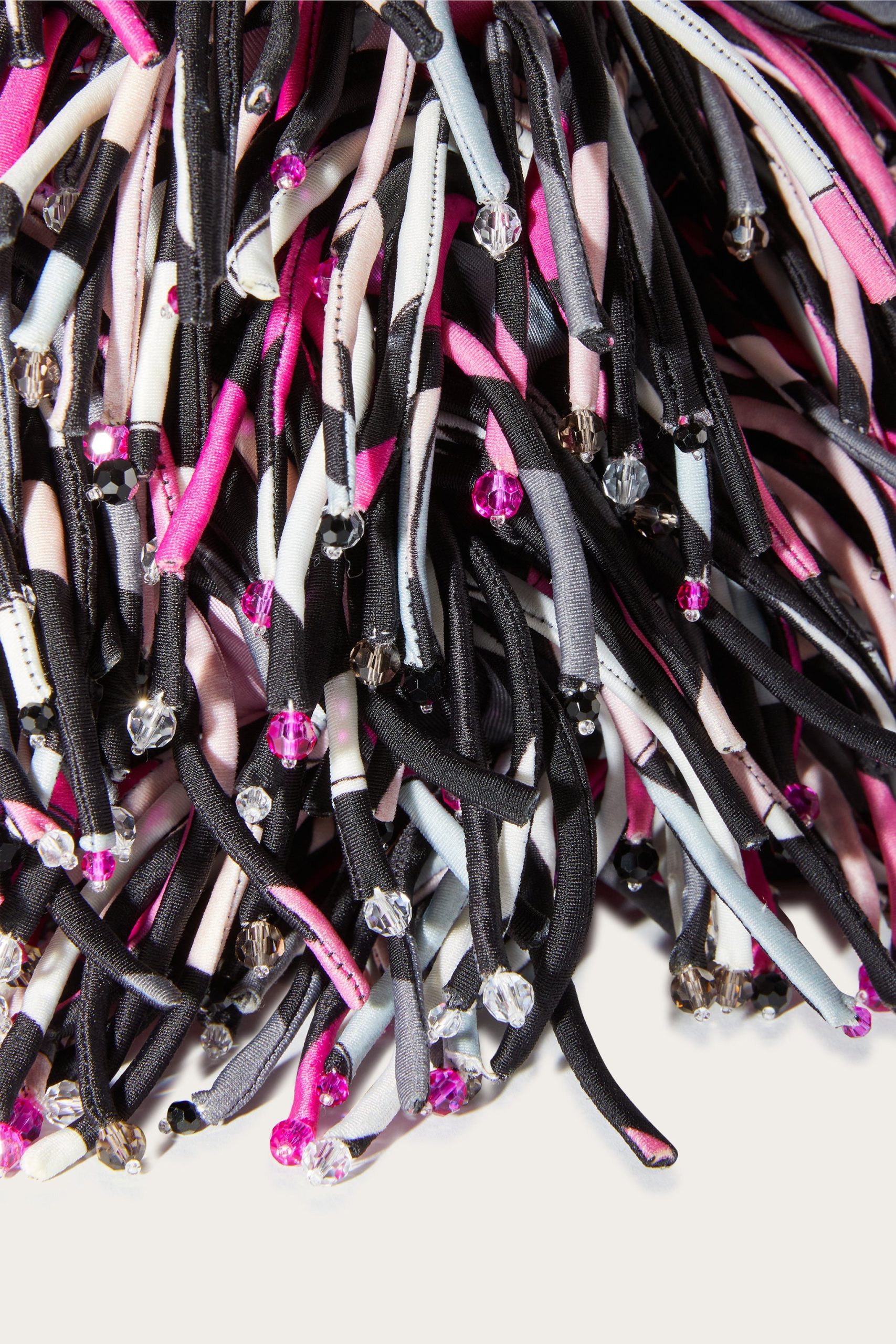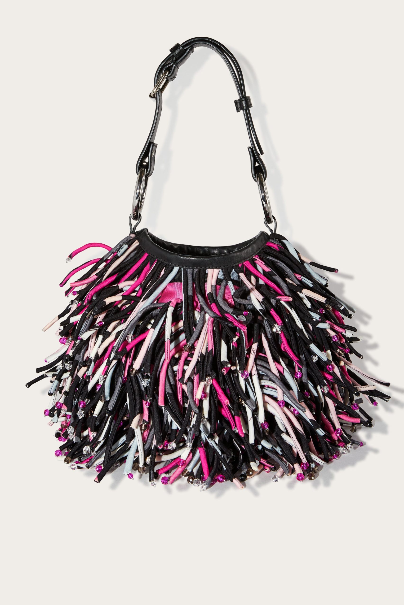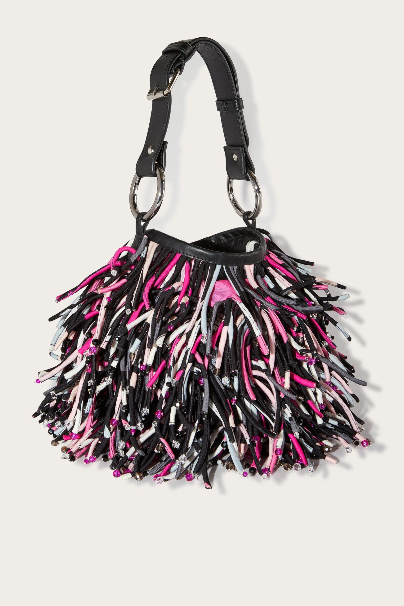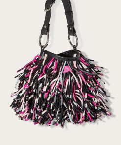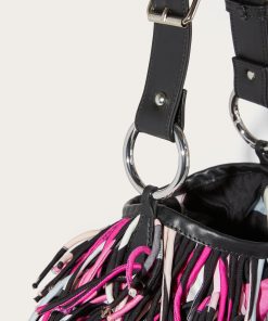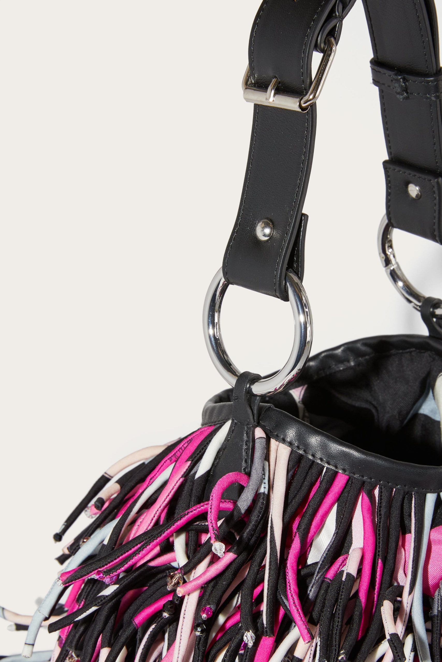 A bold and sophisticated accessory, perfect for those who love to get noticed. This fringed bucket bag, embellished with Marmo print in black and fuchsia, is a masterpiece of craftsmanship and design. The adjustable buckle handle ensures comfort and versatility, while refined details, such as the Pesci-shaped zipper pull and decorative beads, add a distinctive touch. Whether paired with evening looks or a more casual outfit, this bag is a true style statement.