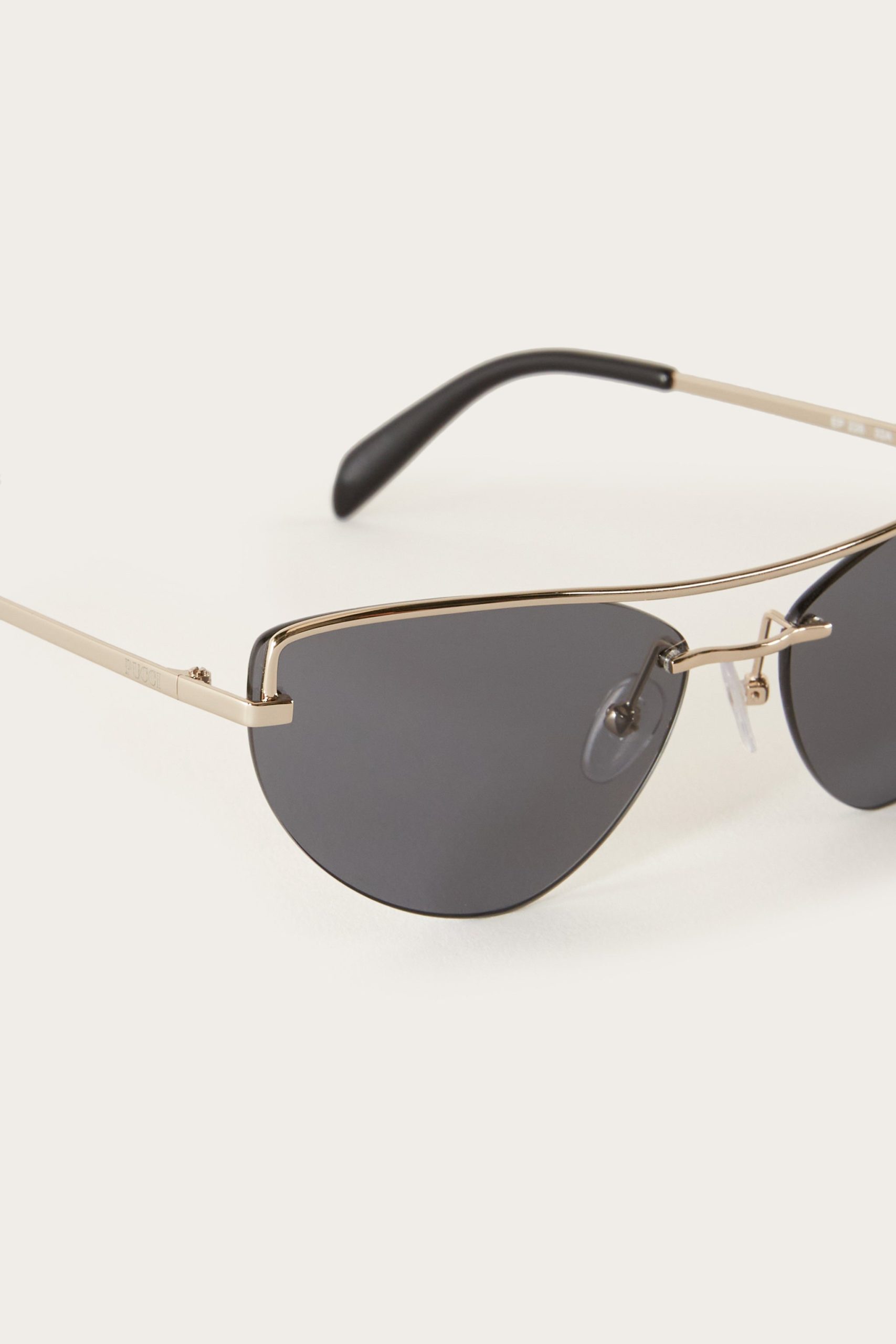 A celebration of Pucci’s innovative spirit, these cat-eye sunglasses are refreshed with contemporary accents. They feature a curved gold-tone metal brow bar and an angular bridge that subtly reflects the light.