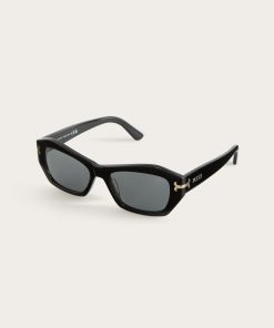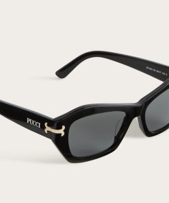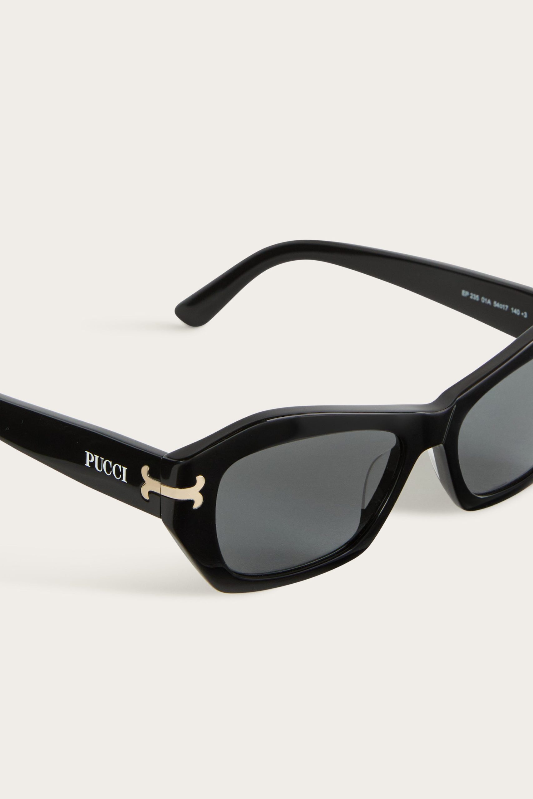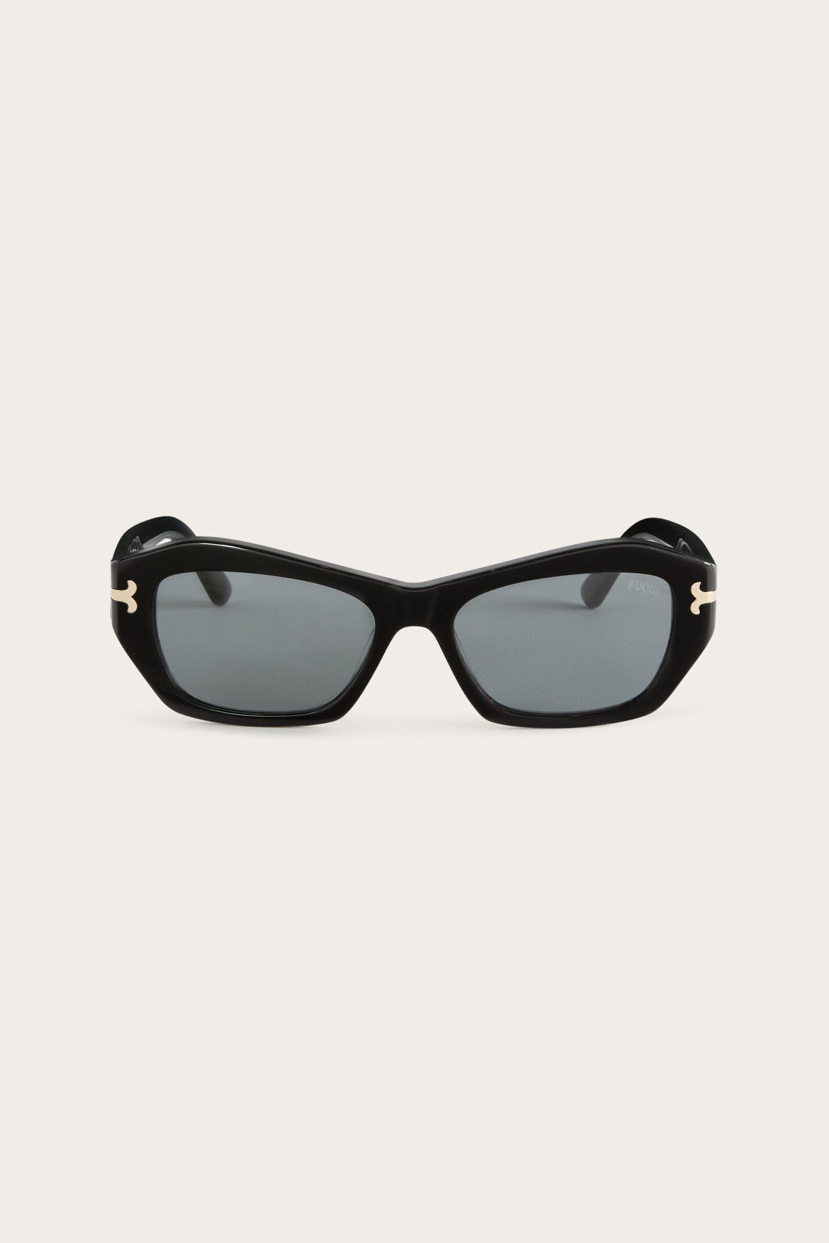 A bold and sophisticated accessory designed for those who like to stand out in style. These hexagonal-shaped sunglasses combine geometric lines and bold character, resulting in a contemporary and striking design.The acetate frame in glossy black color, combined with smoke lenses, gives depth and sophistication to the look, maintaining a perfect balance between elegance and modernity. Ideal to complete any look with a graphic and distinctive touch.