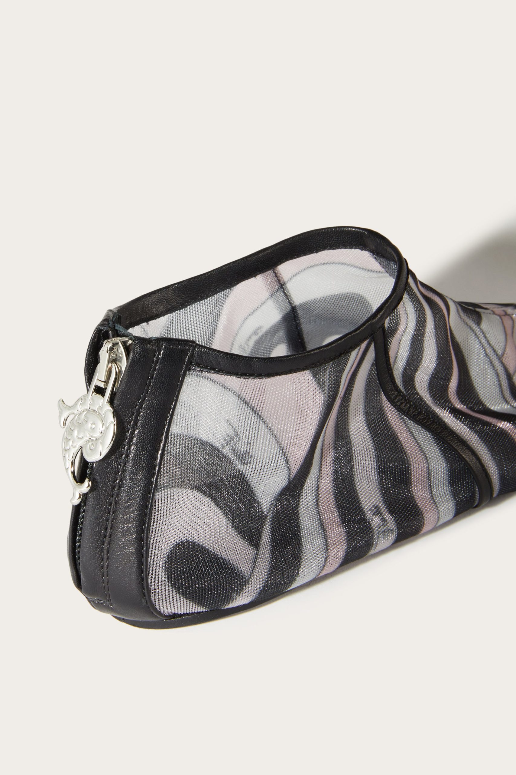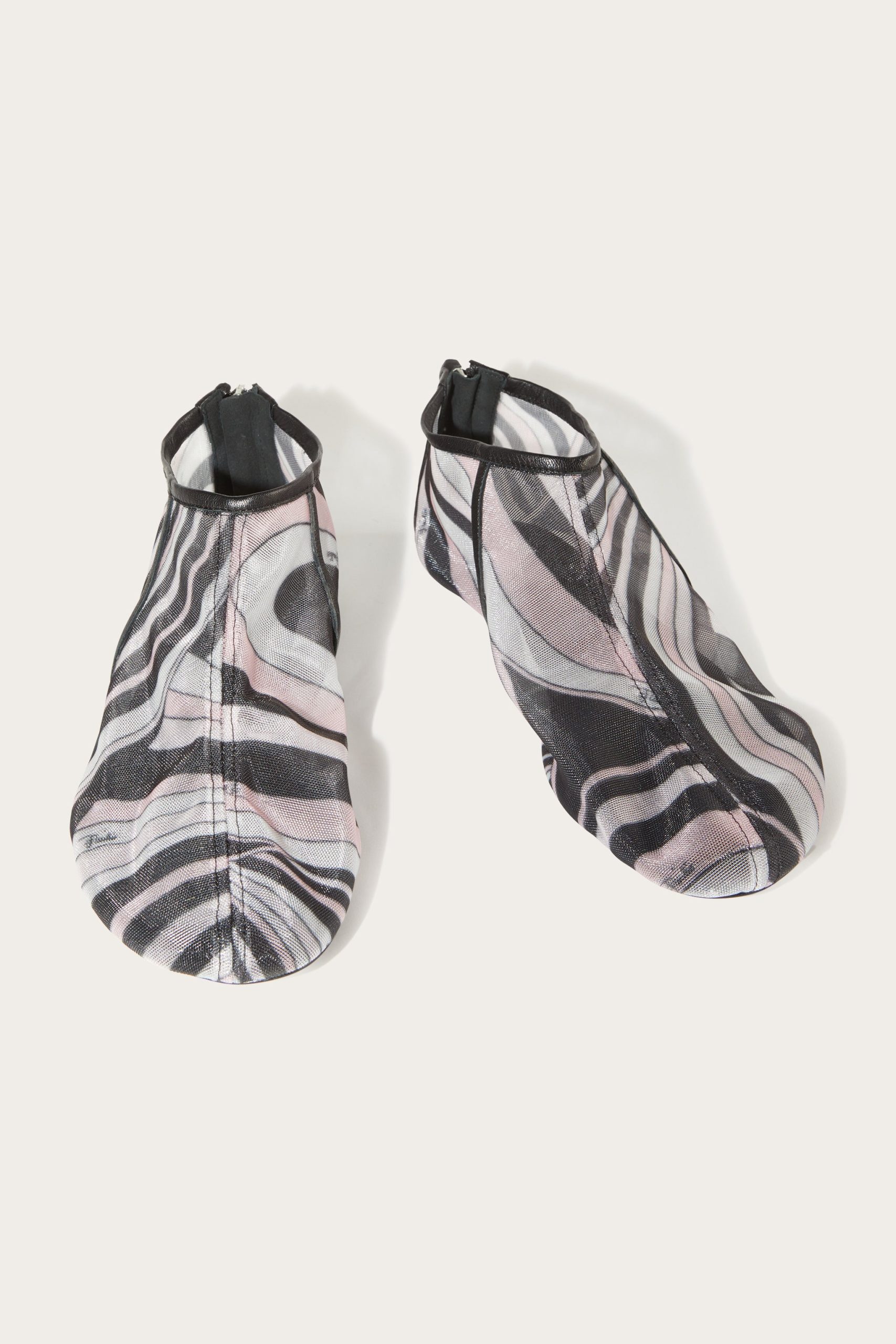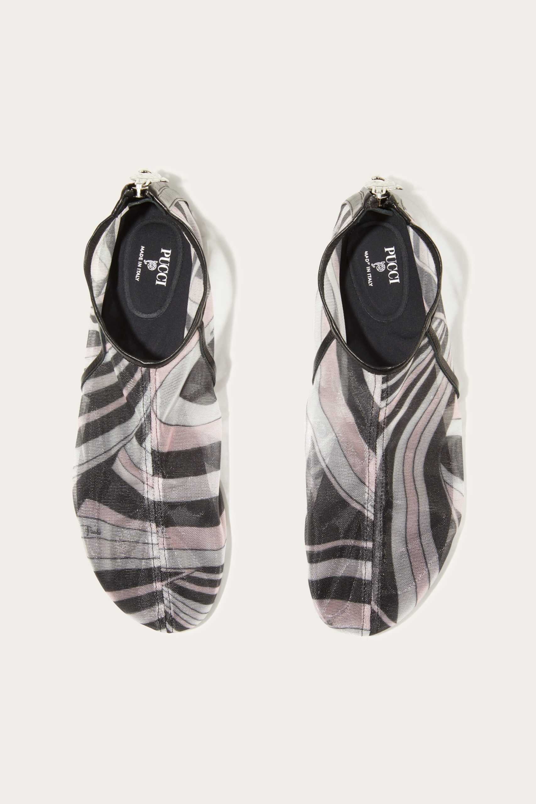 Showcasing Pucci’s eclectic range of influences, Camille Miceli reimagines the flat shoes in a minimalist silhouette. The pair is crafted in soft Iride-print mesh and detailed with the house’s signature Pucci P at the zip pull.