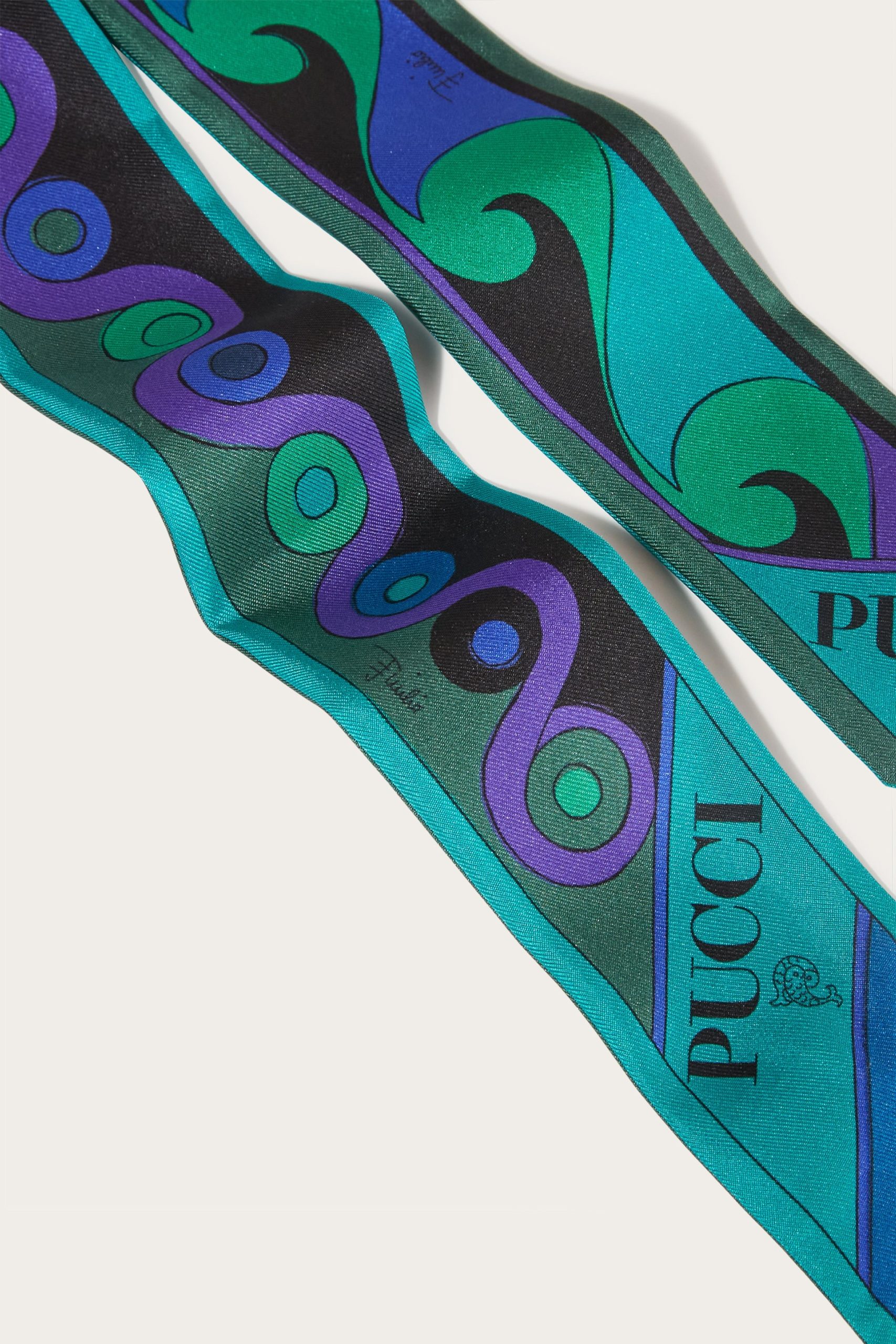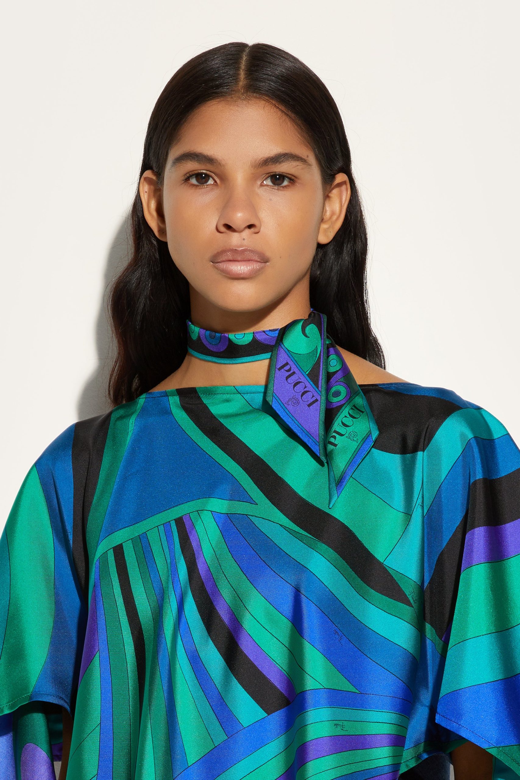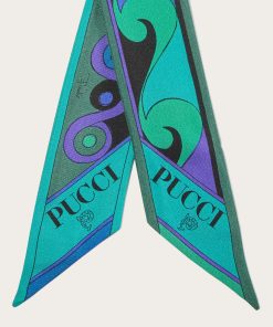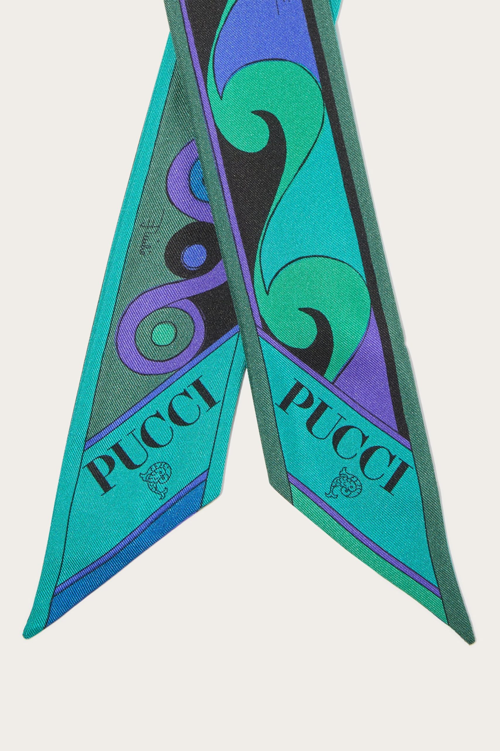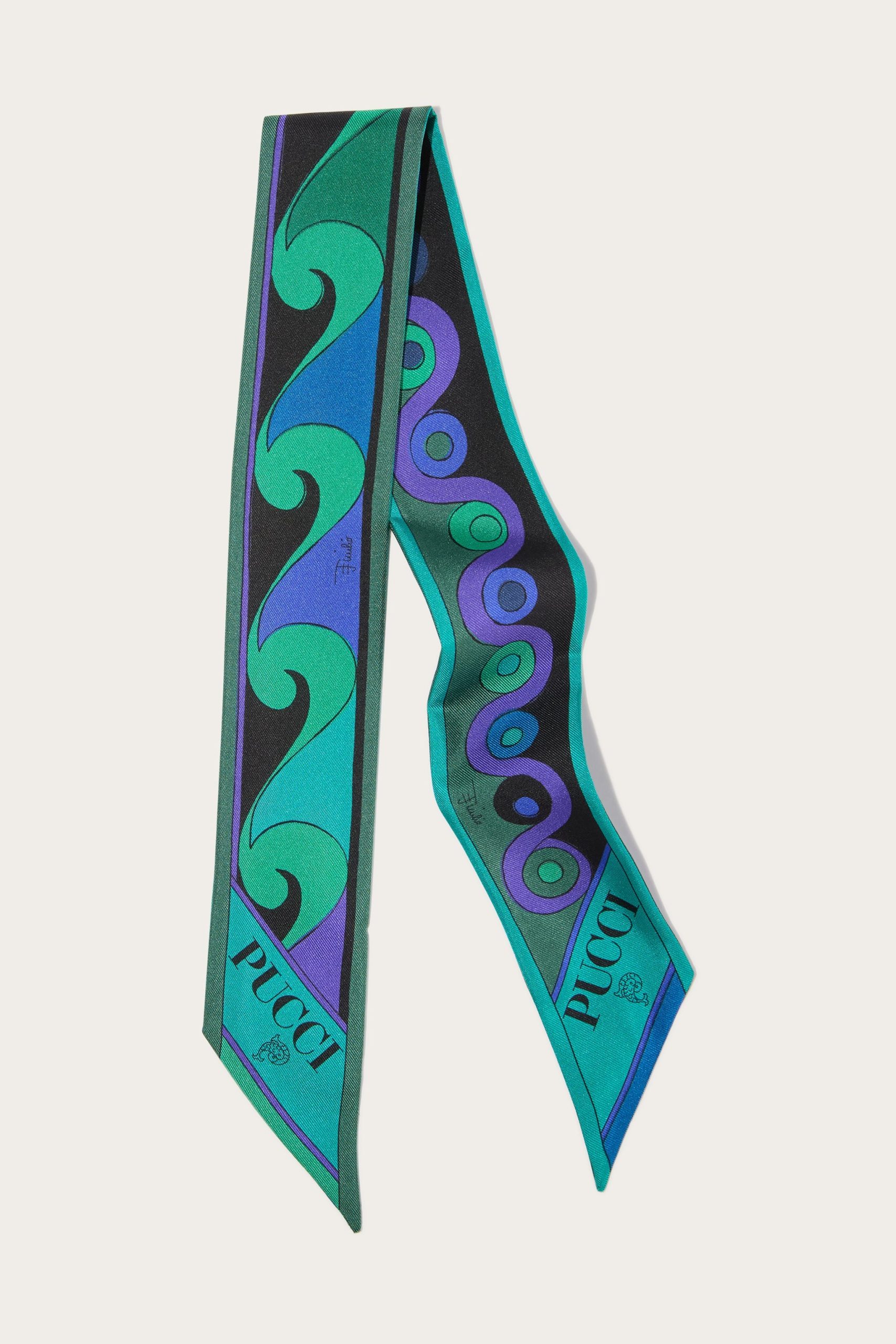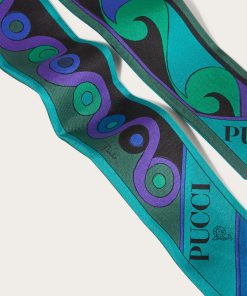An accessory that encapsulates all the vibrancy and elegance of the Pucci world. This silk twill, with its pointed edges and mix of iconic prints, Iride and Bouclé, in shades of emerald, is perfect for adding a touch of color and sophistication to any look.Versatile and lightweight, it can be worn as a headband, around the neck or tied to the bag for a detail that won’t go unnoticed.
