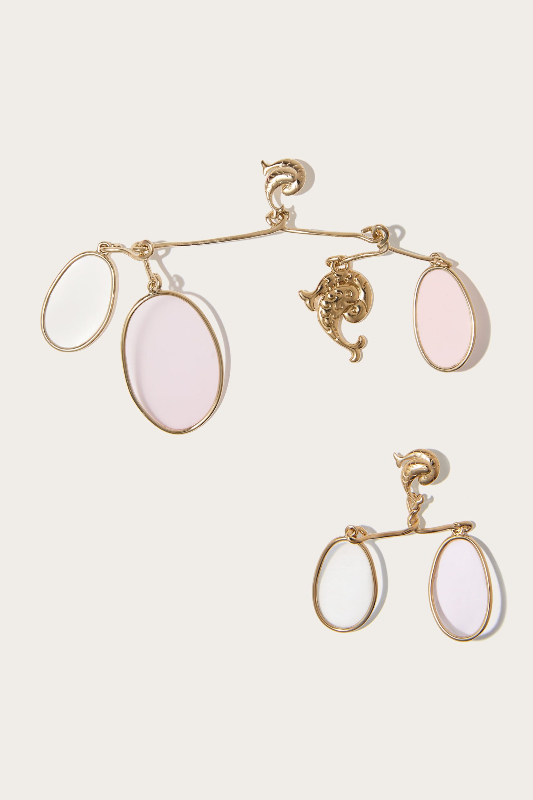Sculptural, catching the light and catching the eye, these chandelier earrings are a piece of jewelry that tells a tale of history and innovation, a perfect meeting of sophistication and boldness. Made of brass with a shiny gold metal finish, they feature small, colorful dangling frames on the inside alternating with the Pesci-shaped charm that adds a touch of originality and symbolism. The nude color scheme gives the design a contemporary and delicate vibe. Worn to embellish an evening dress or to give a stylish twist to a more casual look, they will make any outfit sparkle with personality.