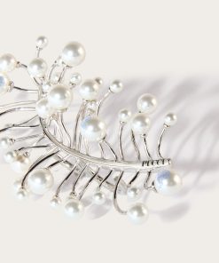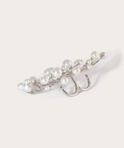 Designed to be worn across two fingers, this silver-tone ring fans into a feather shape with crystal-embellished arcs tipped with scores of faux pearls that look as though they’re floating.