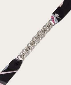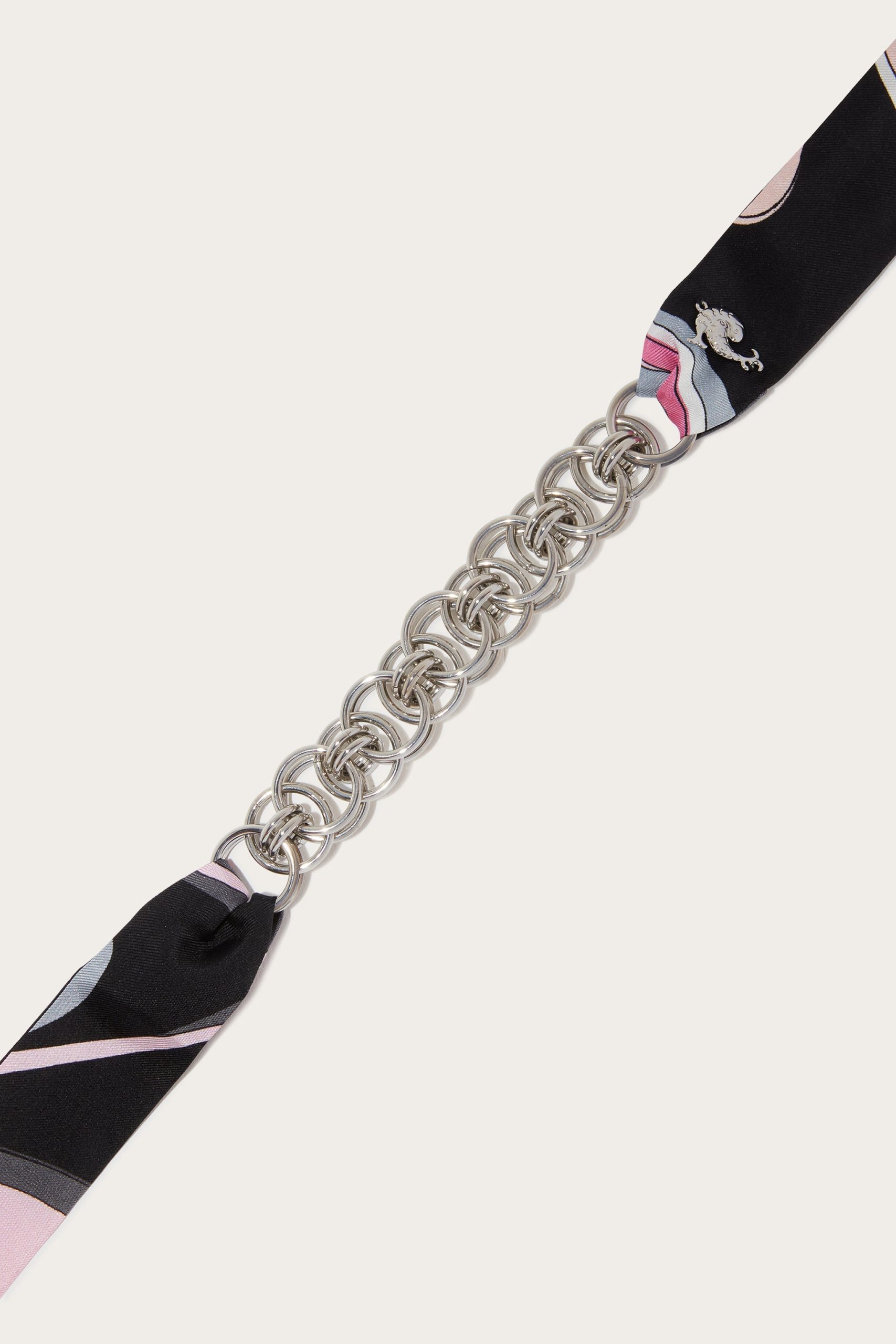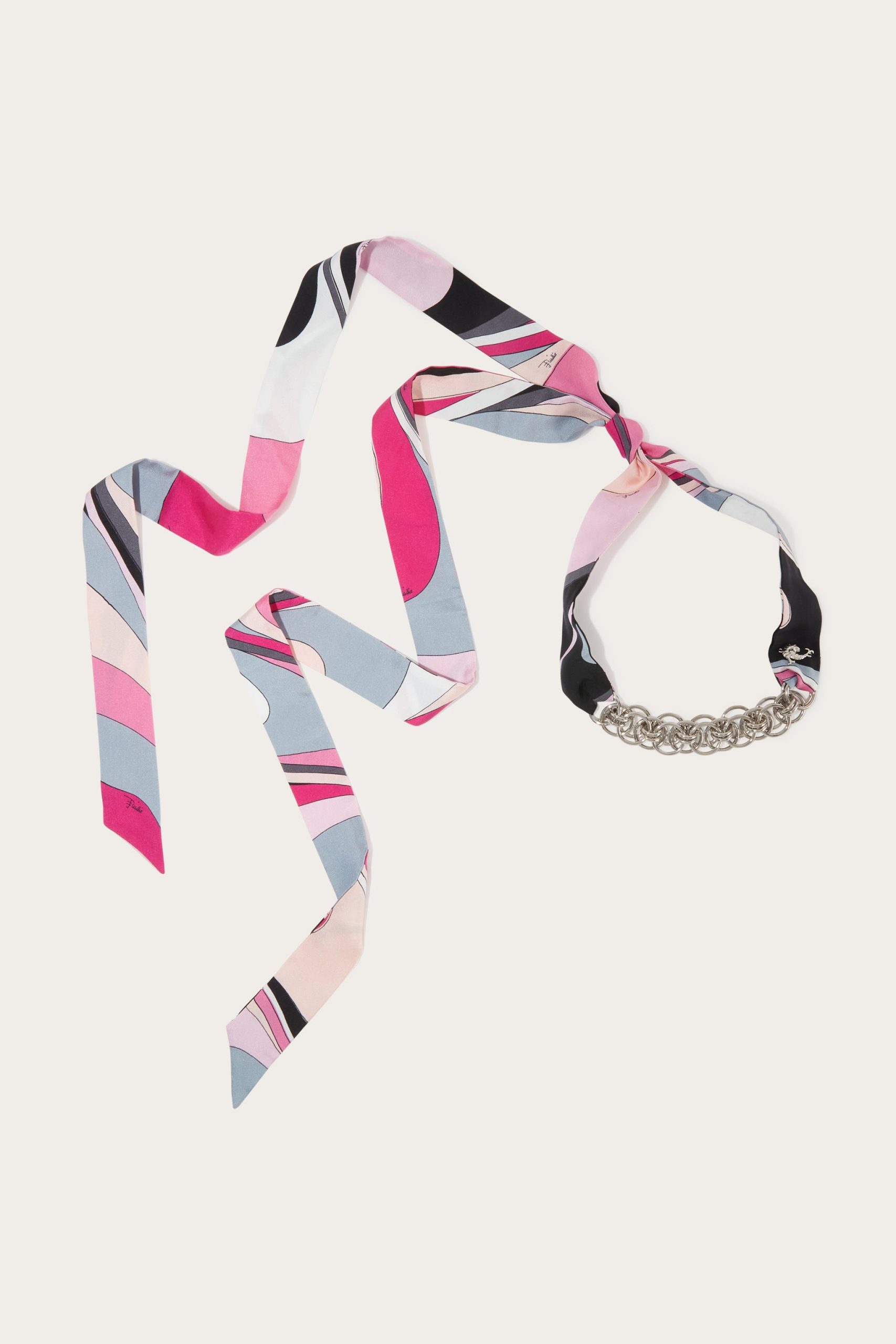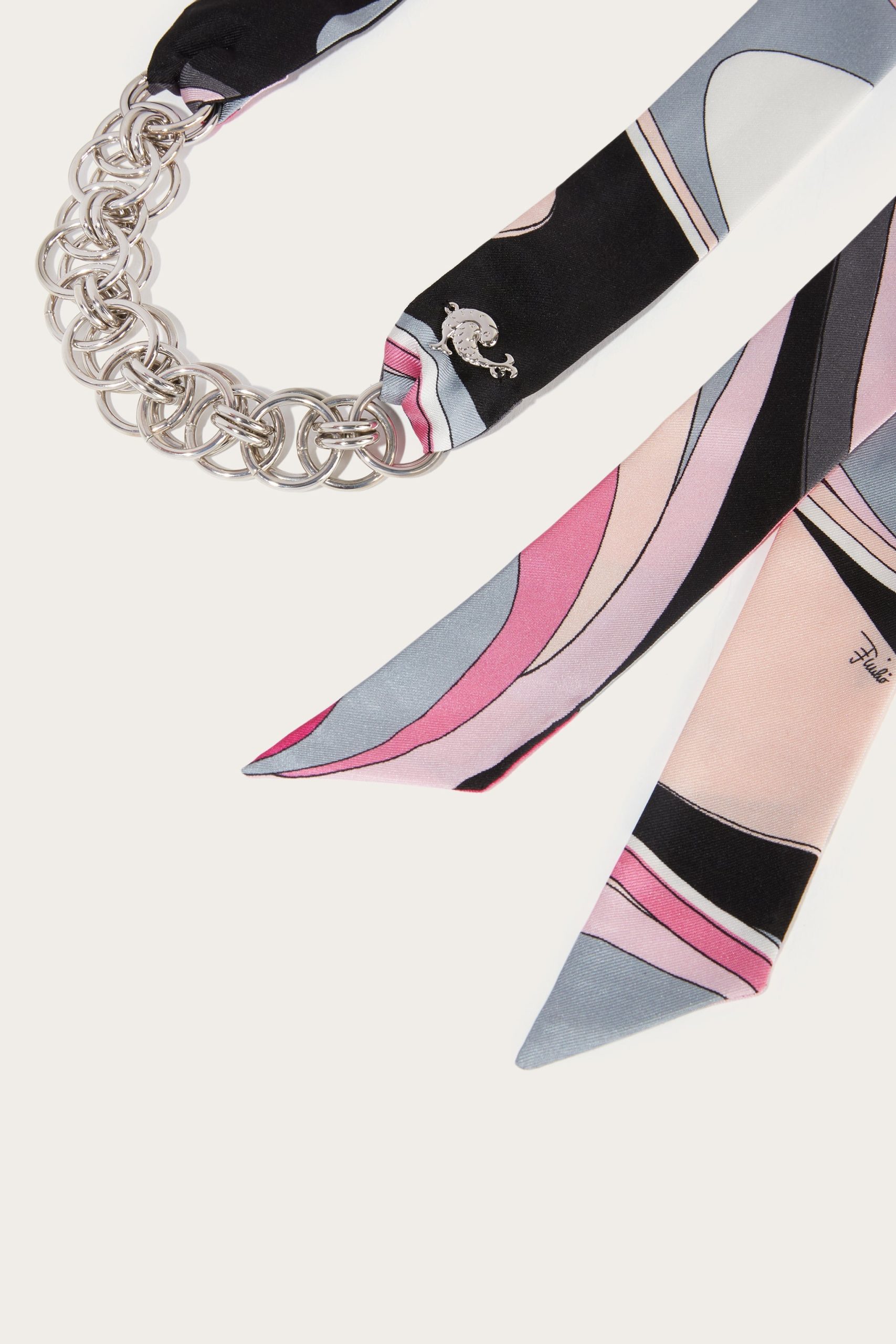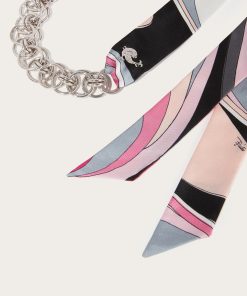 A piece of jewelry that chronicles the perfect balance of craftsmanship and contemporary style. This necklace combines a brass chain with two long silk ribbons featuring the iconic Onde print in pink. Versatile and refined, it lends itself to multiple interpretations: wear it as a necklace, knot it as a belt, or let the ribbons dance elegantly over a dress. Ideal for adding a touch of color and movement to your look.