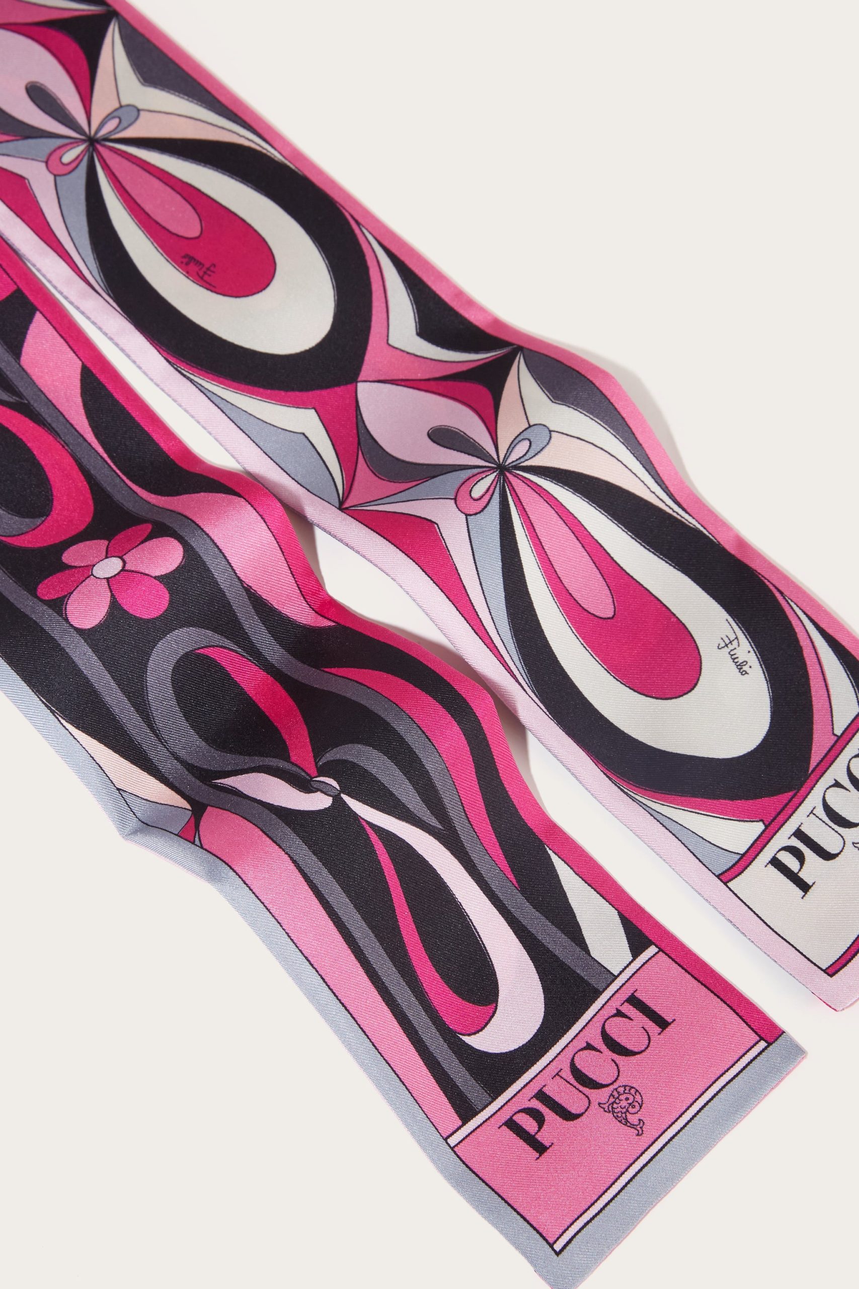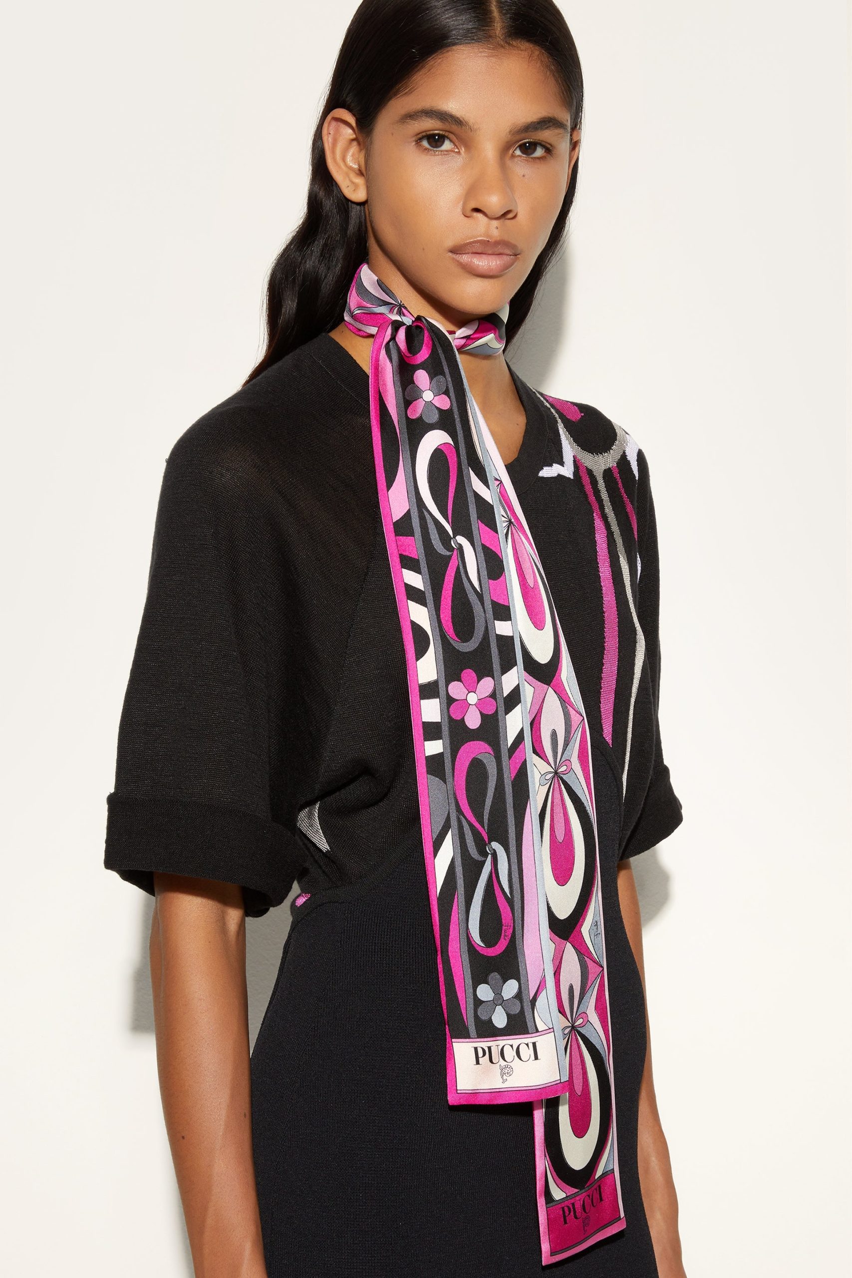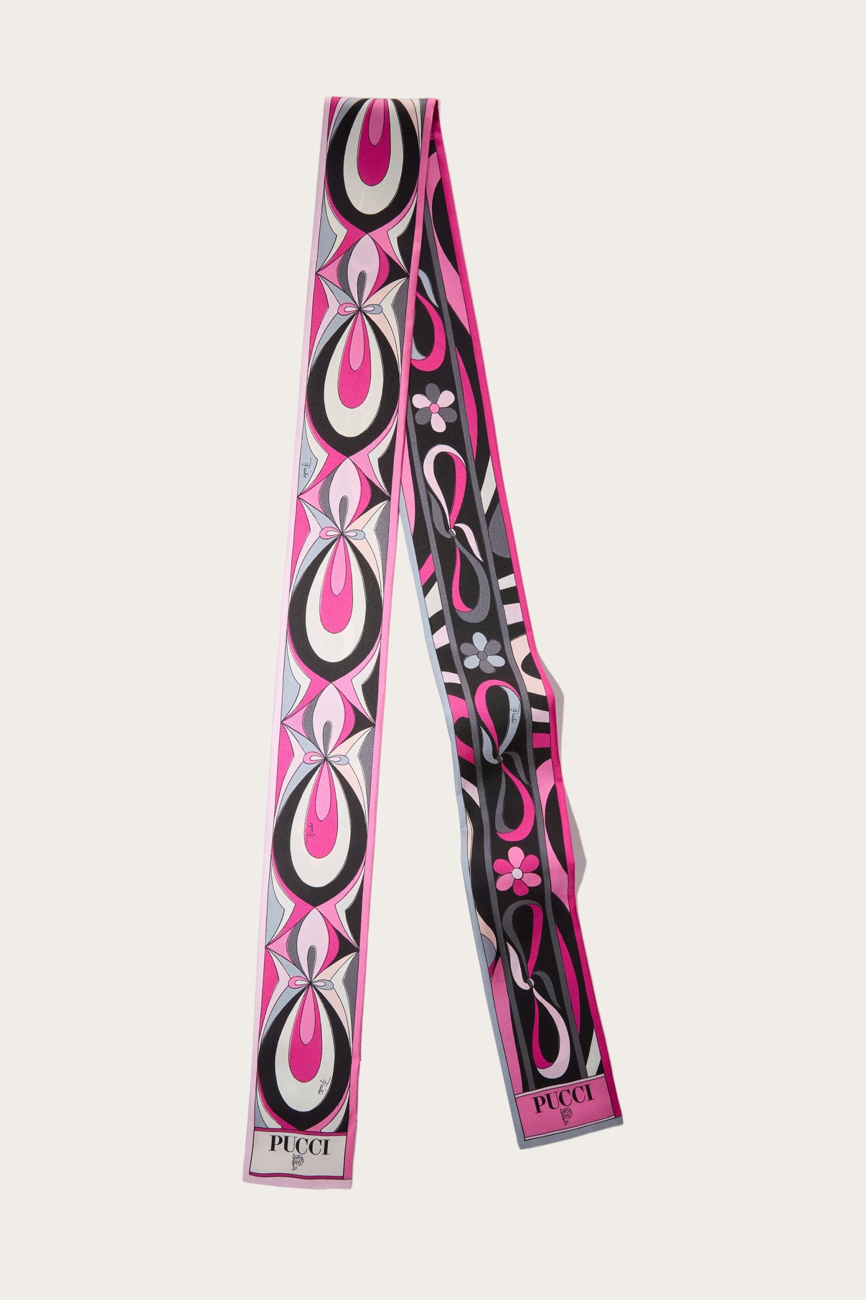 An essential accessory to add a touch of elegance and versatility to your wardrobe. This printed silk twill sash, with its perfect size, is ideal for multiple uses: worn as a belt, wrapped around the neck or used as a decorative detail on bags and hair.The mix of iconic black and fuchsia prints adds a refined contrast, perfect for completing both casual and formal looks with a distinctive touch. A light and sophisticated accessory that suits any occasion.