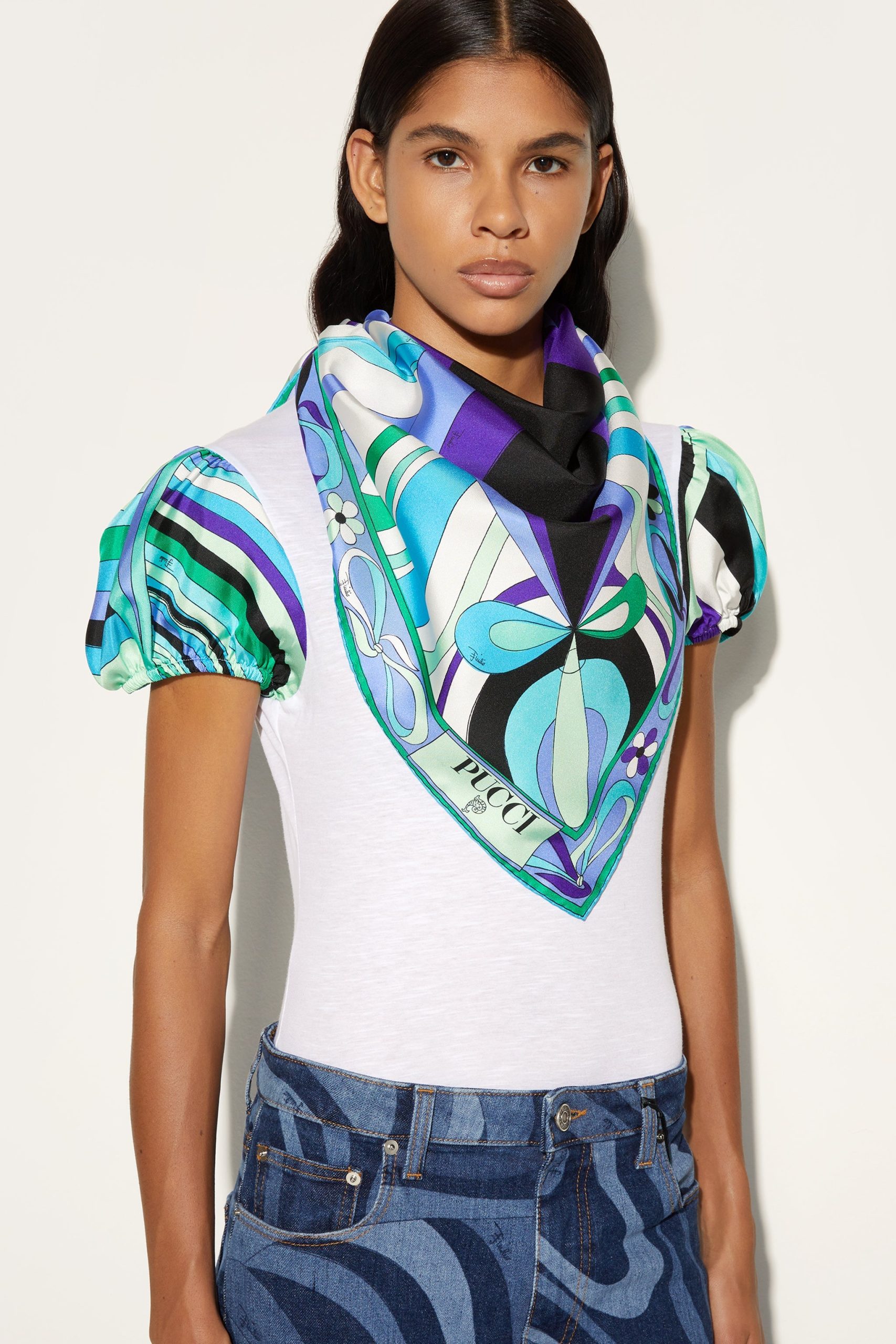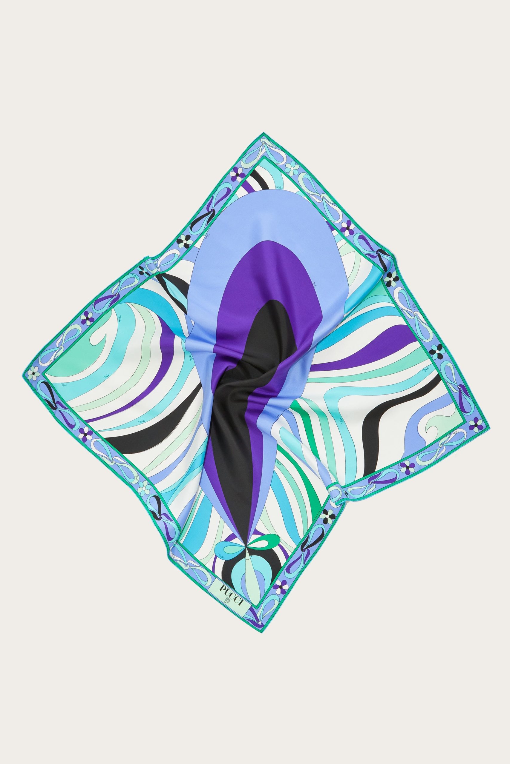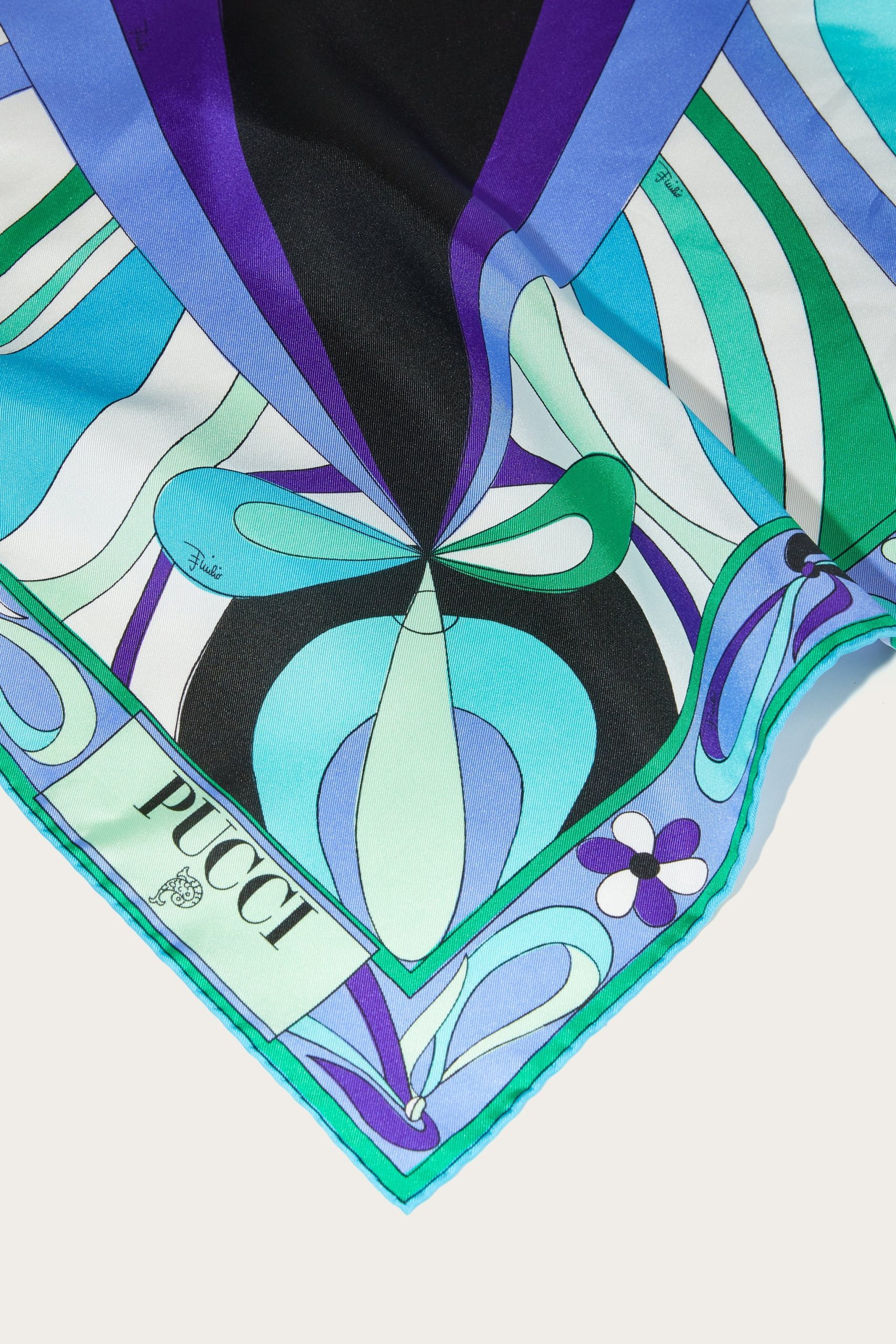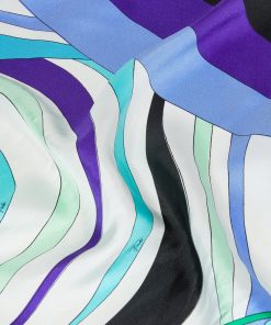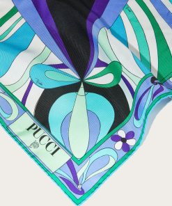 A timeless accessory that encapsulates all the essence of elegance and color of the Pucci world. This silk twill scarf, with its unique mix of prints in green and lilac tones, is the perfect detail to brighten any look.Versatile and sophisticated, it can be worn around the neck, tied in the hair or knotted to the bag for an unmistakable touch of class. A piece that speaks of style and personality, ideal for any occasion.