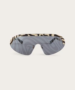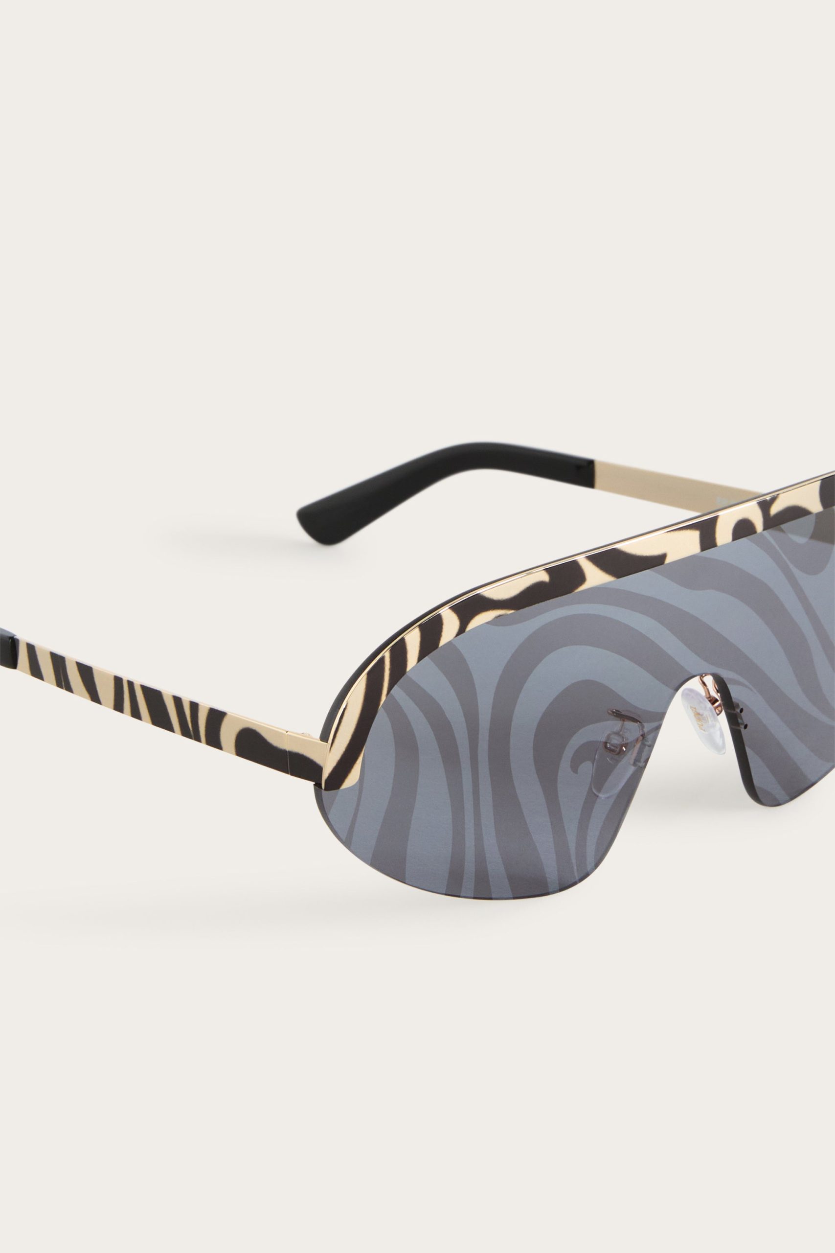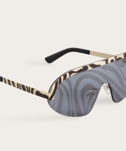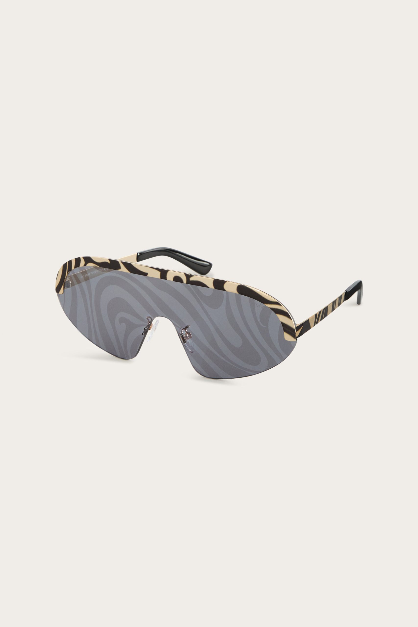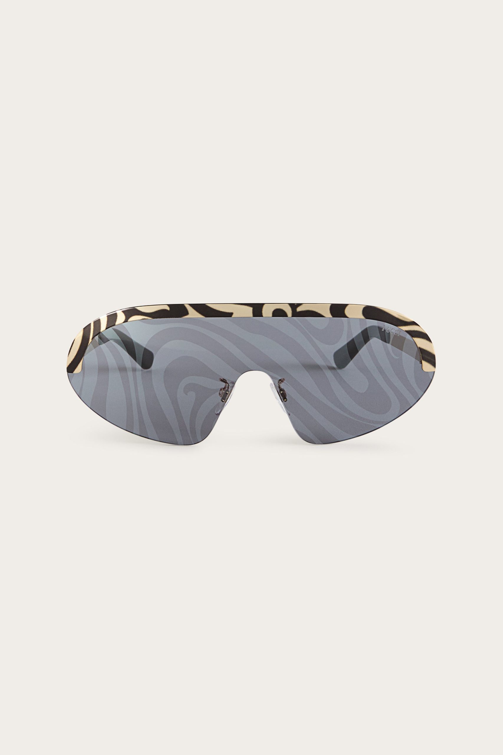 Futuristic and unmistakable, these wrap-around sunglasses express Pucci style with a bold, contemporary design. The Marmo motif, one of the brand’s most iconic, starts from the edge of the frame and elegantly extends along the metal temples until it merges with the smoked mirrored lenses, for a graphic and fluid effect that catches the eye.A bold model that reinterprets the sports mask with a couture touch, designed for those looking for accessories with a strong visual impact.