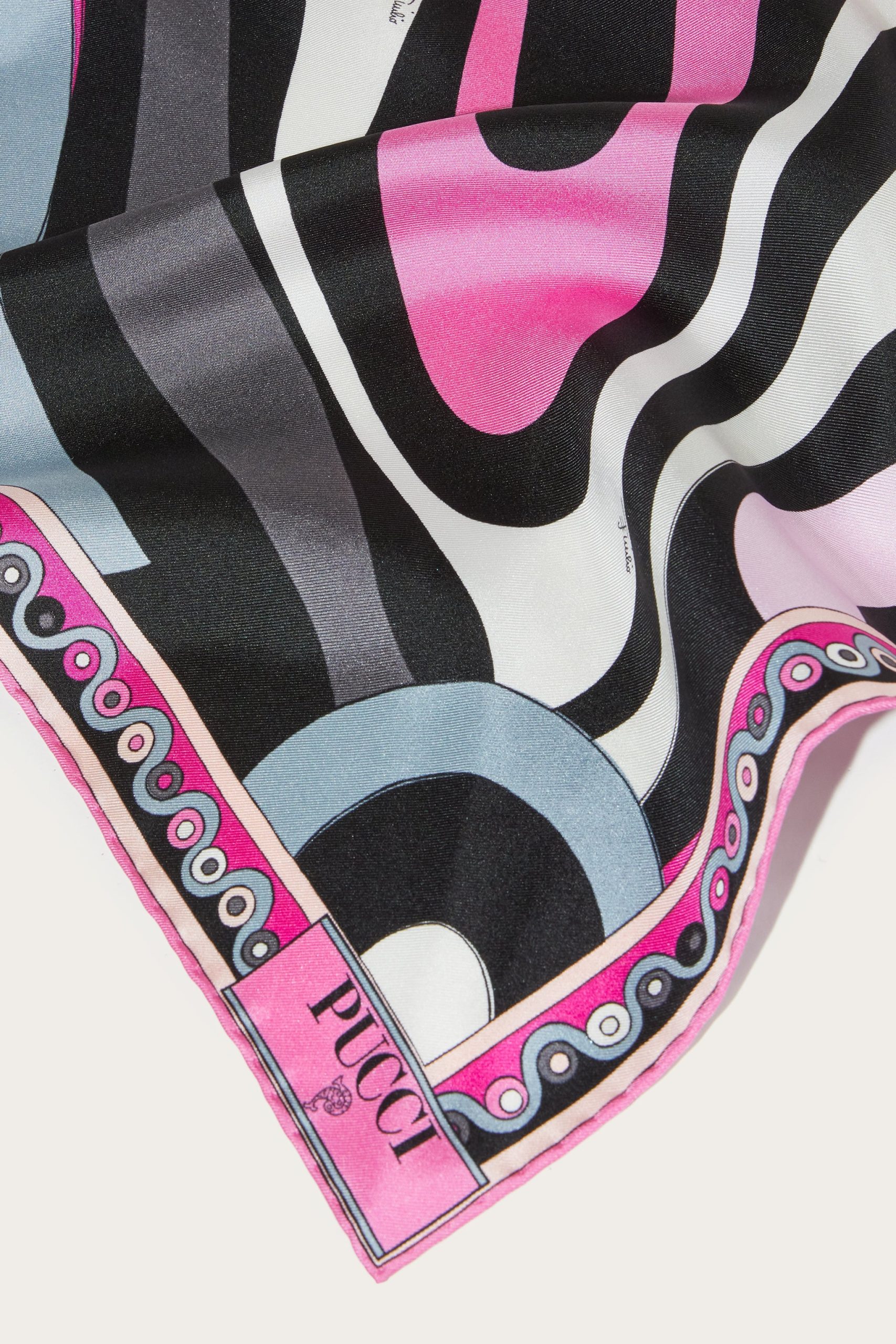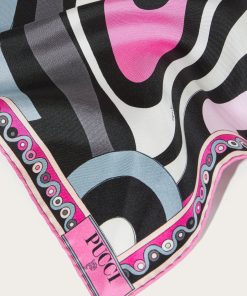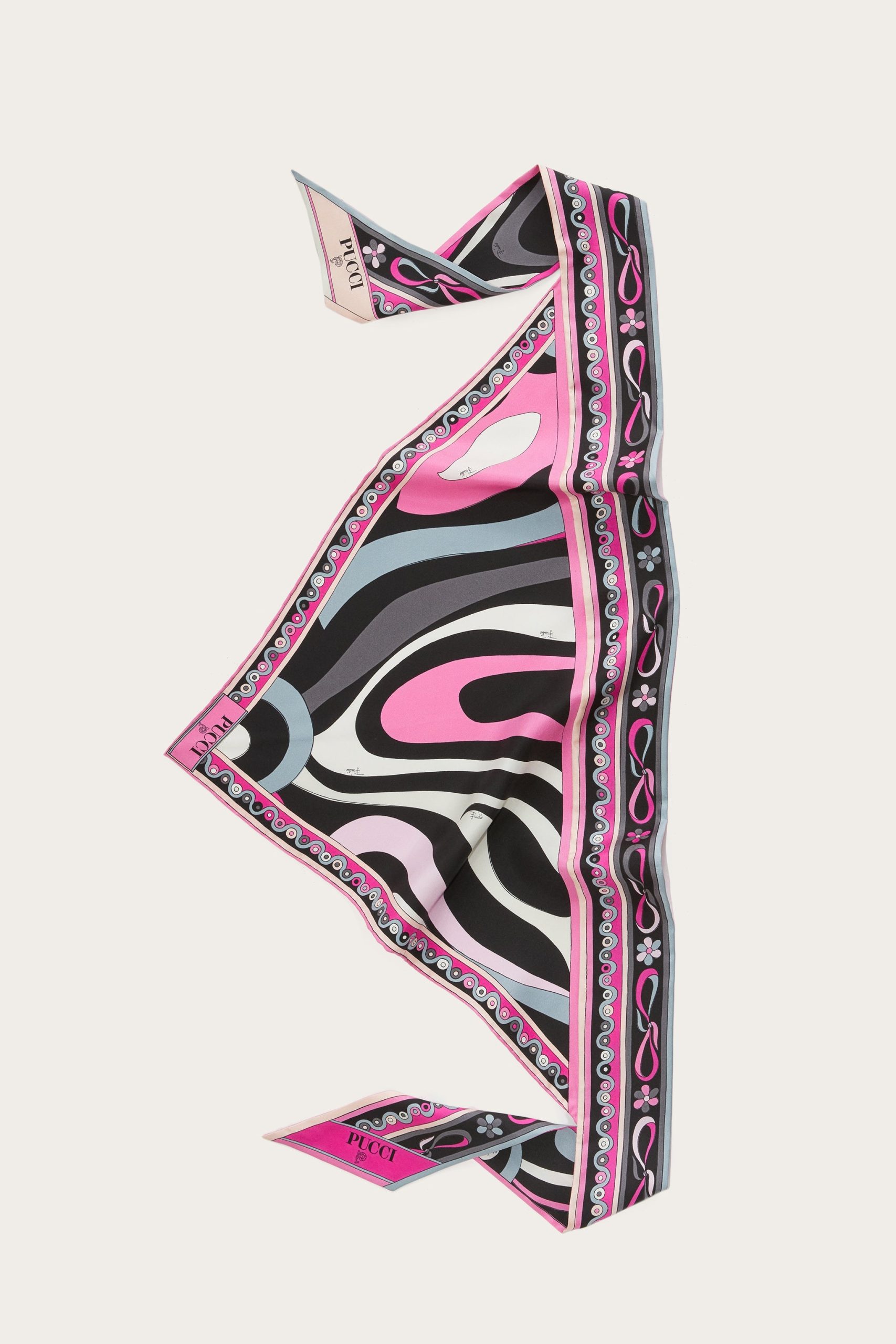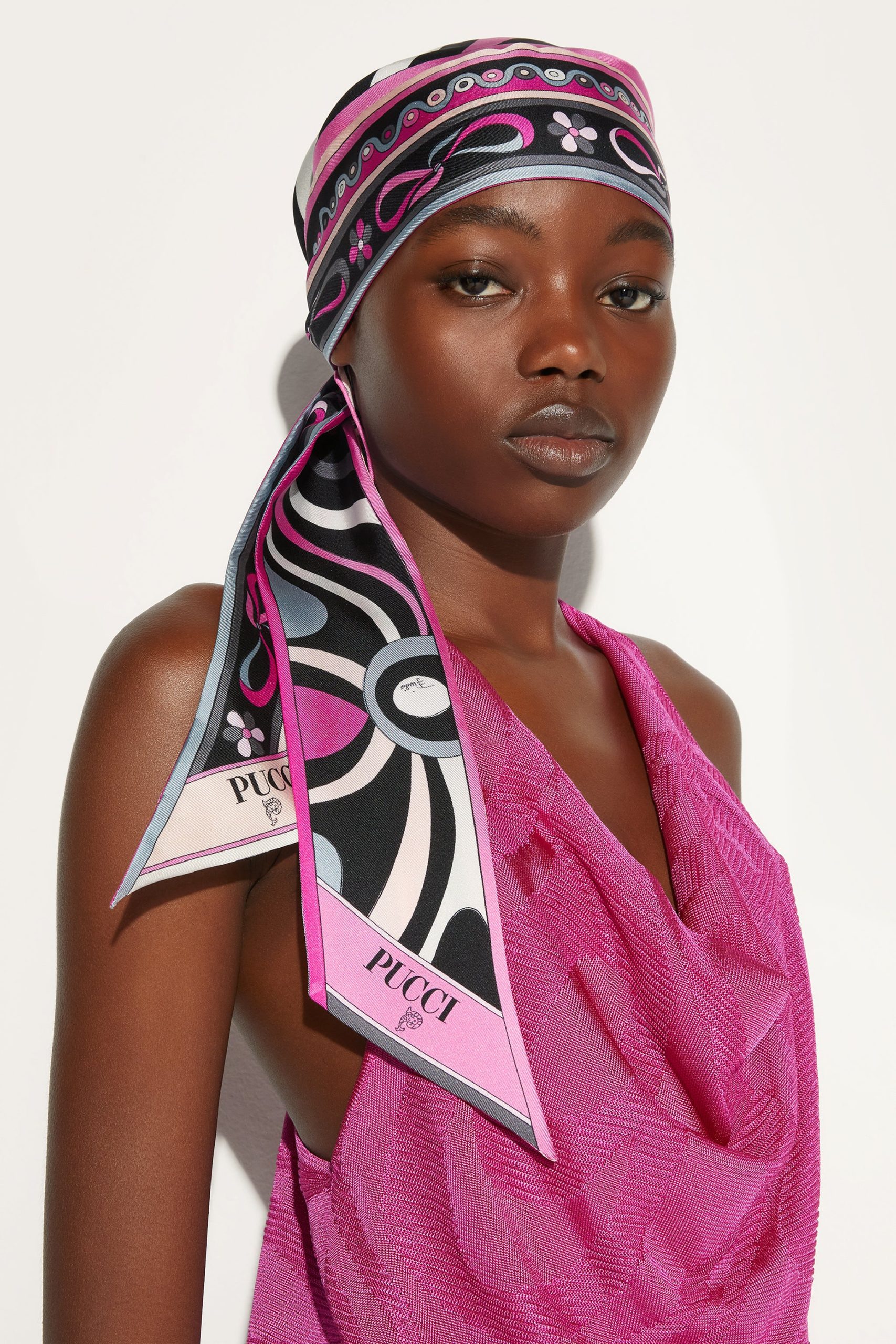 Refined and versatile, designed to add a touch of color and personality to any look. This printed silk twill triangle scarf is a celebration of Pucci’s signature elegance, enhanced by the iconic Marmo print in black and fuchsia.Perfect to wear around the neck, as a headband or even tied to a handbag for a chic accent. Lightweight and fluid, it becomes the detail that transforms even the simplest outfits into style statements.