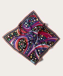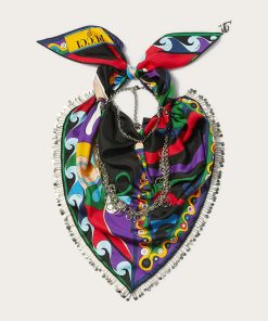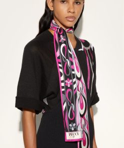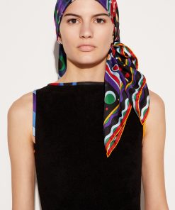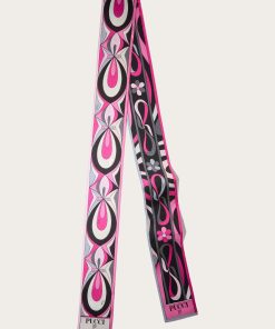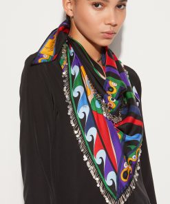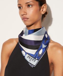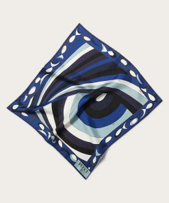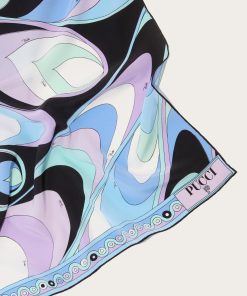 This silk stole showcases the Onde print in elegant blue and purple hues, with contrasting borders that add visual intrigue. A signature detail at the corner features the house moniker alongside Pucci’s iconic intertwined fish motif. It’s designed to be used as a head covering.