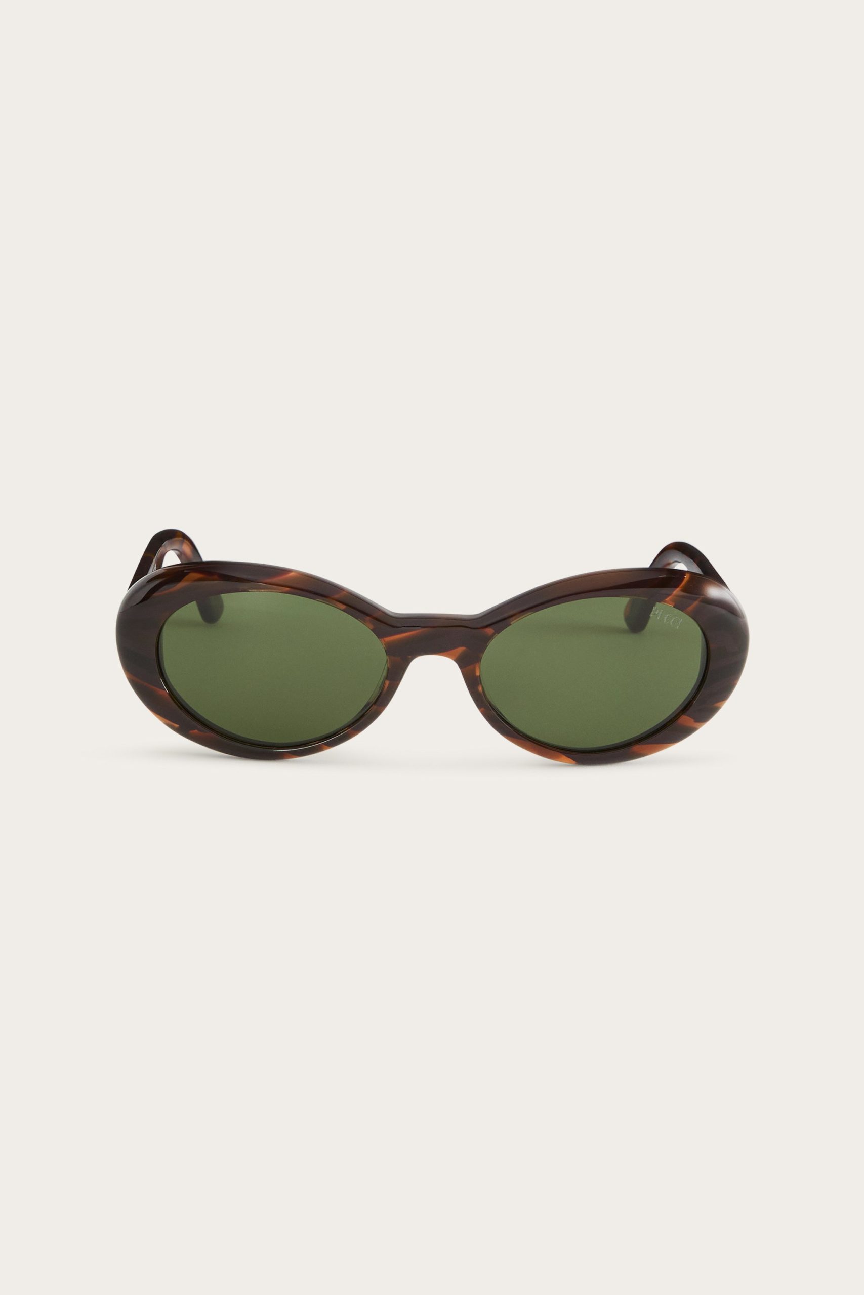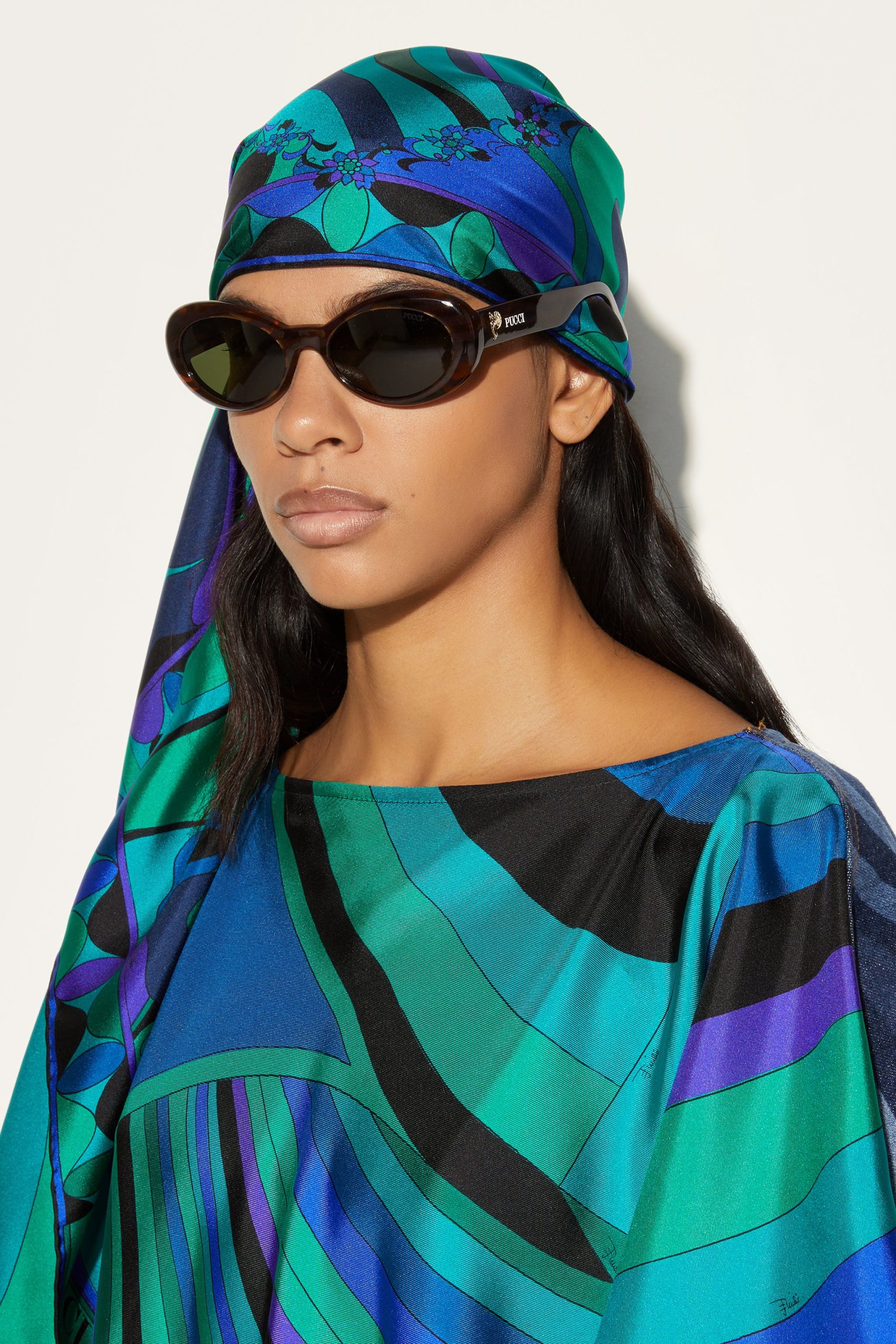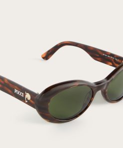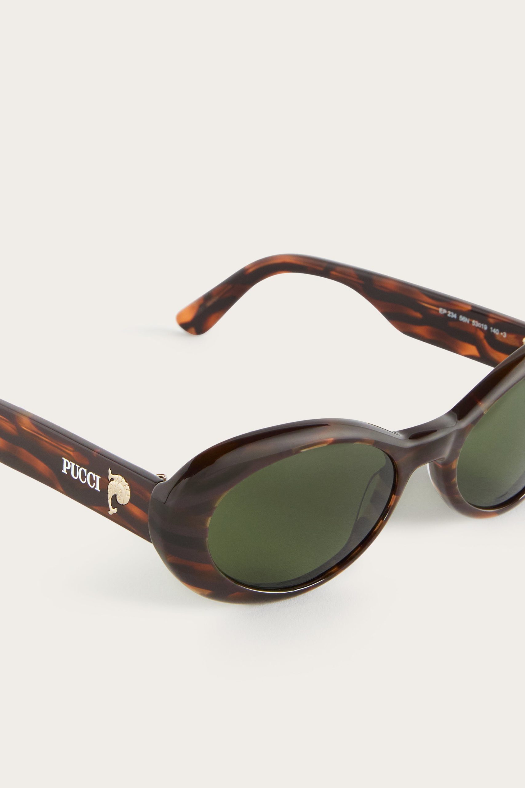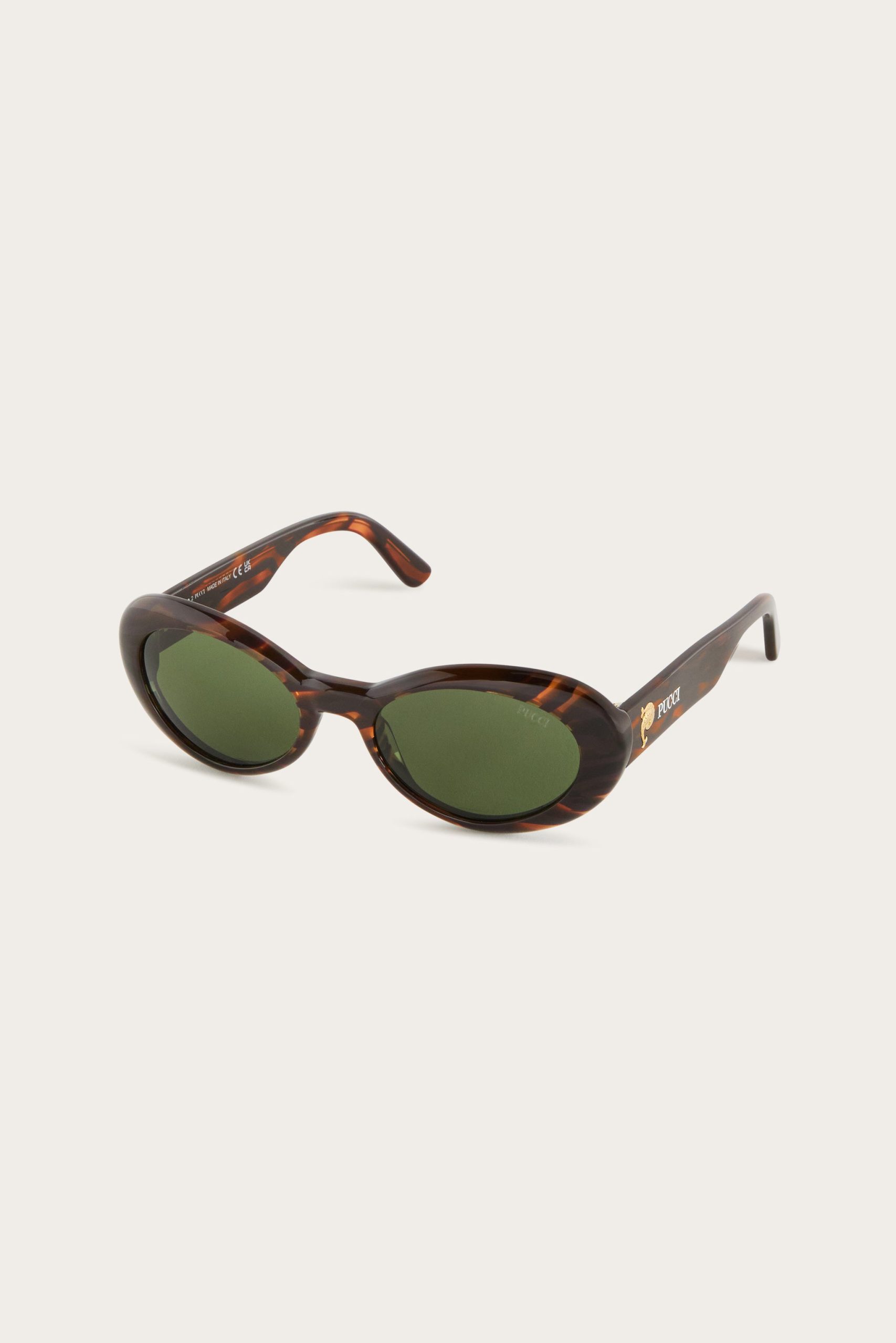 Refined elegance and graphic accents meet in this version of Pucci Fishtail glasses. The oval turtle acetate frame features a rounded, slightly convex line on the front, giving depth and volume to the design. The thin temples, embellished with the iconic Pucci logo followed by the lettering, discreetly balance the look, making it sophisticated and contemporary. Perfect for any occasion, they combine retro charm and modern style.