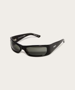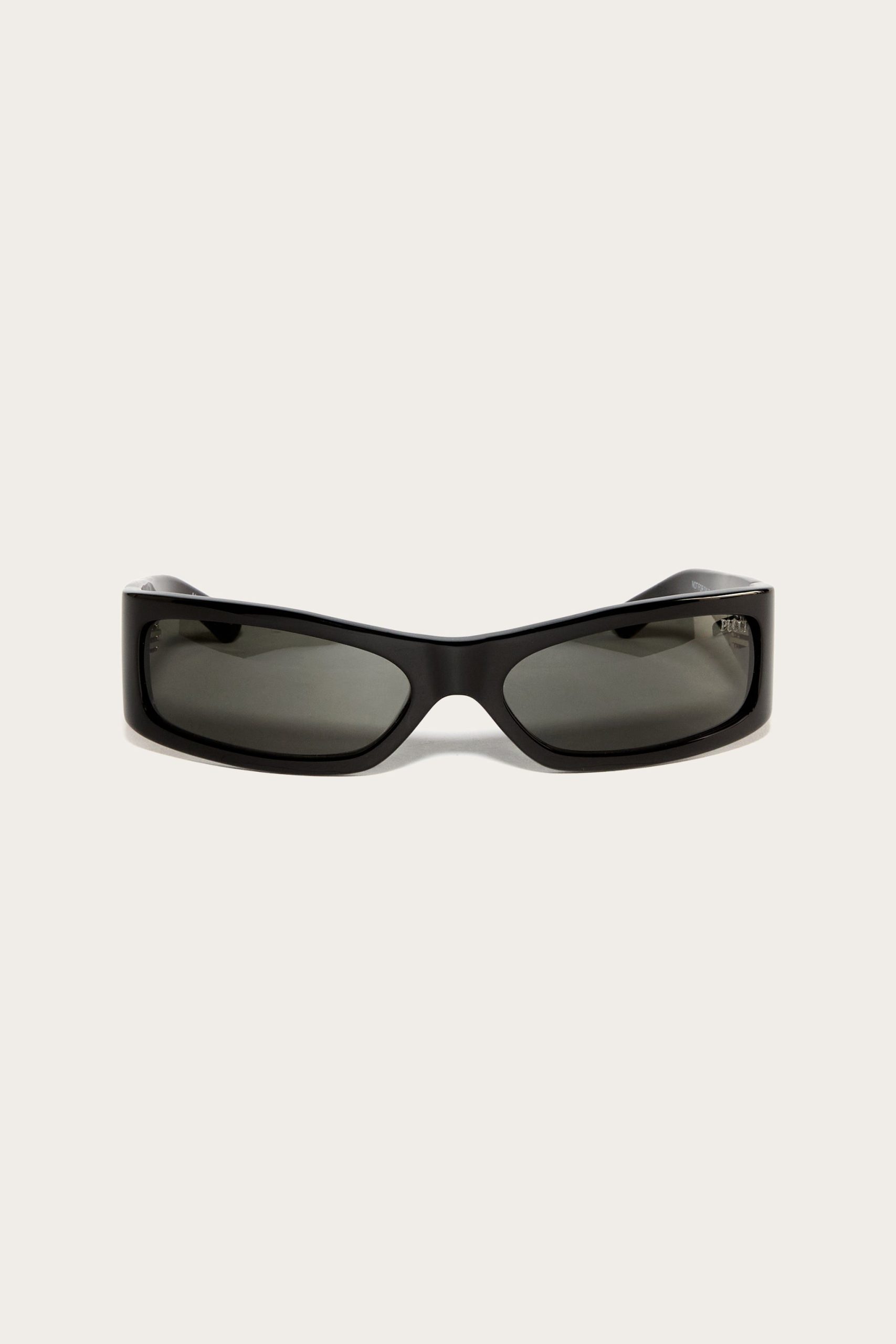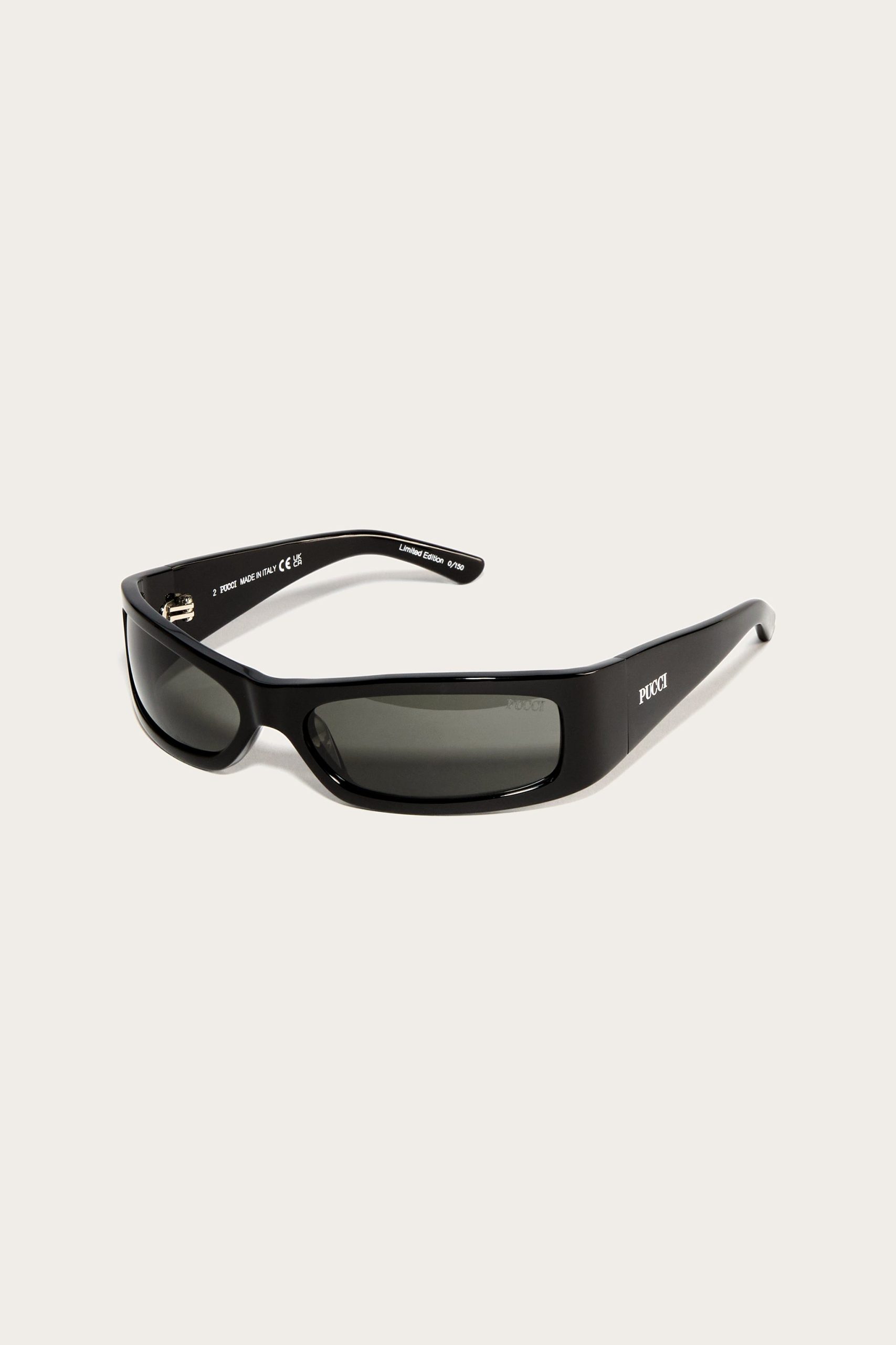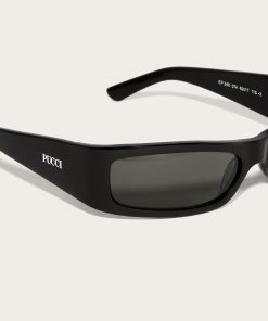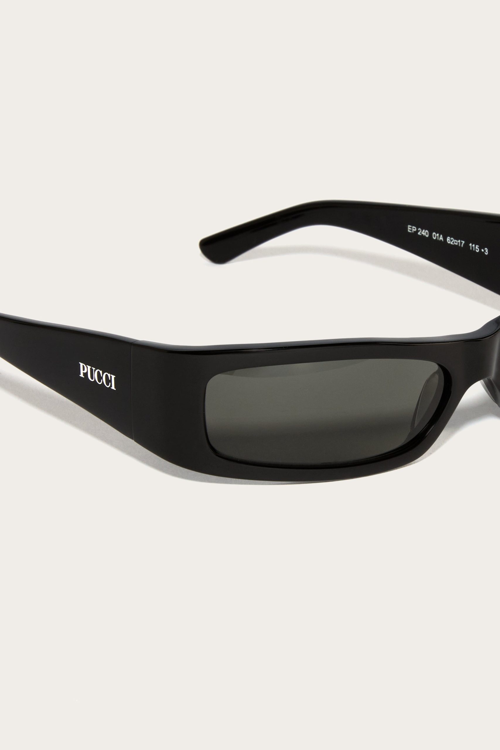 Minimalism and visual impact meet in these rectangular sunglasses, featuring a compact frame in shiny black acetate and dark lenses. The narrow, elongated lines create a marked graphic effect that defines the look with precision and modernity.The metal Pucci logo is applied to the thick temples for a discreet but recognizable touch. An essential and bold accessory, perfect for those who prefer a clean and contemporary aesthetic.