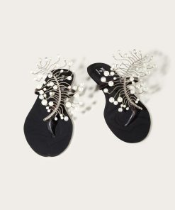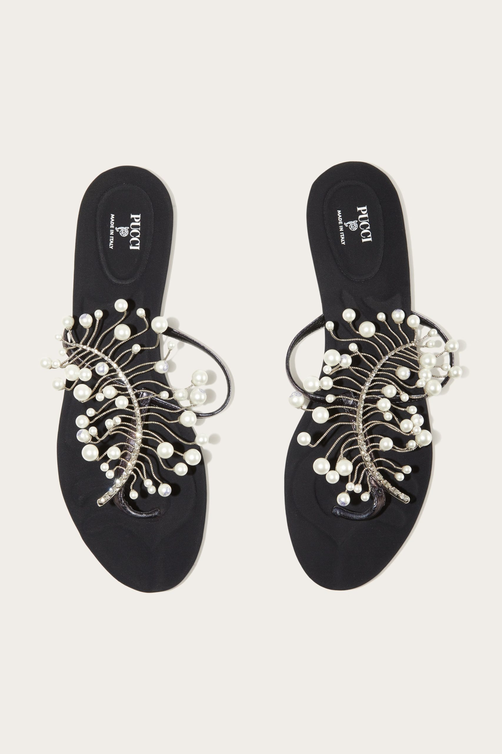 These sandals showcase Pucci’s playful approach to design. They’re elevated with a crystal-embellished feather motif and finished with faux pearls topped with the iconic intertwined fish logo.