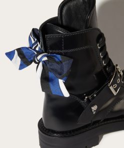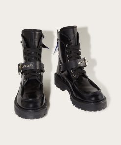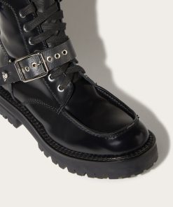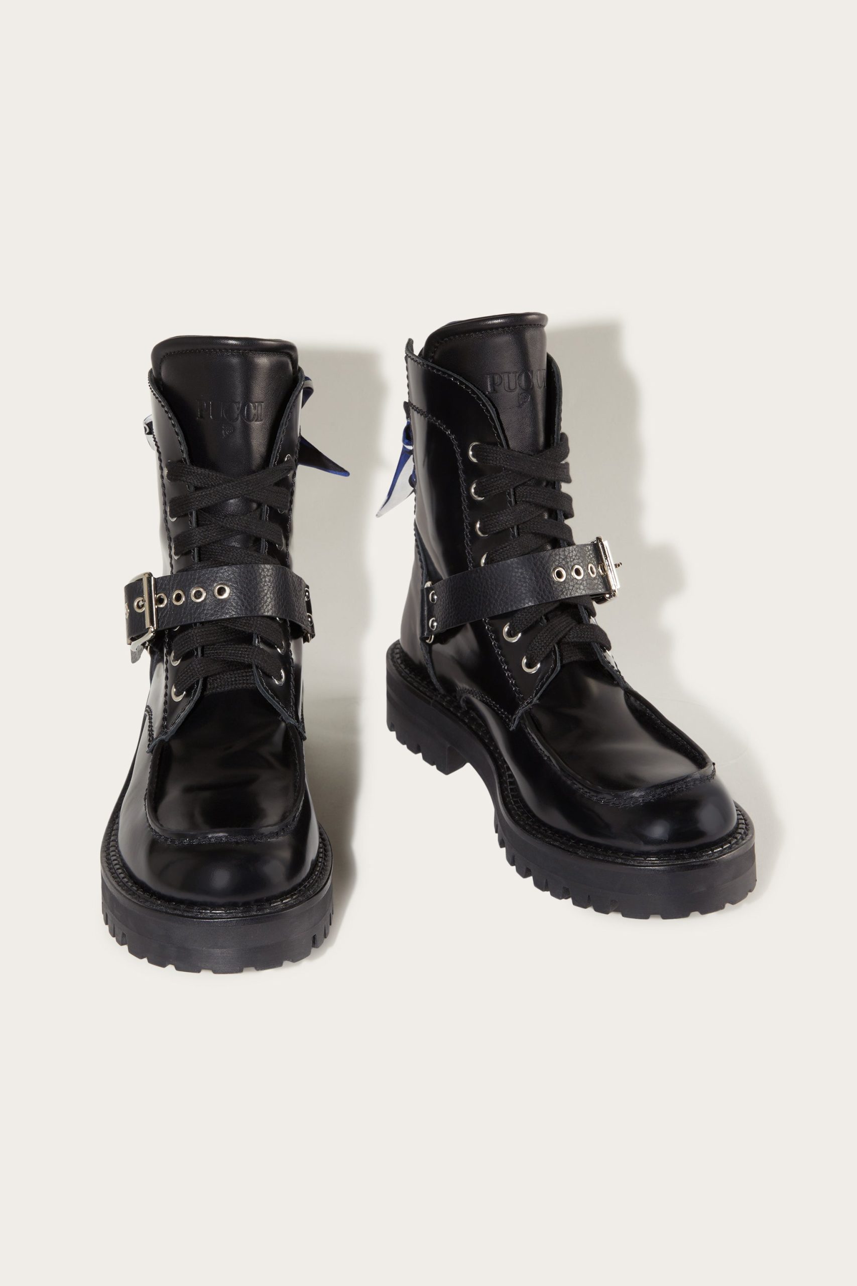 Camille Miceli upholds Pucci’s bold attitude with these boots: they’re fitted with Marmo-print ties at the back for a colourful nod to the house’s storied pattern heritage. The buckled strap, lace-up front and chunky lug sole reference classic combat styles.