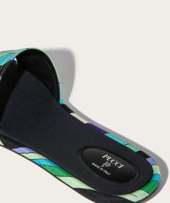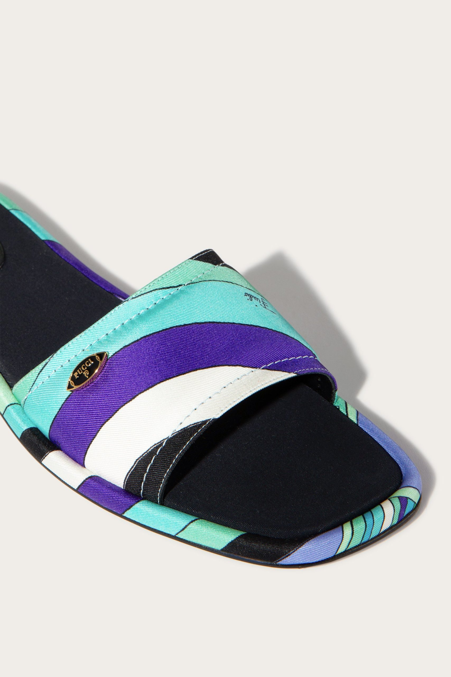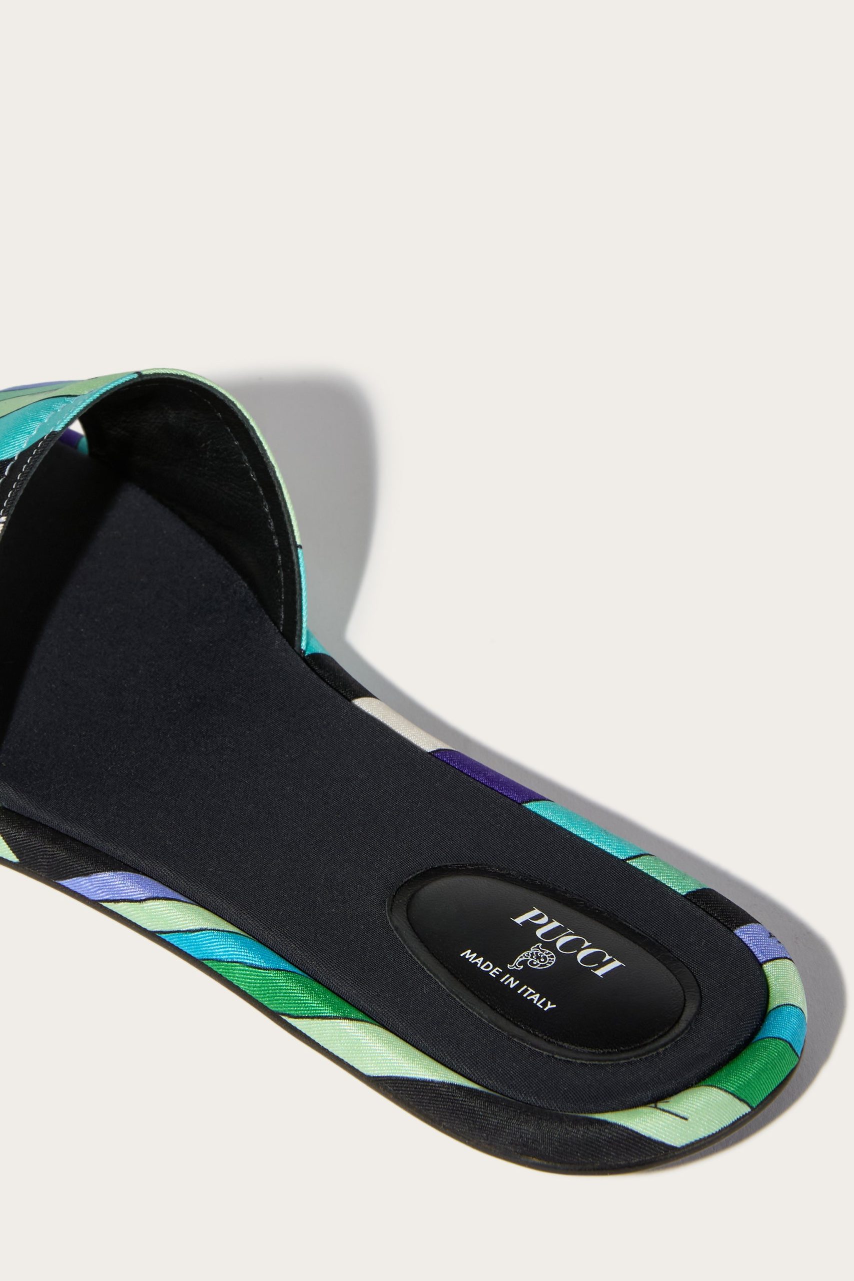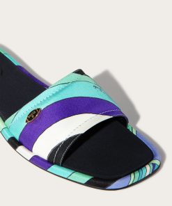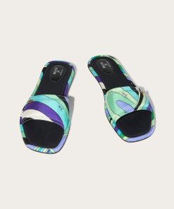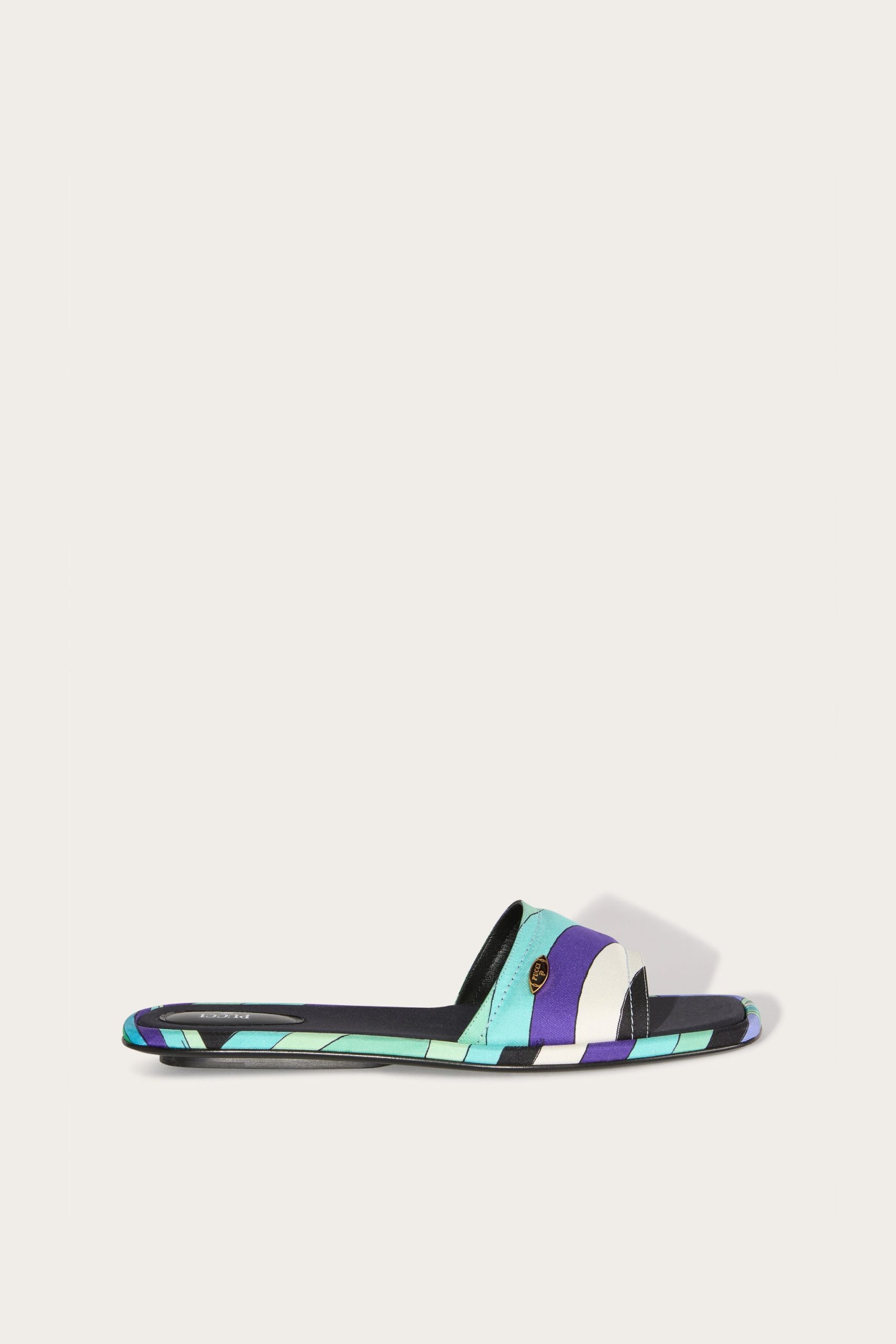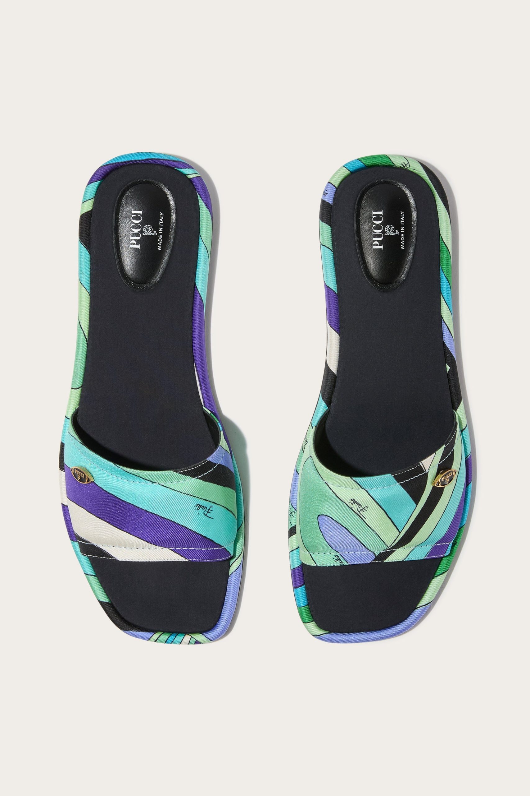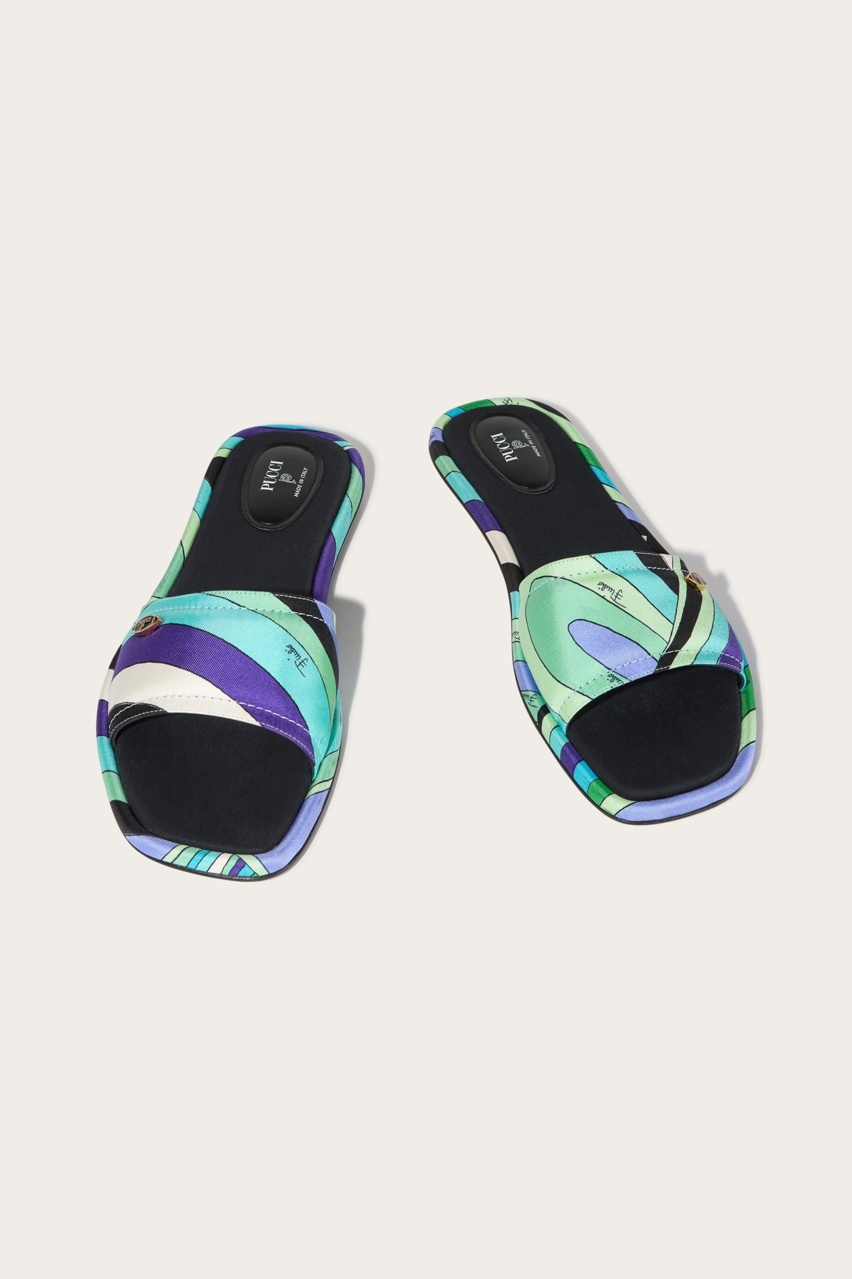 Perfect for a promenade or for adding a touch of elegance to an outdoor aperitif, these silk twill sandals are your ticket to effortless, refined style.The Pucci print in the Iride variant in green and lilac lends vibrancy and femininity, turning a simple sandal into a luxurious accessory.The front band with logo plaque adds a distinctive and sophisticated touch, while the silk twill wraps the foot lightly.