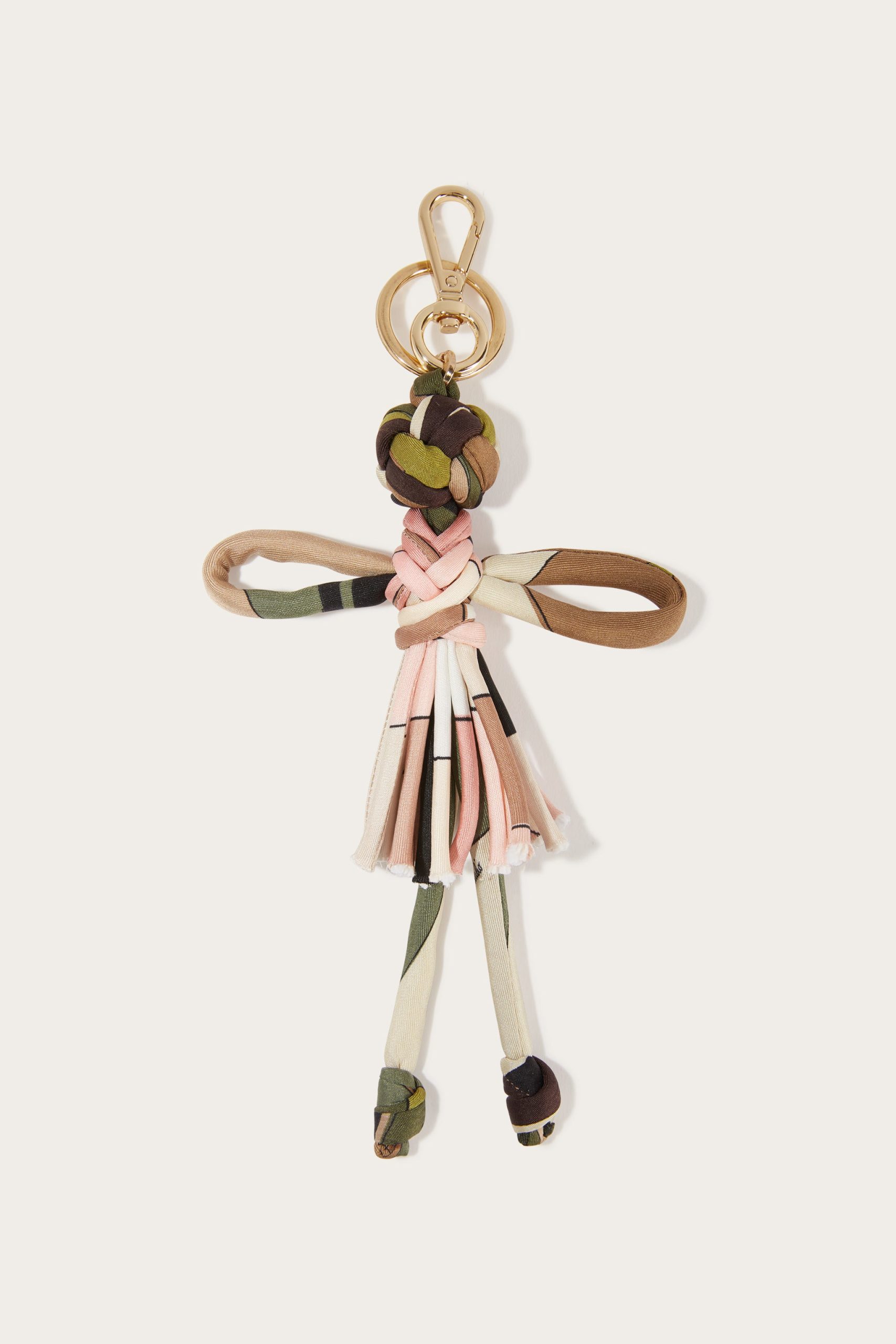 A small detail that encapsulates all of Pucci’s vibrant spirit. This doll keychain is made of woven silk, decorated with the iconic Iride print in refined shades of khaki and nude.Perfect for adding a distinctive touch to keys or as a decorative charm for handbags, it is an accessory that combines craftsmanship and playful design. A true collector’s piece designed for those who love unique and sophisticated details.