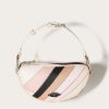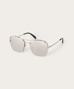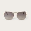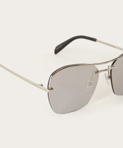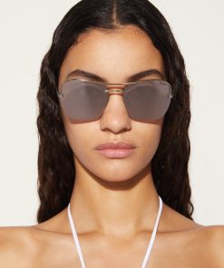 Showcasing a curved metal brow bar and rimless square lenses, these mirror sunglasses highlight Pucci’s directional approach to design. Note the logo at the temple.