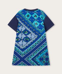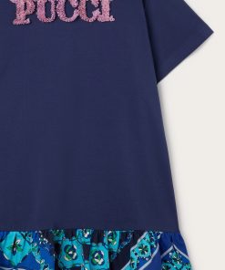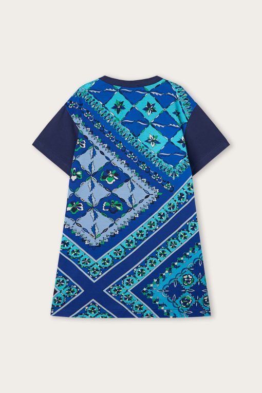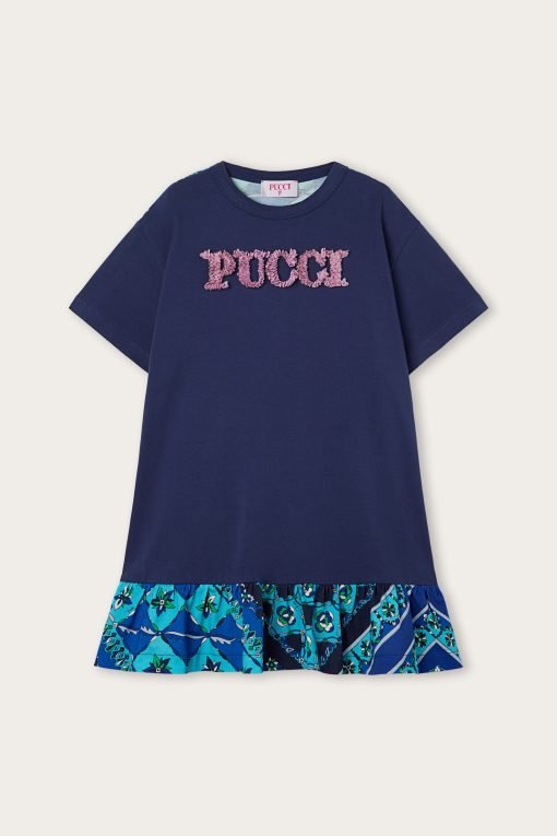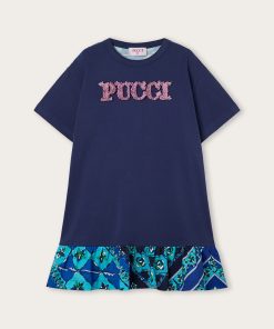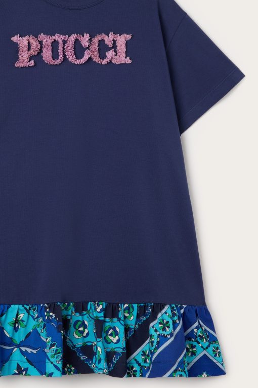 A perfect mix of comfort and fantasy to accompany energy-filled days. This t-shirt dress with short sleeves is ideal for any moment, with a flared skirt that adds movement and lightness.On the front, the embroidered Pucci logo embossed on a solid color background is simple and striking, while the back and hem of the skirt burst with color in one of the brand’s iconic prints: vibrant, cheerful and instantly recognizable.
