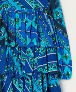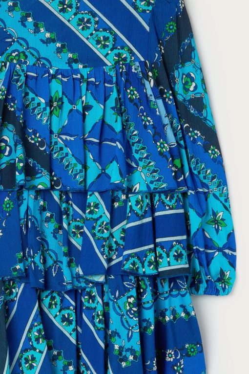 A dress that invites you to move, dance and have fun. This long-sleeved style is made entirely of ruffles, creating a light effect full of movement with every step.The button closure at the back of the neck makes the garment easy to wear, while the blue-tone Festa print makes it unique, vibrant and perfect for any special occasion (or to turn every day into a party).
