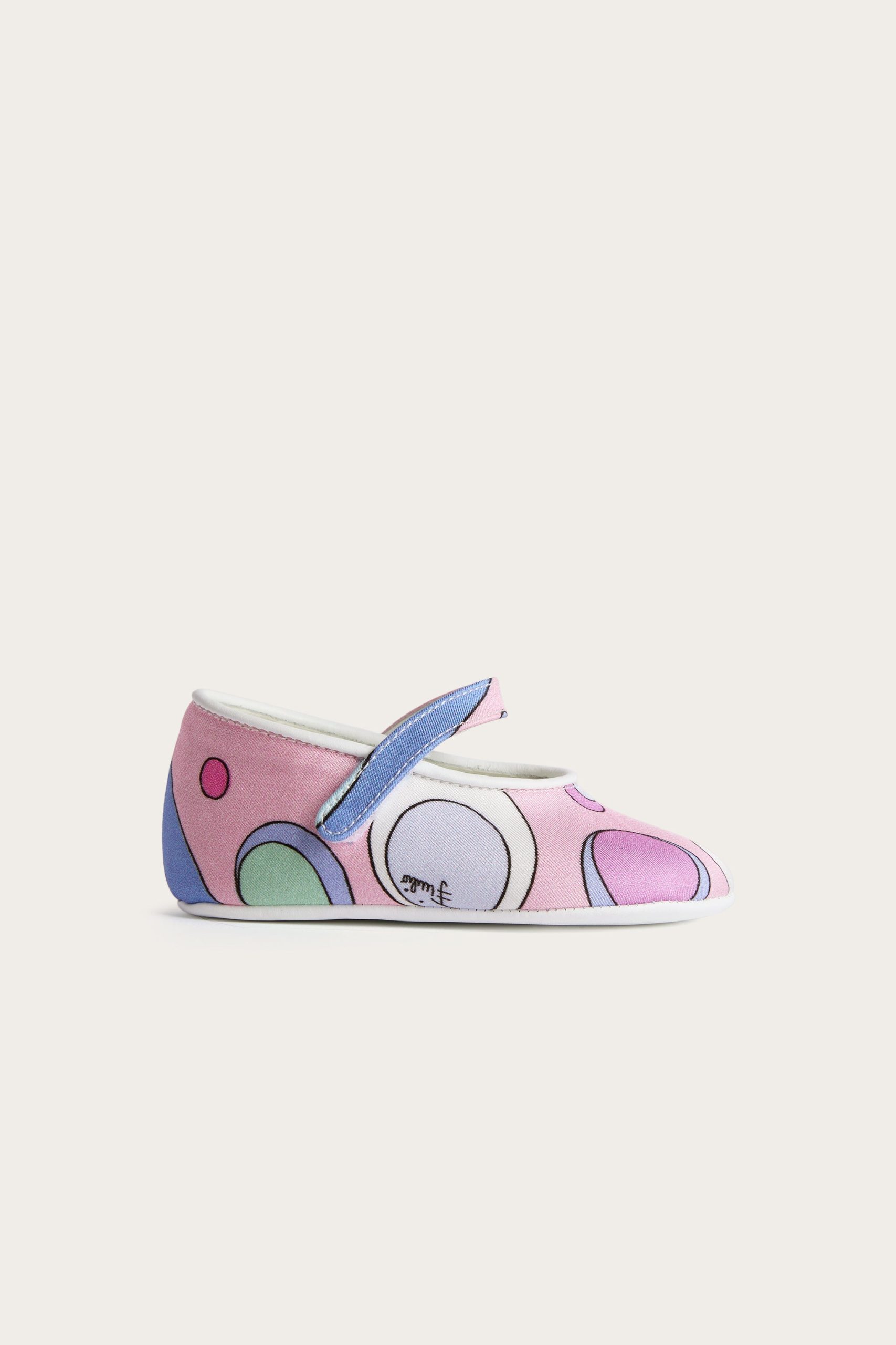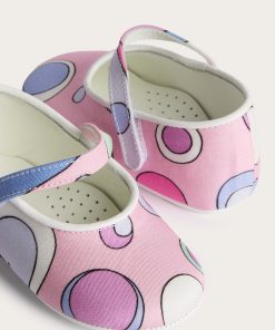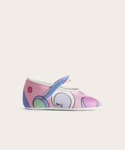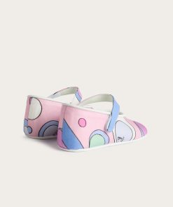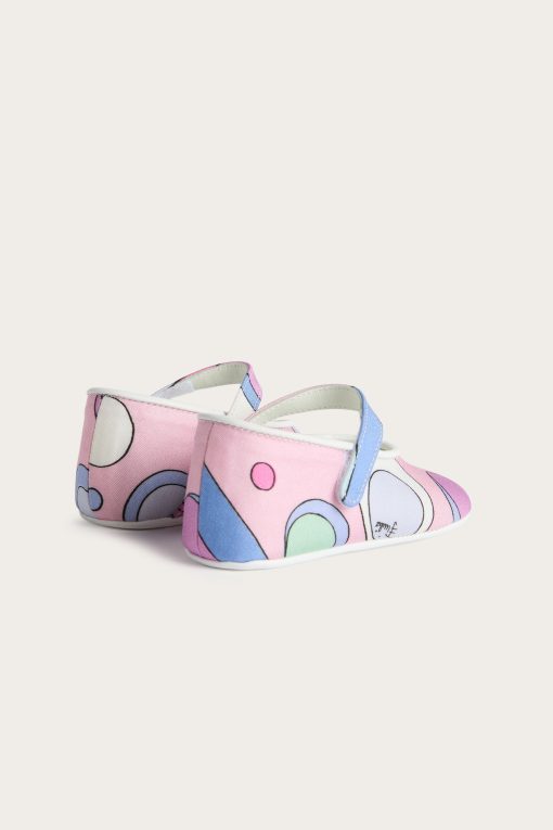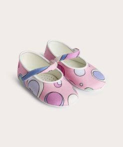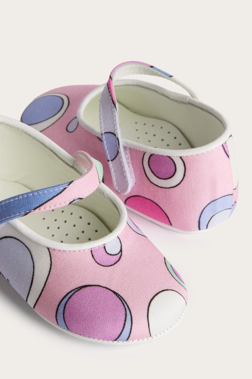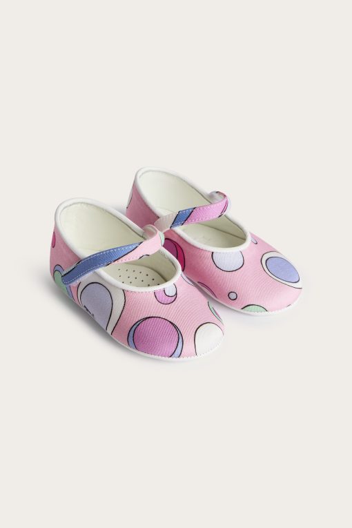 Unmistakable style from the very first steps…These ballerina model shoes are designed to give comfort and sweetness to the smallest feet, with a tender and refined design. The stretch cady fabric wraps delicately, while the Fontane print in pink and multicolor adds a lively and colorful note, typical of the Pucci world.Leather details make the model even more precious, perfect for special occasions or as an unforgettable gift.