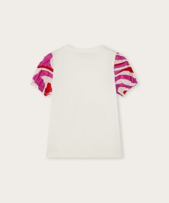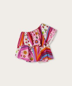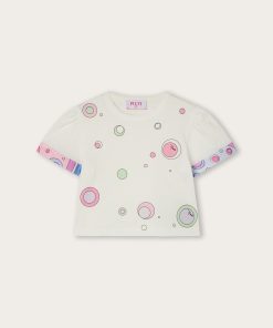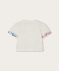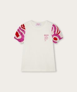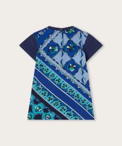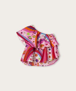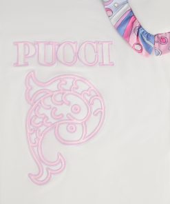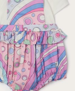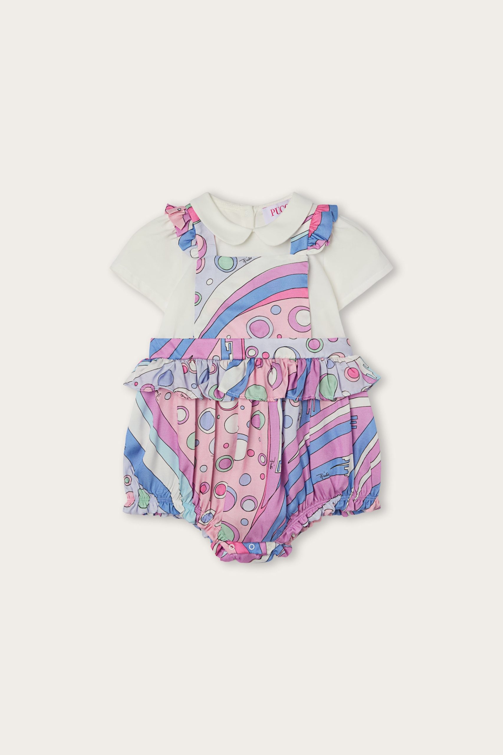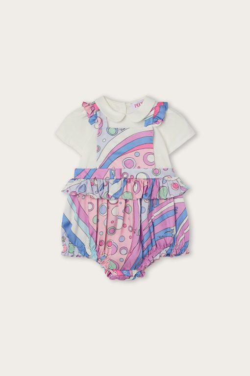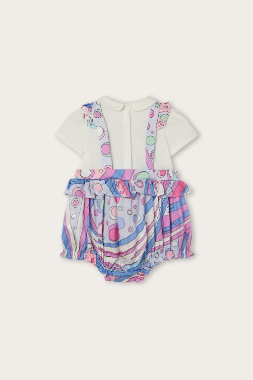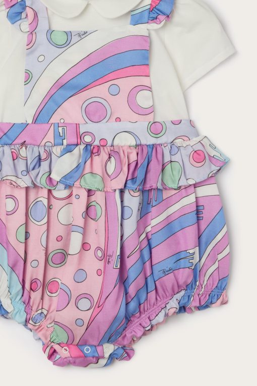 A super sweet look ready to wear. This baby combo romper combines the practicality of a one-piece garment with the charm of a two-piece outfit. The short-sleeved T-shirt with collar is paired with mini dungarees decorated with Fontane’s iconic print in shades of pink and multicolor for a cheerful, sophisticated result.Soft, comfortable and easy to slip on, it’s perfect for first outfits in the Pucci spirit.
