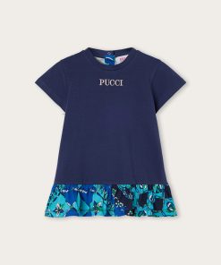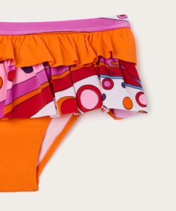 Colorful, comfortable and full of movement. This stretch jersey bikini is perfect for little summer lovers. Decorated with the vibrant Fontane print in orange and multicolor, it is enriched with light ruffles that give a fluttery and fun effect, ideal for days at the beach or pool.A mix of comfort and style signed Pucci, designed to accompany every dive with joy.