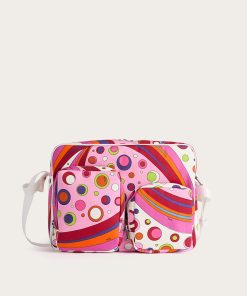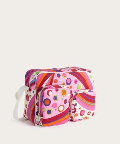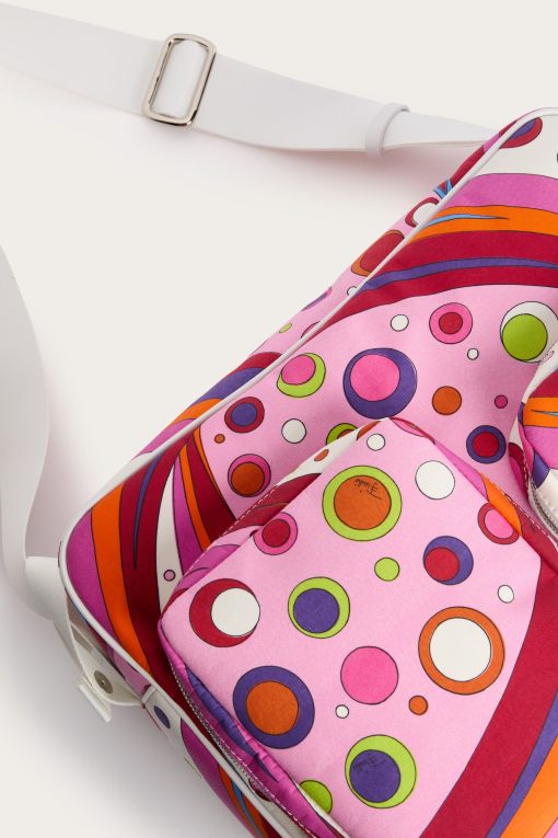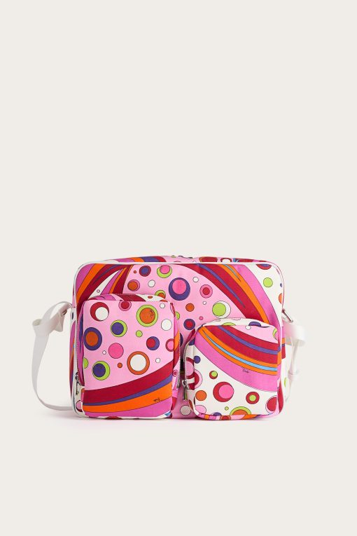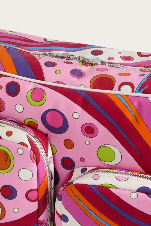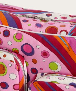 Practical, capacious and definitely stylish. This diaper bag is designed to accompany every move with functionality and a touch of Pucci signature color. Decorated with the Fontane print in shades of orange and multicolor, it combines vibrancy and organization in one essential parenting accessory.With 40 cm handles and a spacious interior, it is perfect as a diaper holder or for carrying all your baby’s necessities with vibrant elegance.