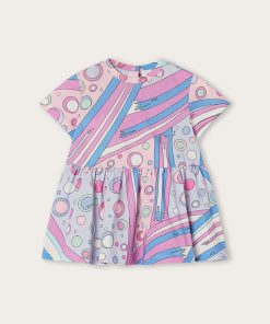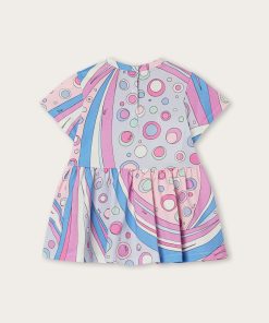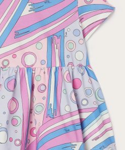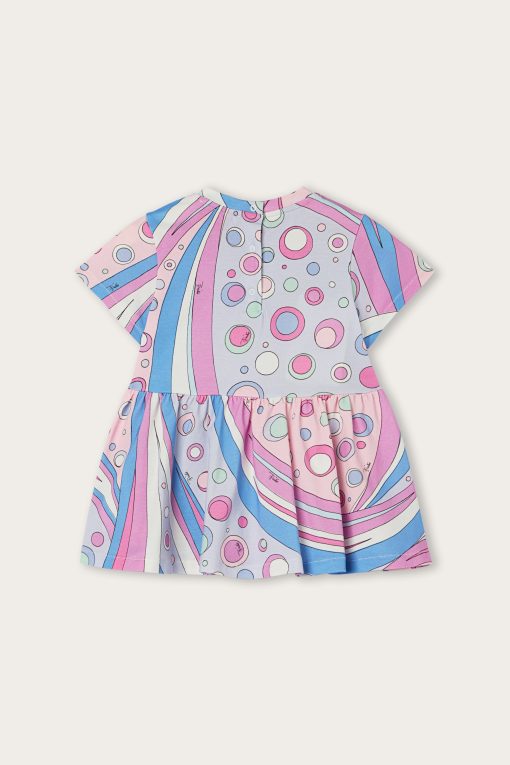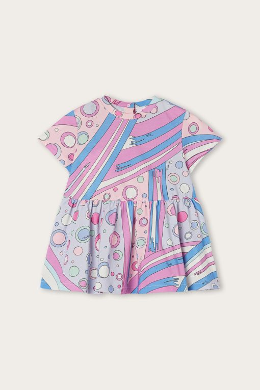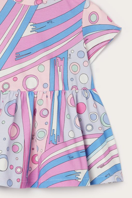 Cheerful on the go: this short-sleeved stretch jersey dress is designed to accompany every moment of the day with comfort and liveliness. The top has an essential line, while the pleated skirt gives volume and lightness, perfect for moving freely.The Fontane print in pink and multicolor dresses the garment with energy and color, with all the graphic dynamism of the Pucci universe in mini format.