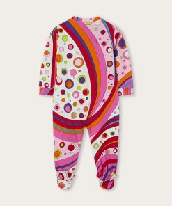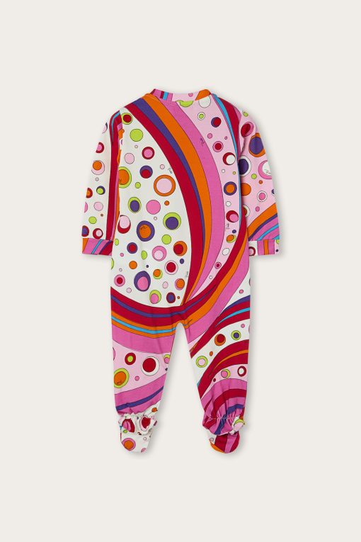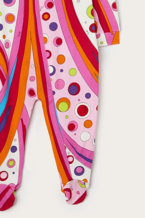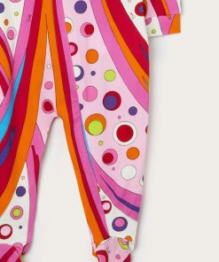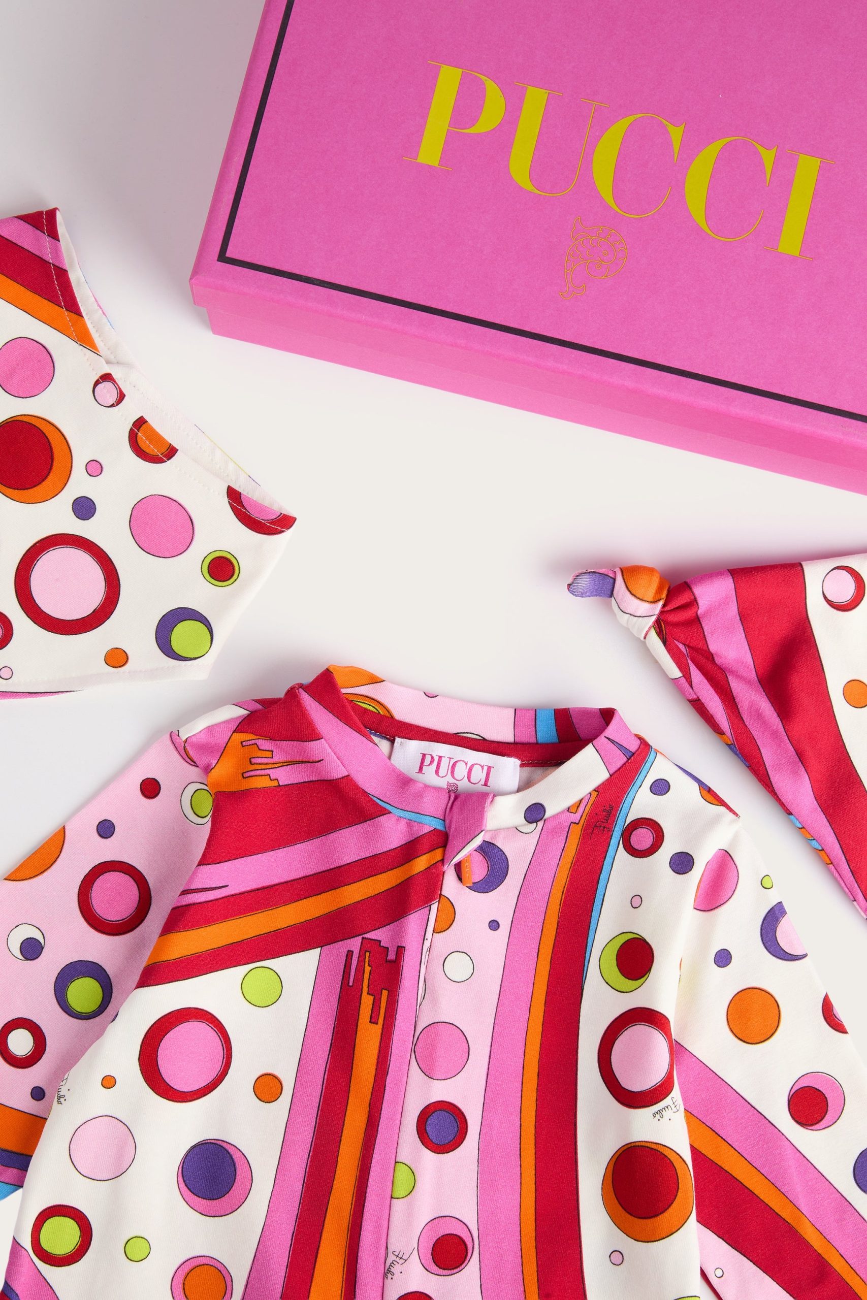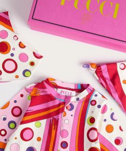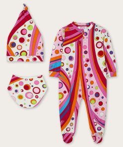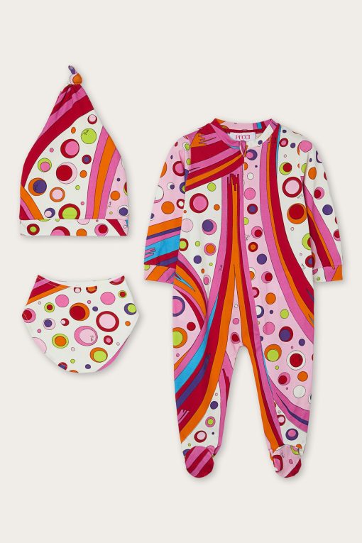 A very sweet set designed to welcome babies in style: this maternity set includes a romper, cap and bib, all made of stretch jersey that is soft and gentle on babies’ skin.The Fontane print in orange and multicolor embellishes all the accessories with the unmistakable Pucci touch, for a first outfit that is tender, comfortable and full of personality.