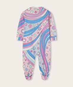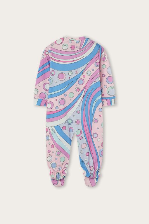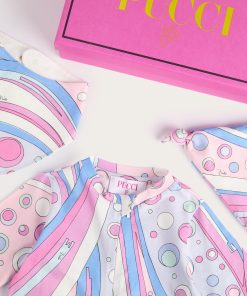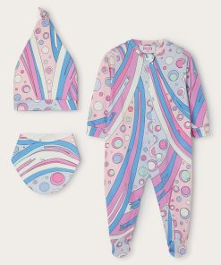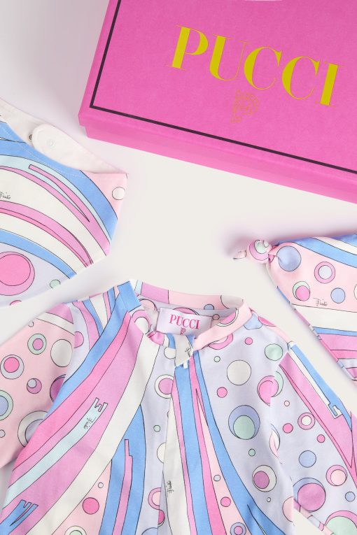 A very sweet set designed to welcome babies in style: this maternity set includes a romper, cap and bib, all made of stretch jersey that is soft and gentle on babies’ skin.The Fontane print in pink and multicolor embellishes all the accessories with the unmistakable Pucci touch, for a first outfit that is tender, comfortable and full of personality.