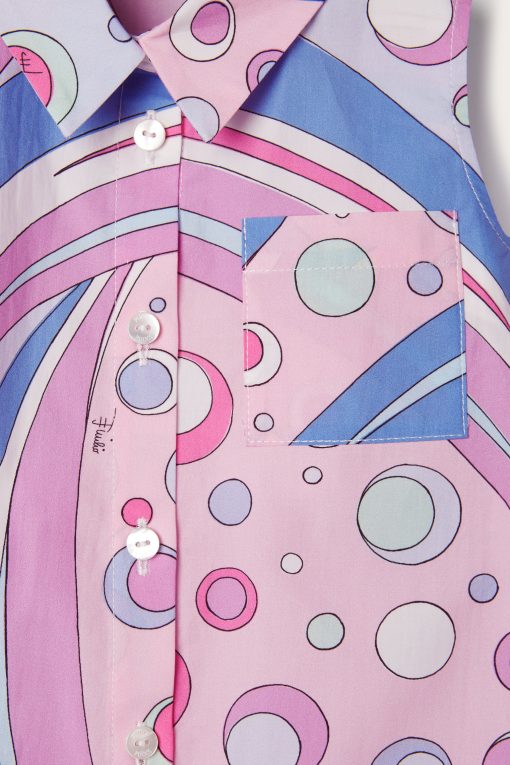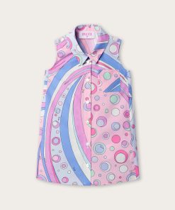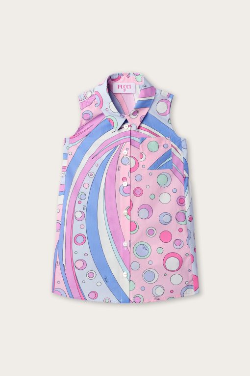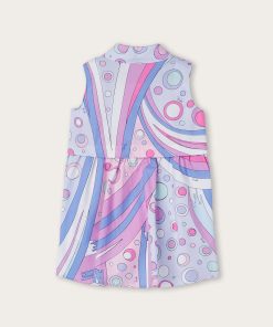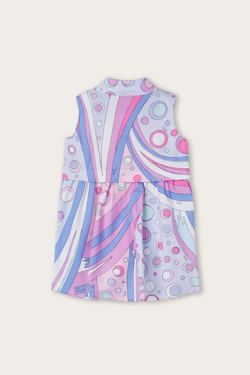 Cool, comfortable and full of color, this cotton dress is decorated with the vibrant Fontane print in pink and multicolor to bring Pucci’s playful spirit to the little ones’ wardrobe.The sleeveless design is completed with a full-length button closure and a small front pocket, perfect for storing small treasures. A lightweight and versatile garment, ideal to wear alone or over a T-shirt.