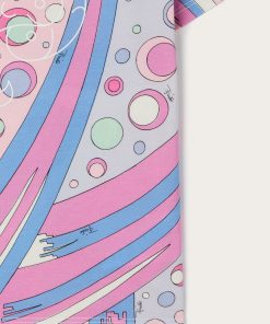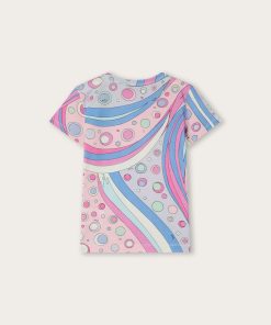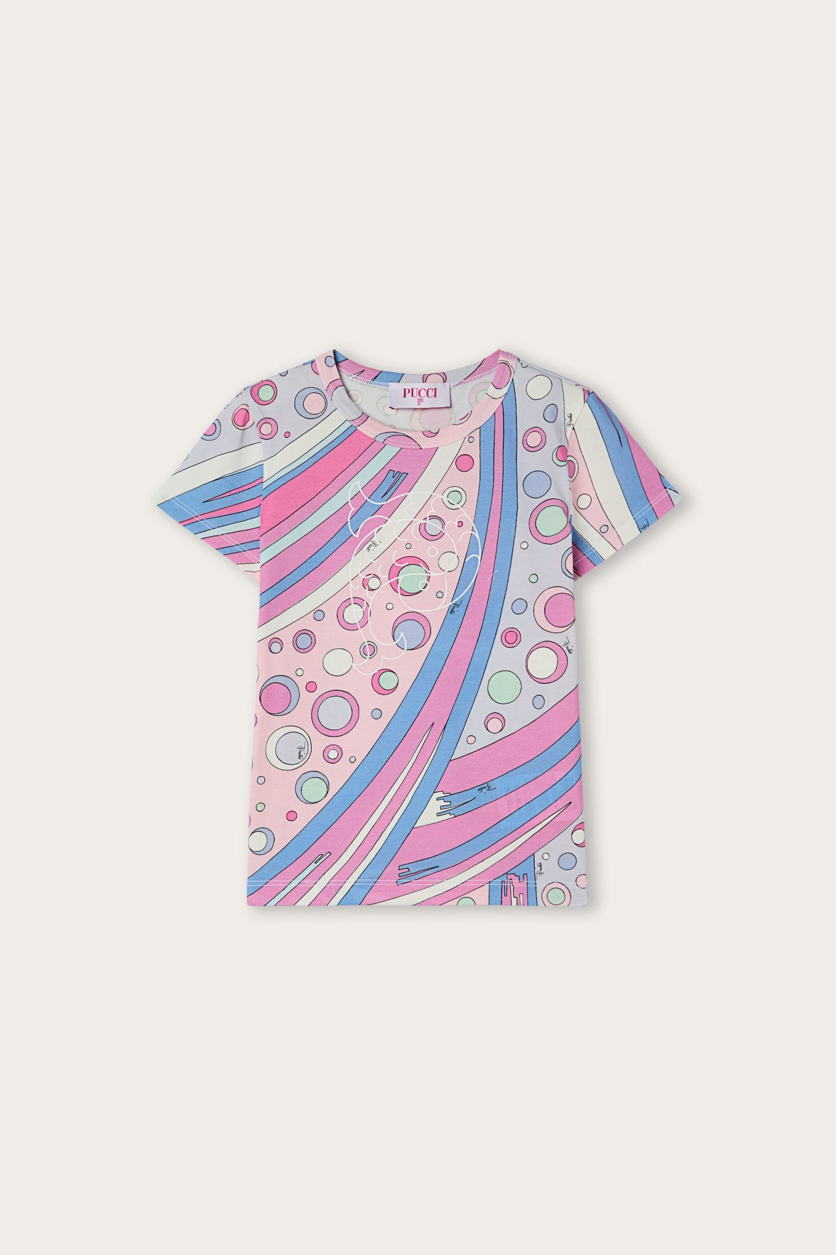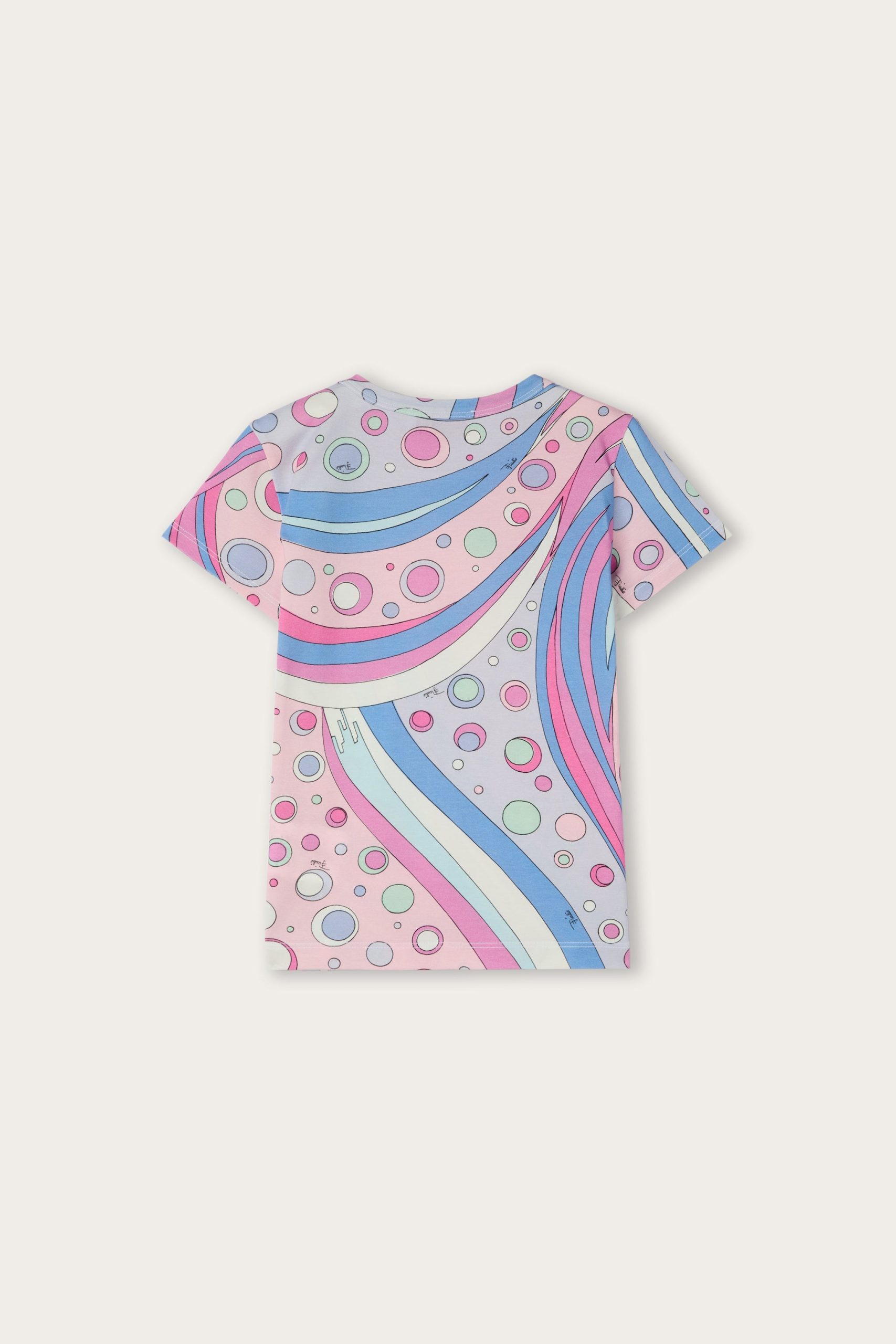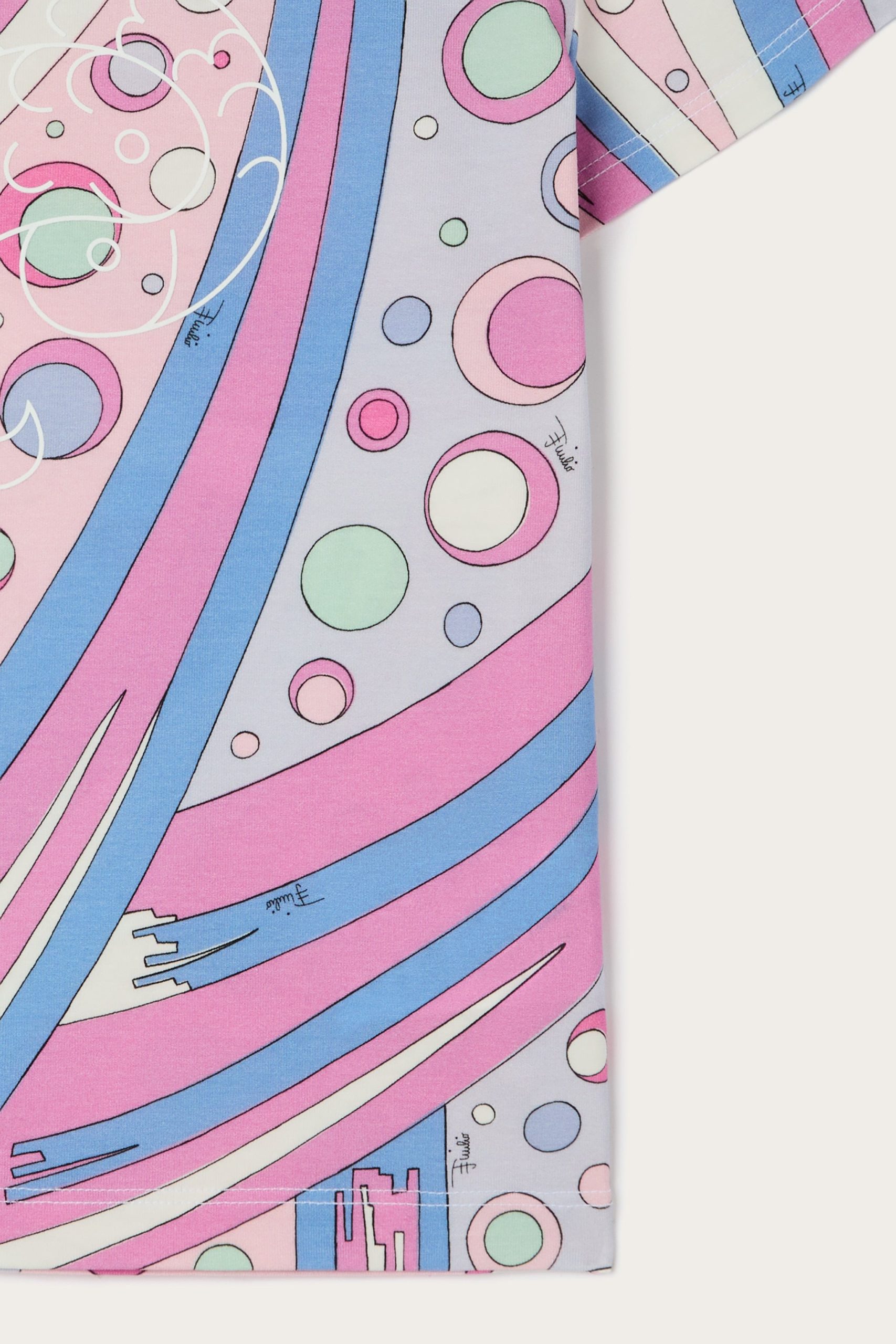 An explosion of color and movement in pure Pucci style. This short-sleeved T-shirt is entirely decorated with the Fontane pattern in shades of pink and multicolor, for a dynamic and cheerful look.In the center, the iconic Pucci fish appears in “negative” effect, creating a graphic contrast that makes the garment unique and instantly recognizable.