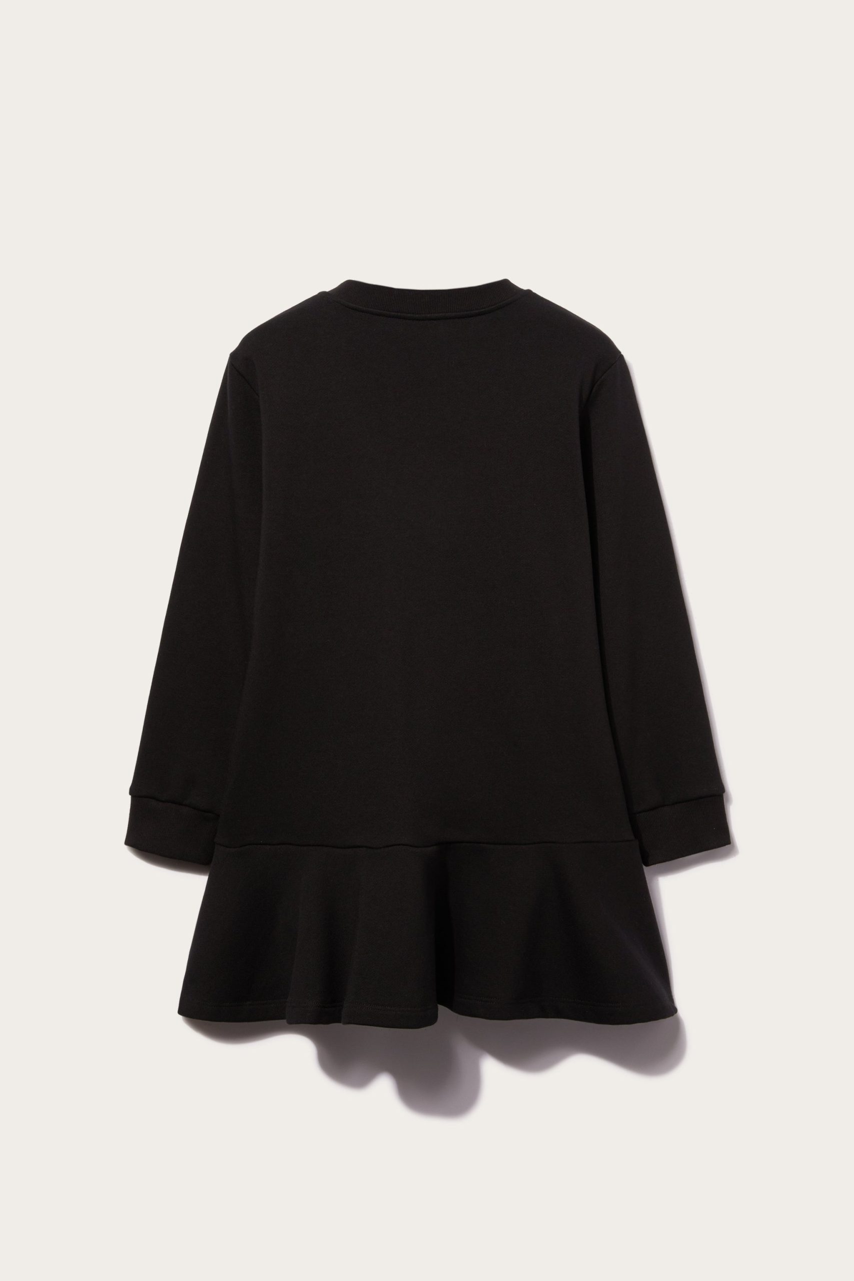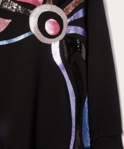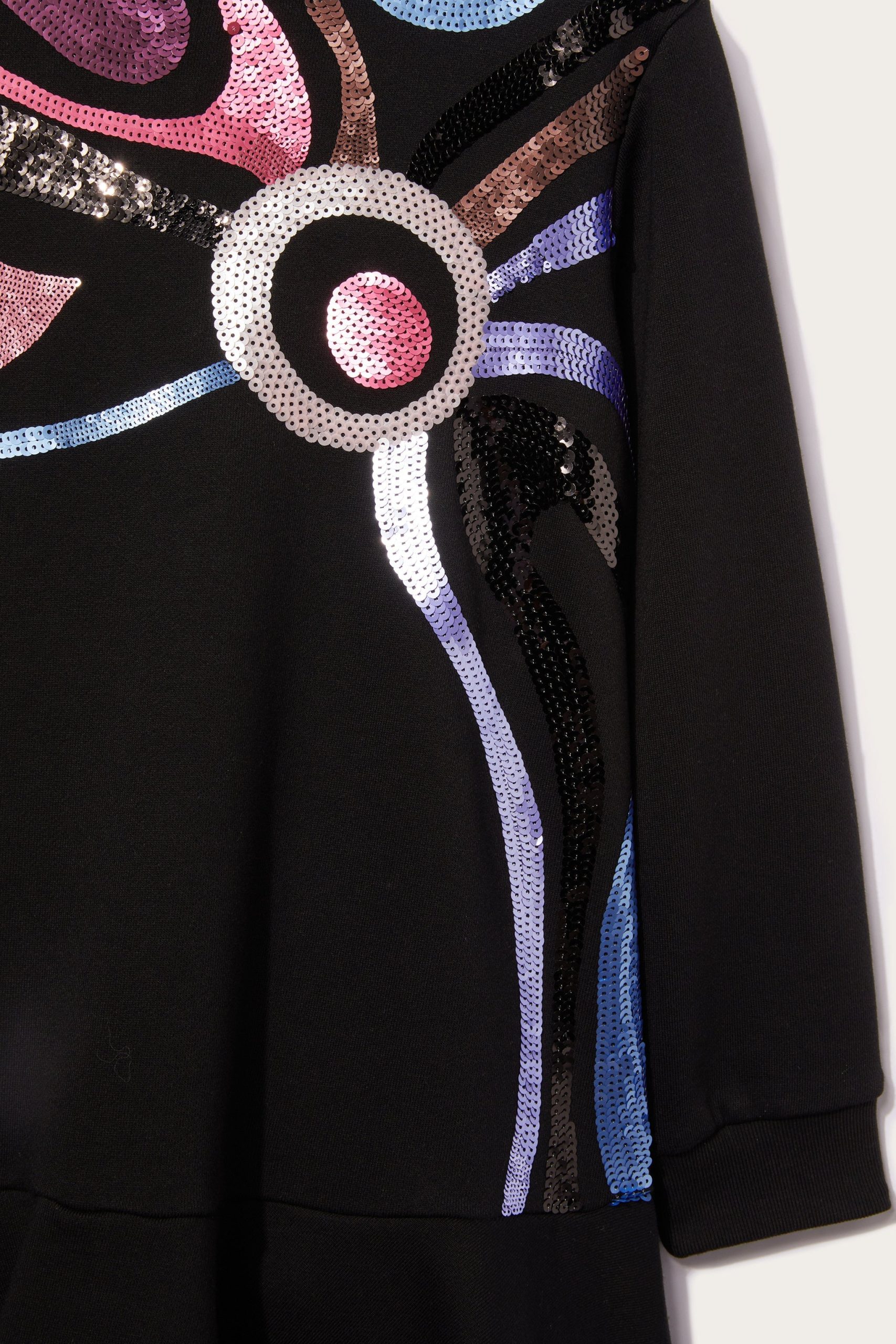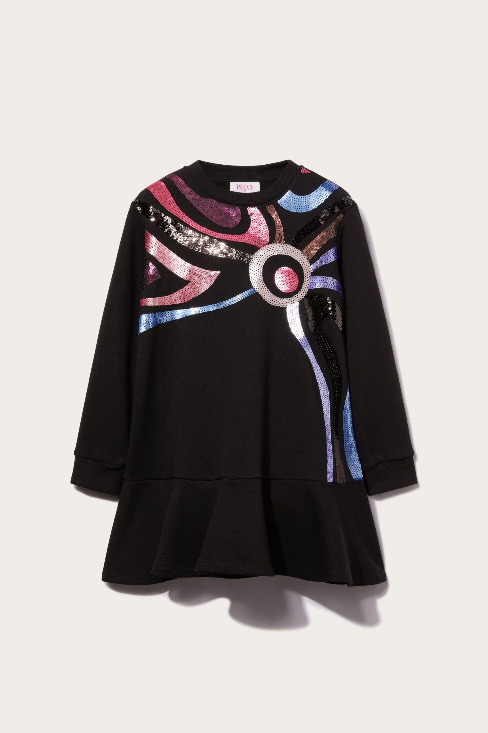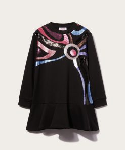 This black dress is a testament to Camille Miceli’s youthful design direction. The front is adorned with a stunning array of multicolour sequins, expertly arranged to mimic the archival Marmo print.