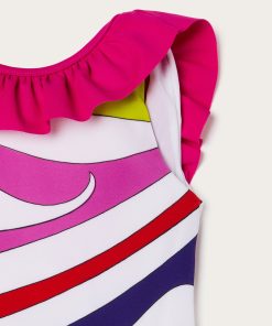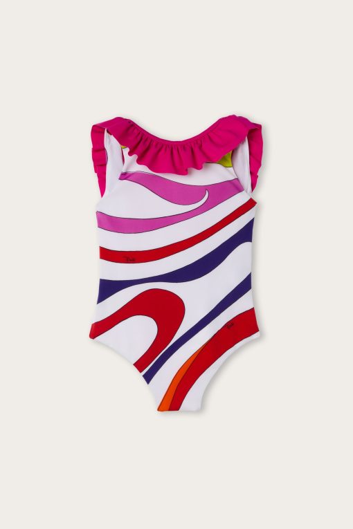 Perfect for little ones who love color and movement, this stretch jersey one-piece swimsuit is decorated with the iconic Marmo print in shades of ivory and orange for a cheerful, sunny look.Romantic ruffles on the neckline and back add a playful touch, making it even more special for beach or pool days.