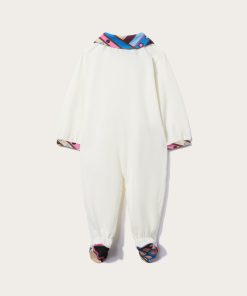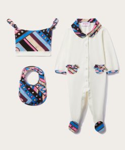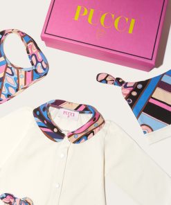Embodying Pucci’s playful vision, this babygrow set boasts small fragments of the Vivara print, which infuses it with cheerful bursts of colour. It’s crafted from soft stretch cotton and comprises a hat, bib and matching onesie.