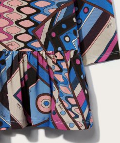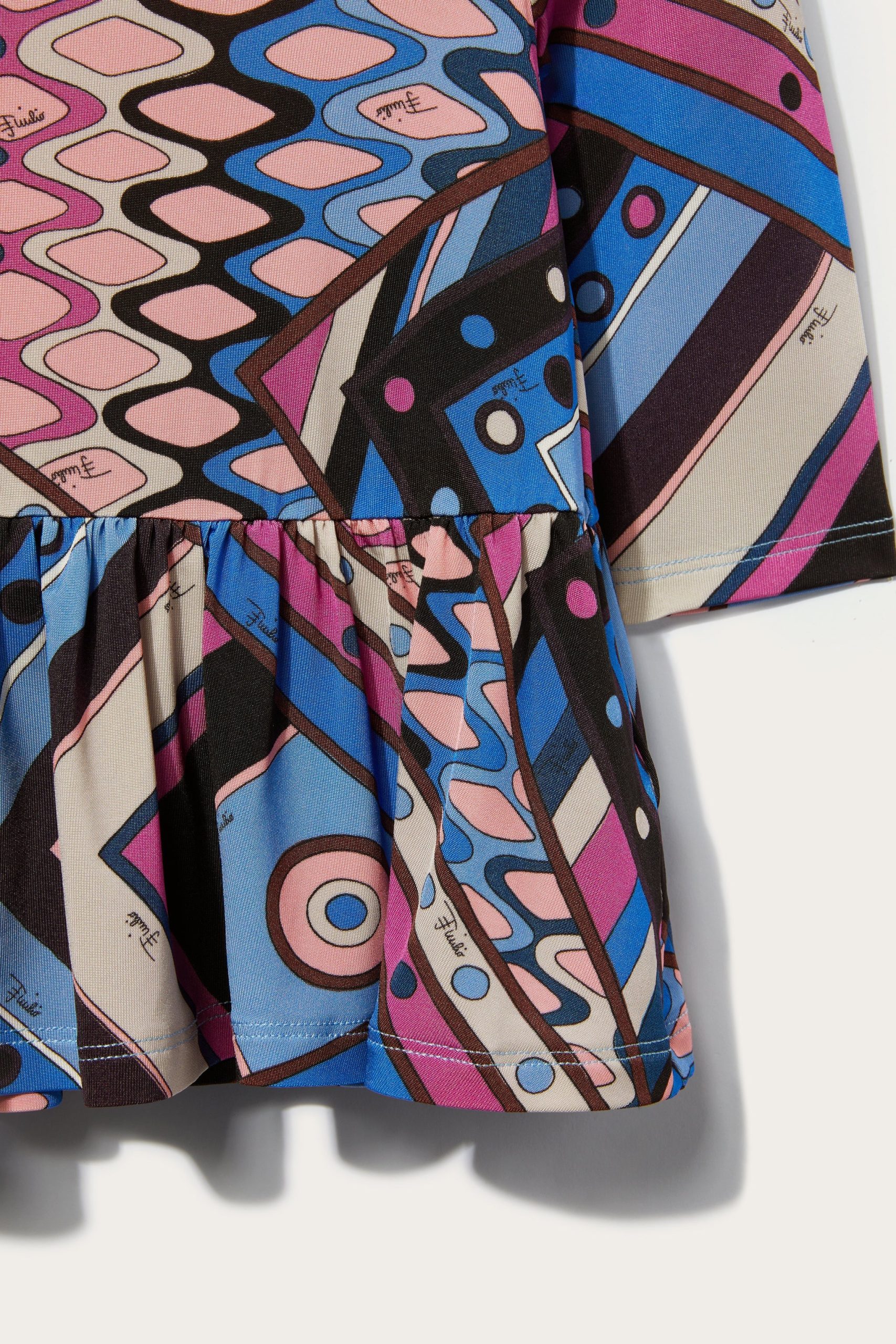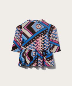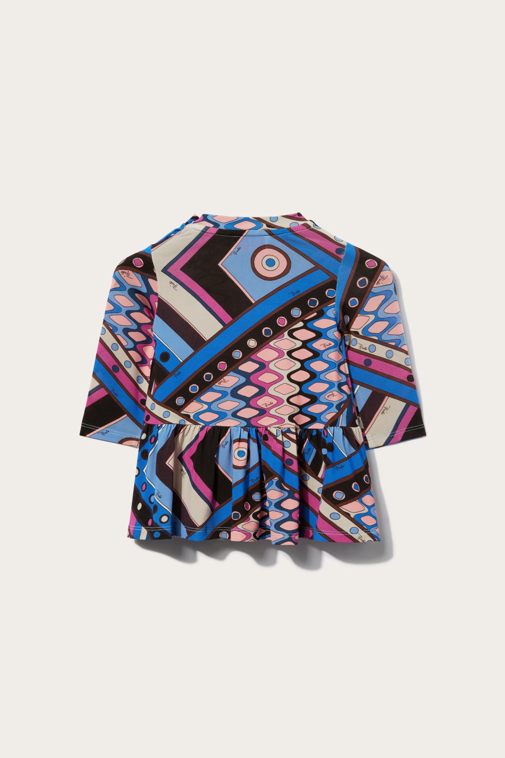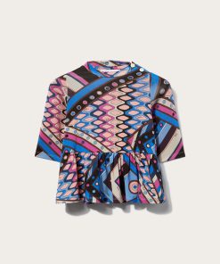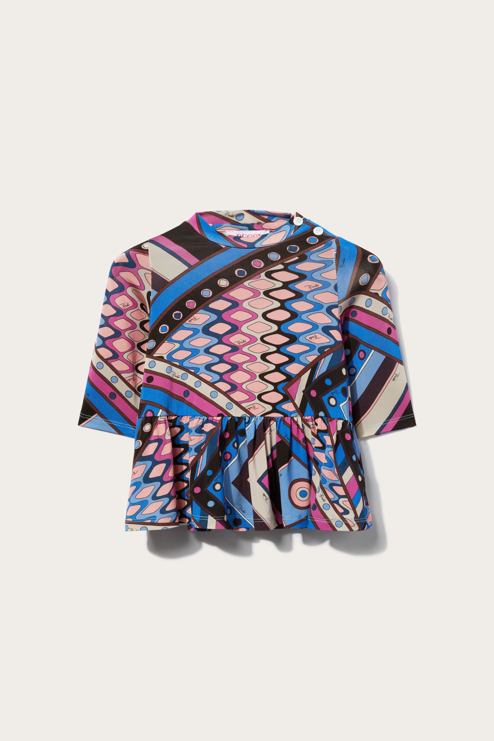 A testament to Pucci’s signature pattern play, the geometric motifs of the Vivara pattern decorate this top in a kaleidoscope of colours. It falls to a peplum hem, enhancing its charming appeal.