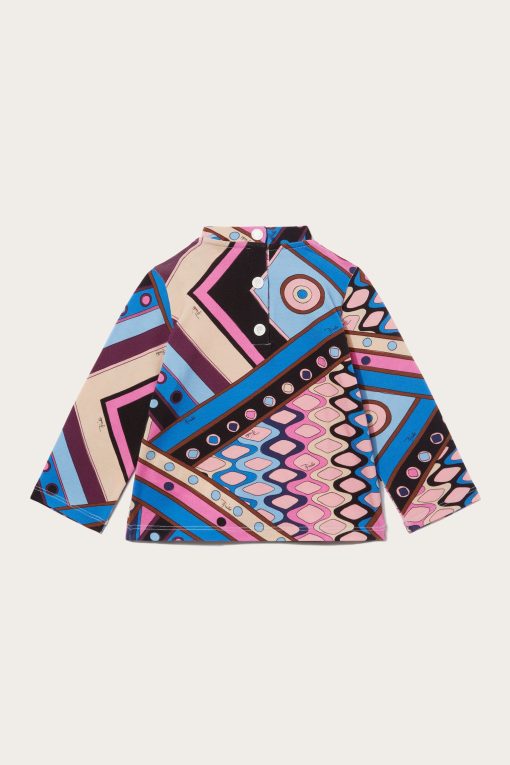 This top offers a fresh interpretation of Pucci’s Mediterranean legacy by combining signature motifs. The Vivara print imbues it with bold hues, while the intertwined fish logo adorns the front.