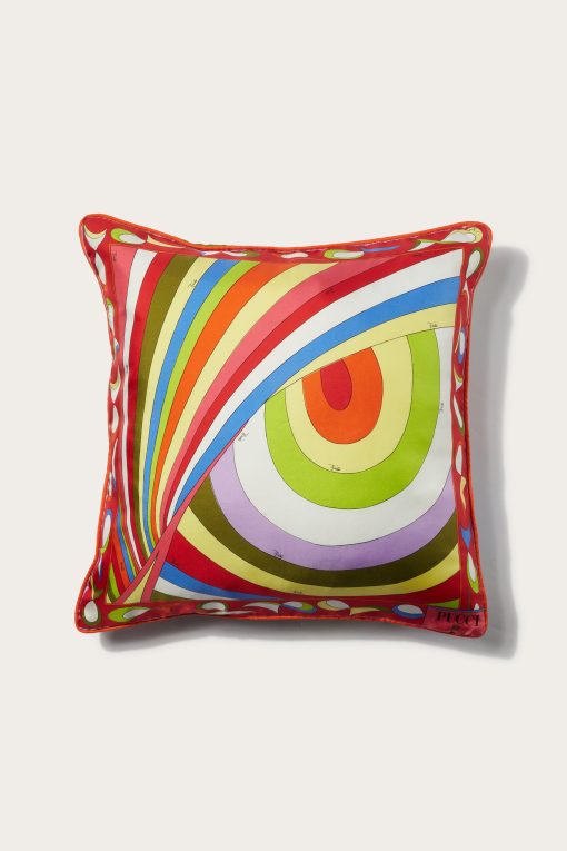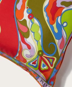 Camille Miceli puts Pucci’s cheerful design direction on full show with silk-twill cushion: it’s covered with the opulent Orchidee and Iride prints in technicolour hues.