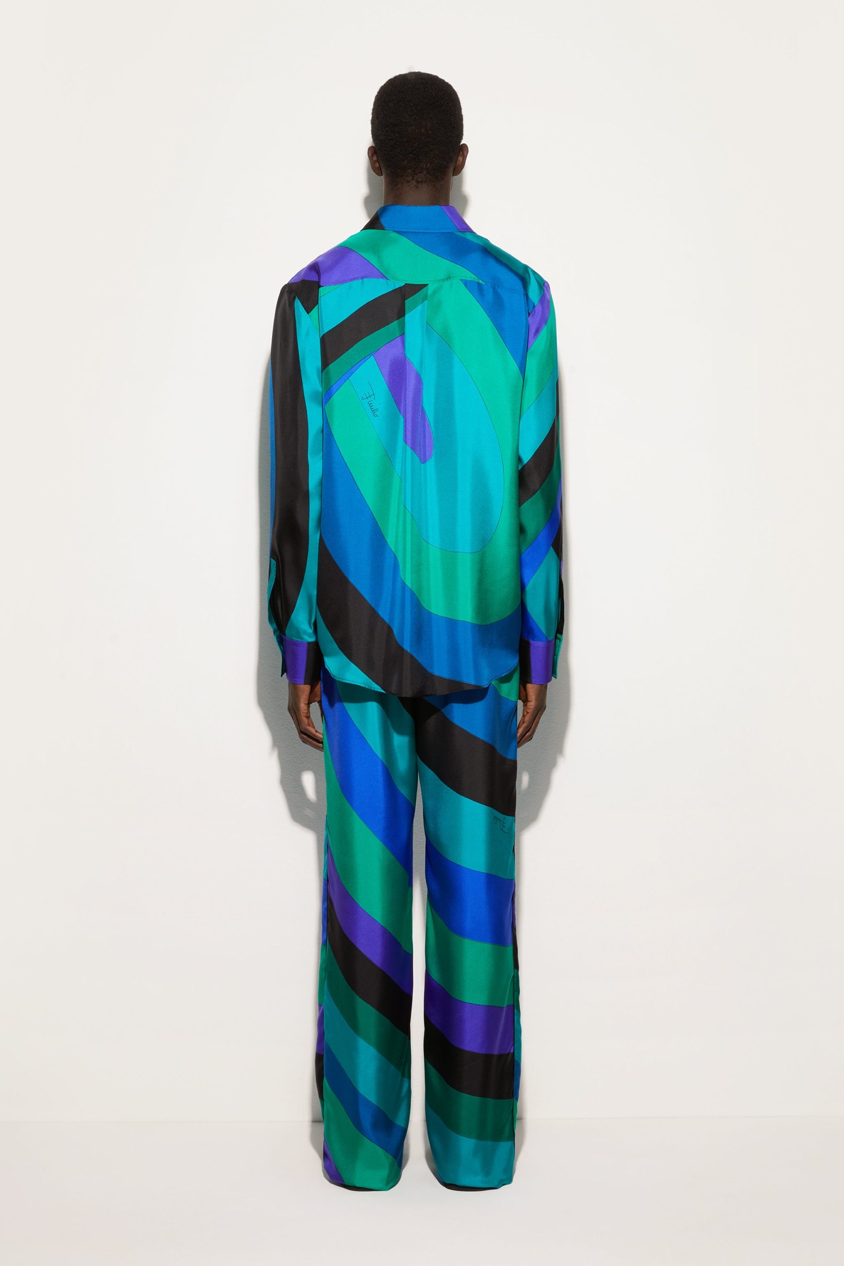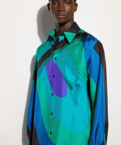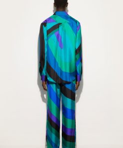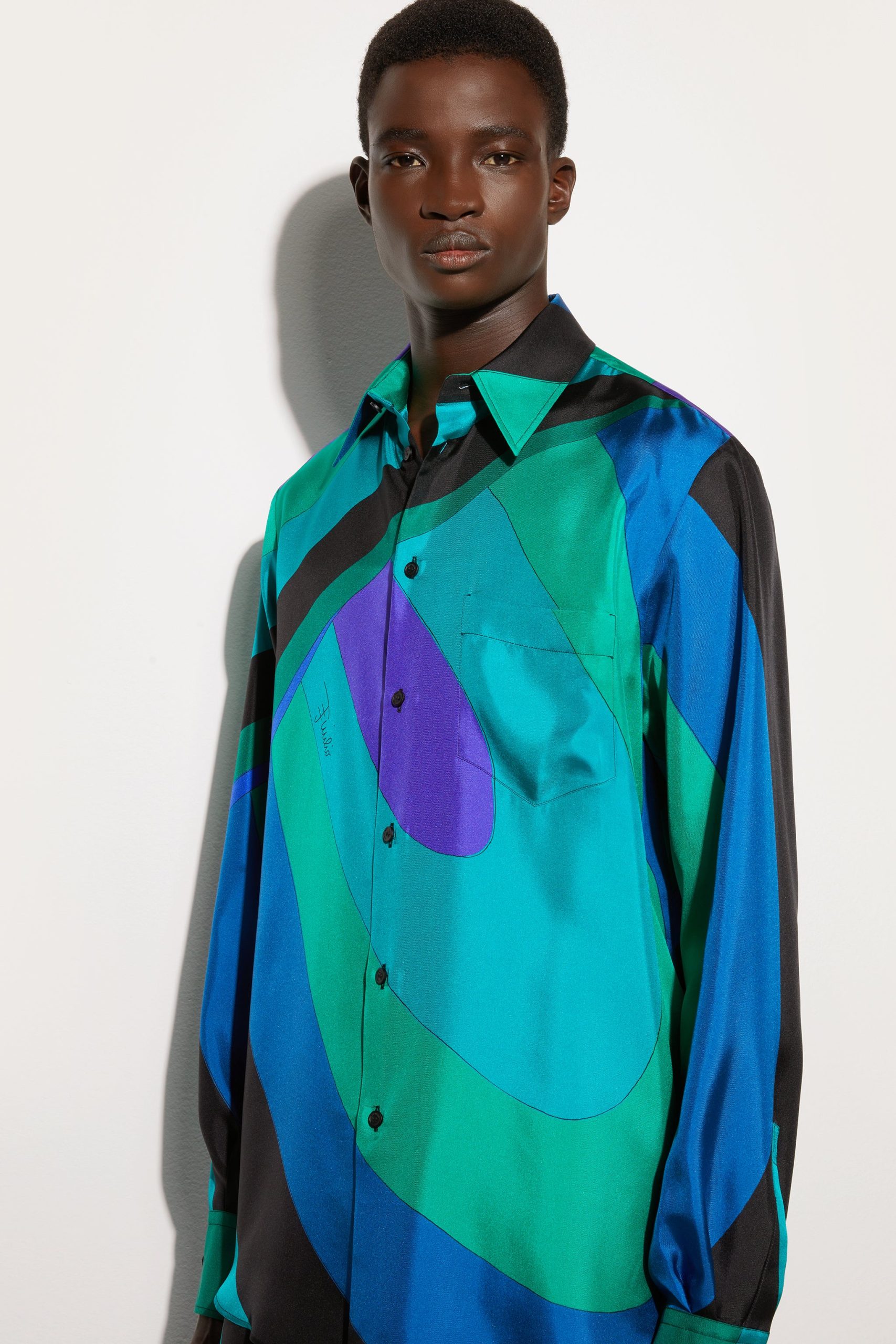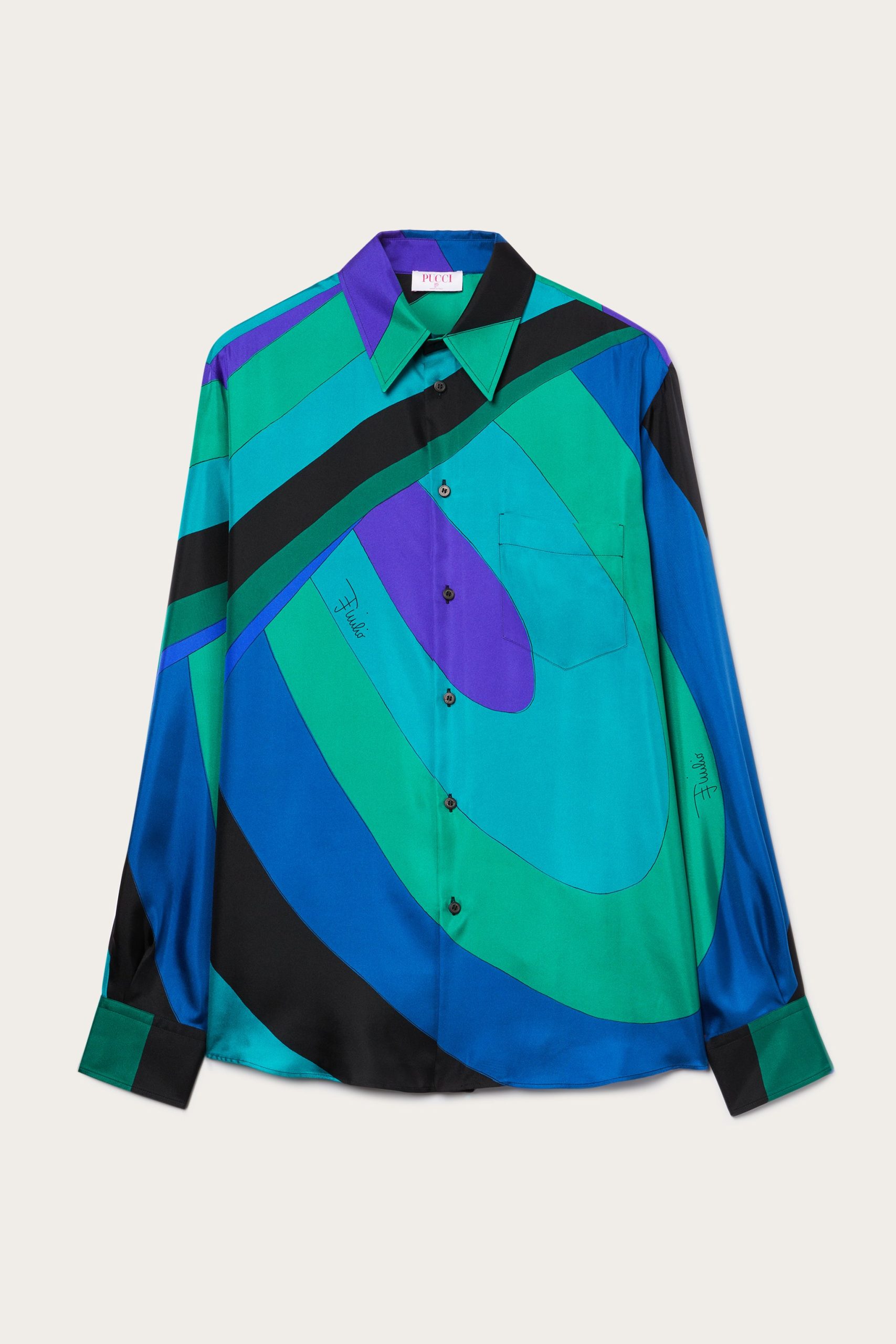A modern interpretation of genderless elegance. This oversized long shirt, with its fluid and comfortable cut, is designed to fit naturally into any wardrobe. The versatile design makes it perfect for wearing in both menswear and womenswear, while cufflinks-ready cuffs add a sophisticated detail. The emerald Iride print enhances its dynamism, lending character and sophistication to any look.