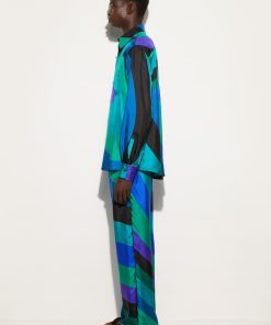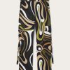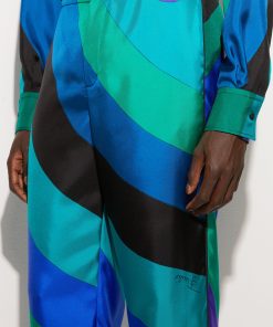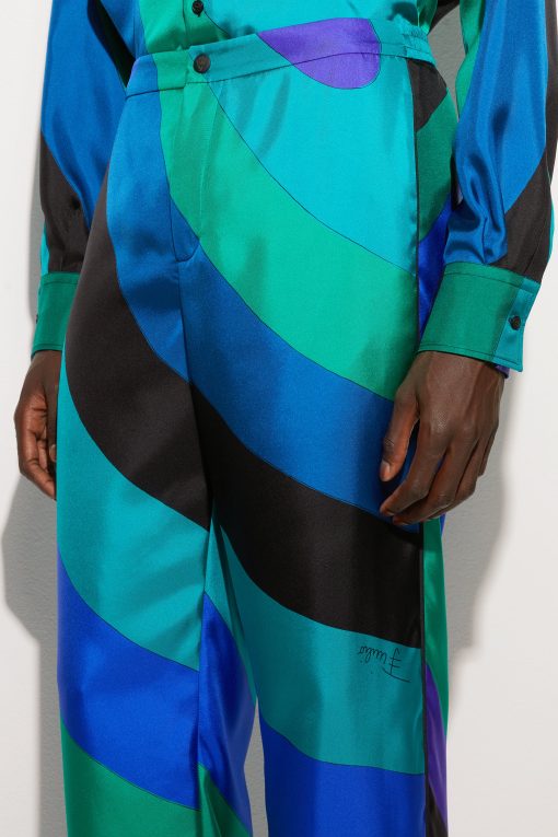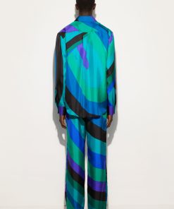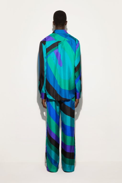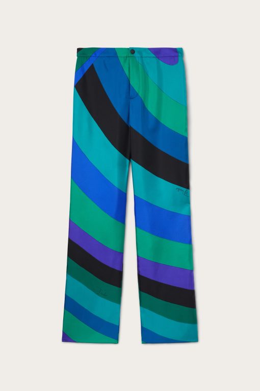 Fluid elegance and uncompromising comfort. These wide-leg, mid-rise pants wrap the silhouette with a soft, lightweight fit, perfect for those who love a sophisticated look without sacrificing practicality.Made of 100% silk, they offer an extremely lightweight feel and movement, while the waistband ensures a harmonious fit. The Iride print in emerald gives depth and dynamism to the design, enhancing the unmistakable Pucci aesthetic.