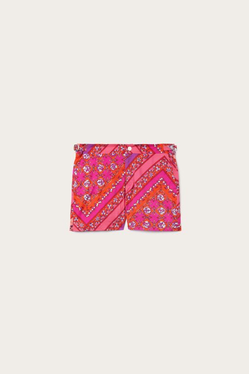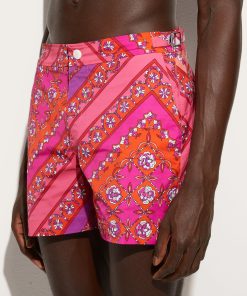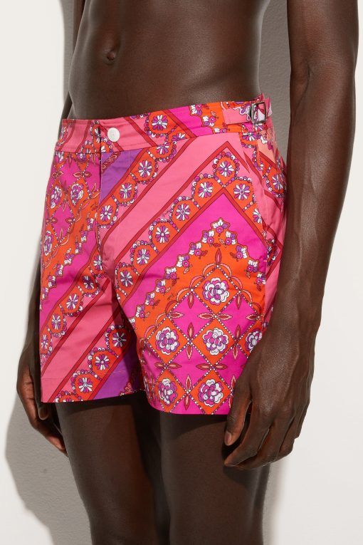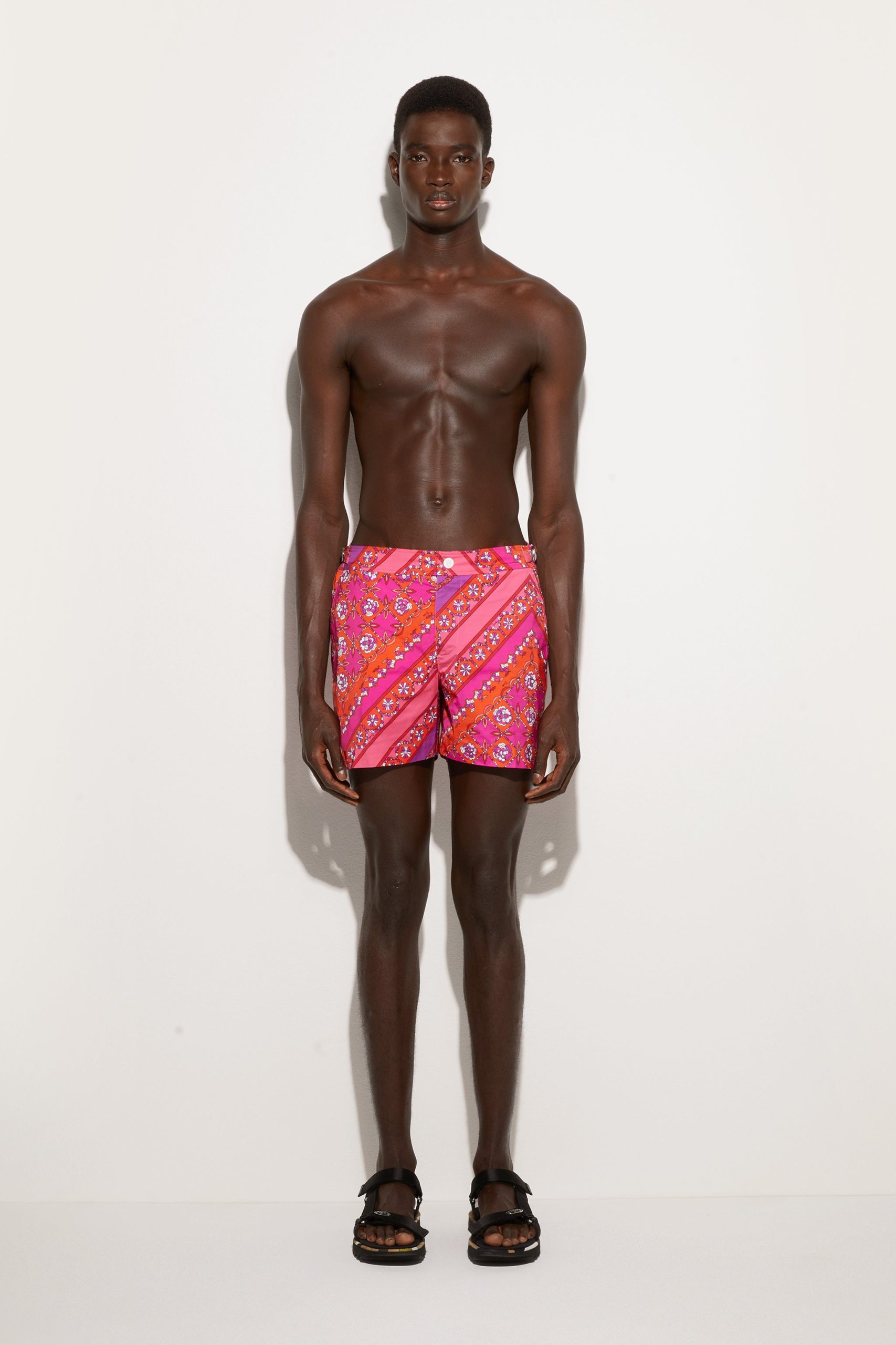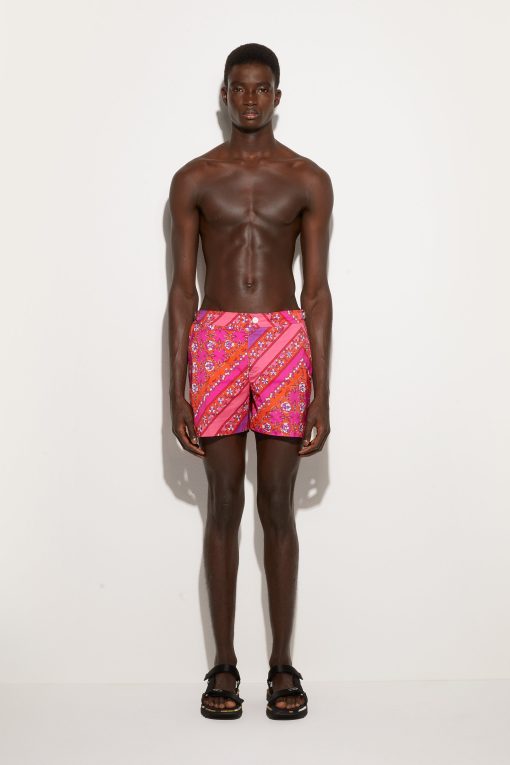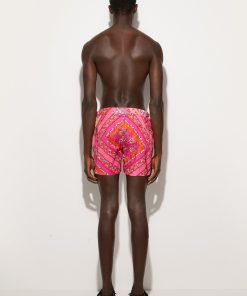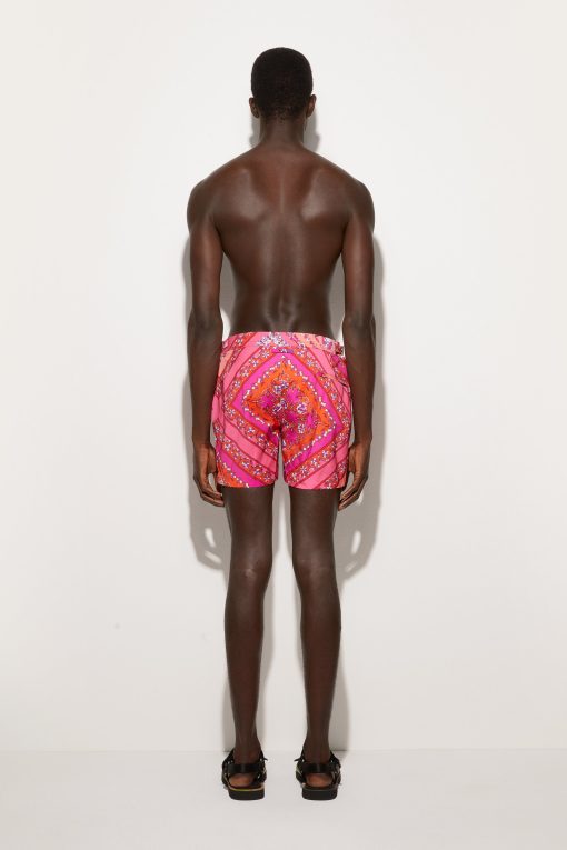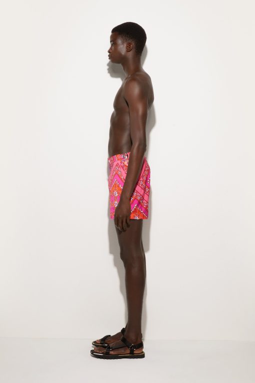A perfect garment for relaxed elegance. These beach shorts feature a boxy fit that provides freedom of movement and comfort, while practical pockets add functionality without sacrificing style. Made from an innovative technical fabric, they offer a soft, water-repellent texture ideal for quick drying. The Festa print in vibrant shades of fuchsia and coral adds an iconic graphic touch, perfect for those seeking a distinctive look even at the beach.