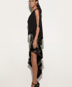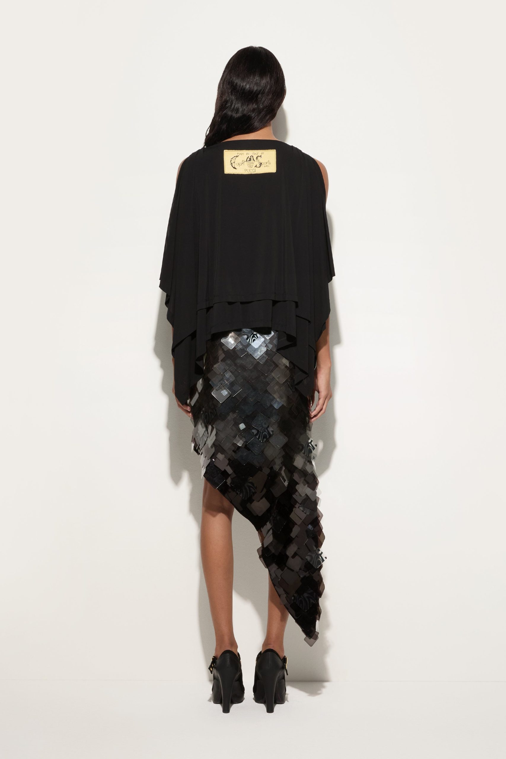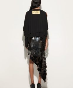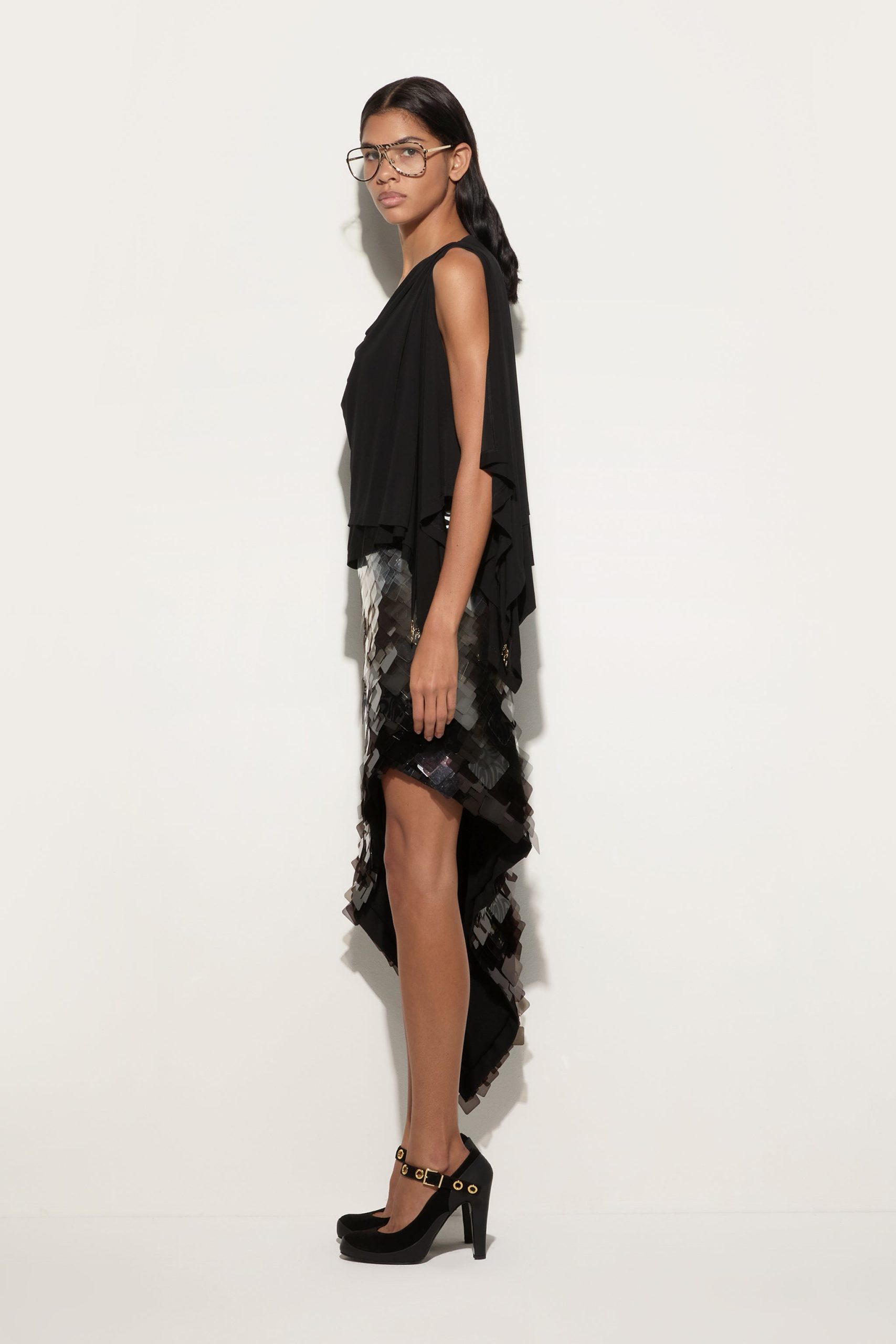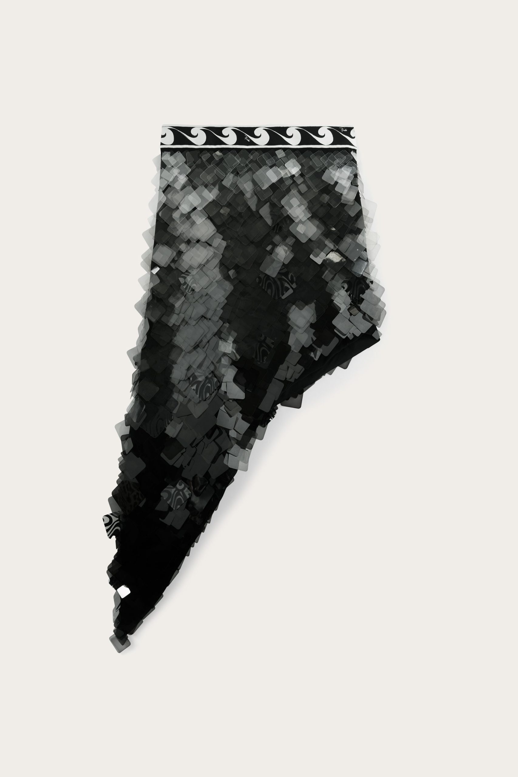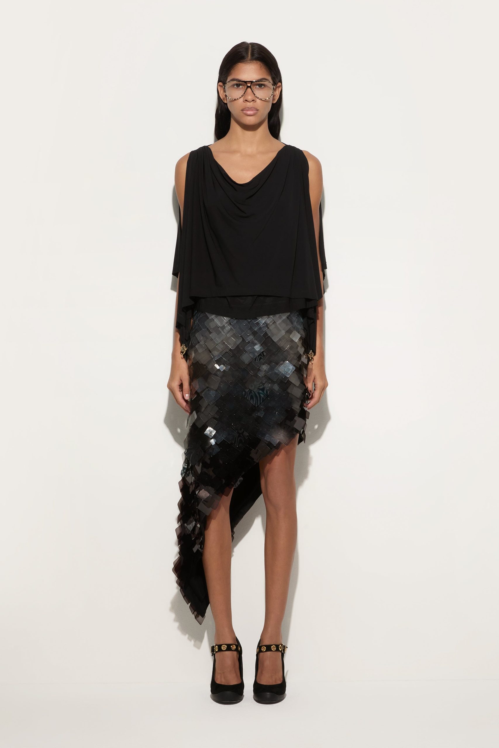 A garment that combines craftsmanship and design in a perfect balance of light and movement. This asymmetrical skirt enchants with its fluid straight cut, enhanced by an elaborate decoration of square sequins cut to measure in different sizes and shapes. The refined degradé effect, achieved by mixing four shades of sequins, illuminates the silhouette starting from a light shade at the top and fading to a darker shade toward the bottom. Further embellishing the design are Marmo printed plexy details, which add a playful and distinctive touch in pure Pucci style. An extraordinary garment, the result of 88 hours of workmanship, celebrating the brand’s heritage with a contemporary approach.