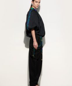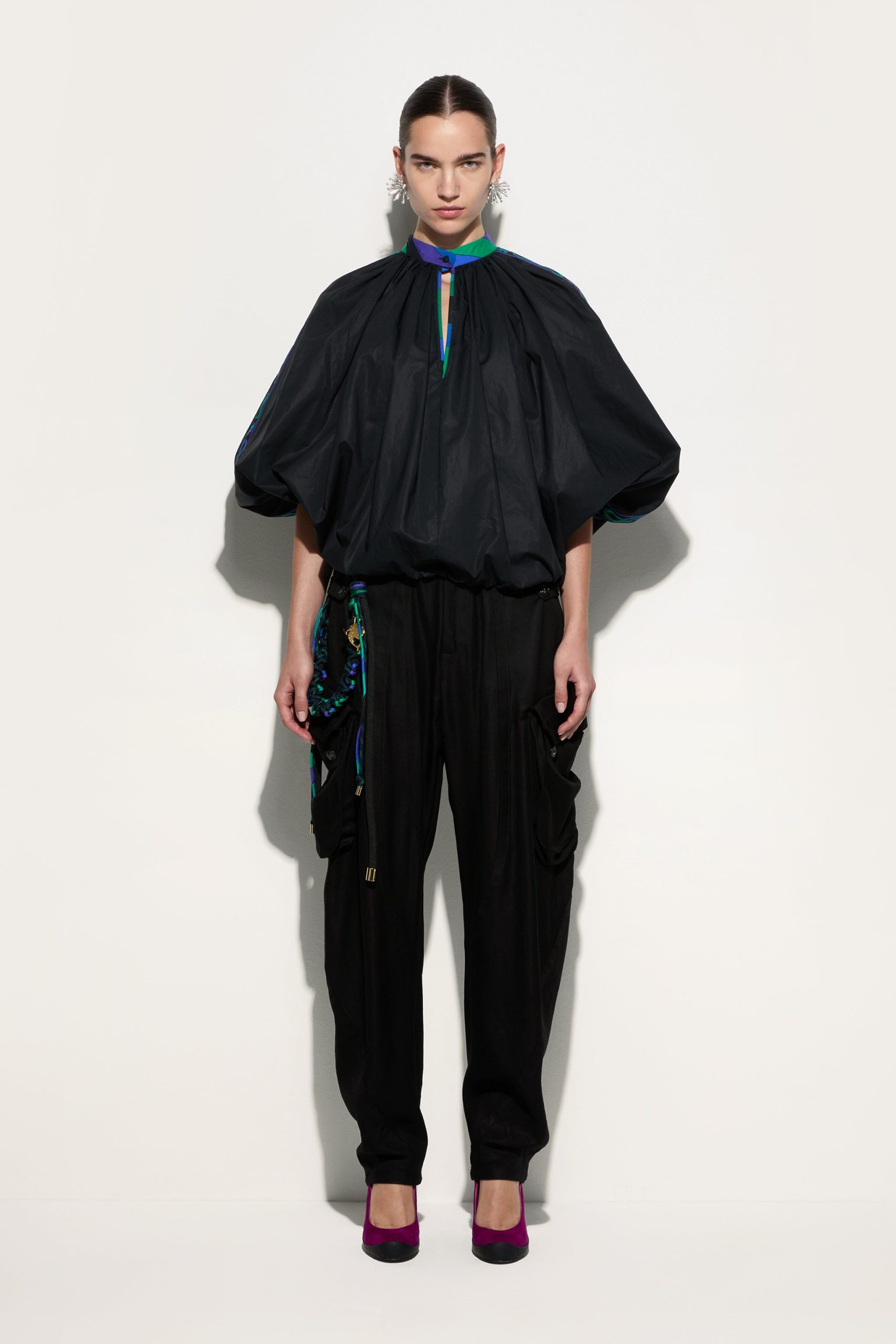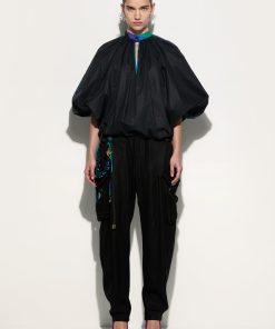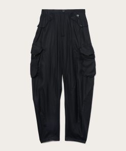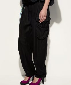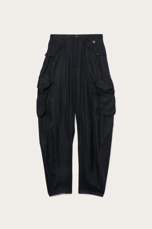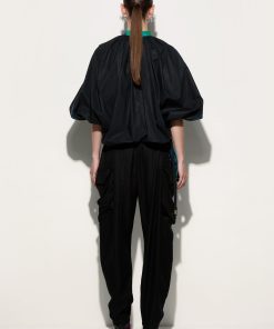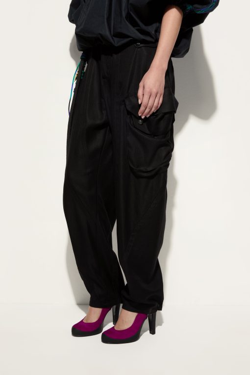 A sophisticated interpretation of utility style. These cargo-designed pants combine functionality and sophistication with their balloon fit, which creates volume and gently cinches at the ankle for a structured yet fluid effect.The four pockets add practicality, making them perfect for those who like a relaxed yet detail-oriented elegance. The black color makes them extremely versatile, ideal for any occasion.