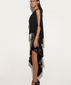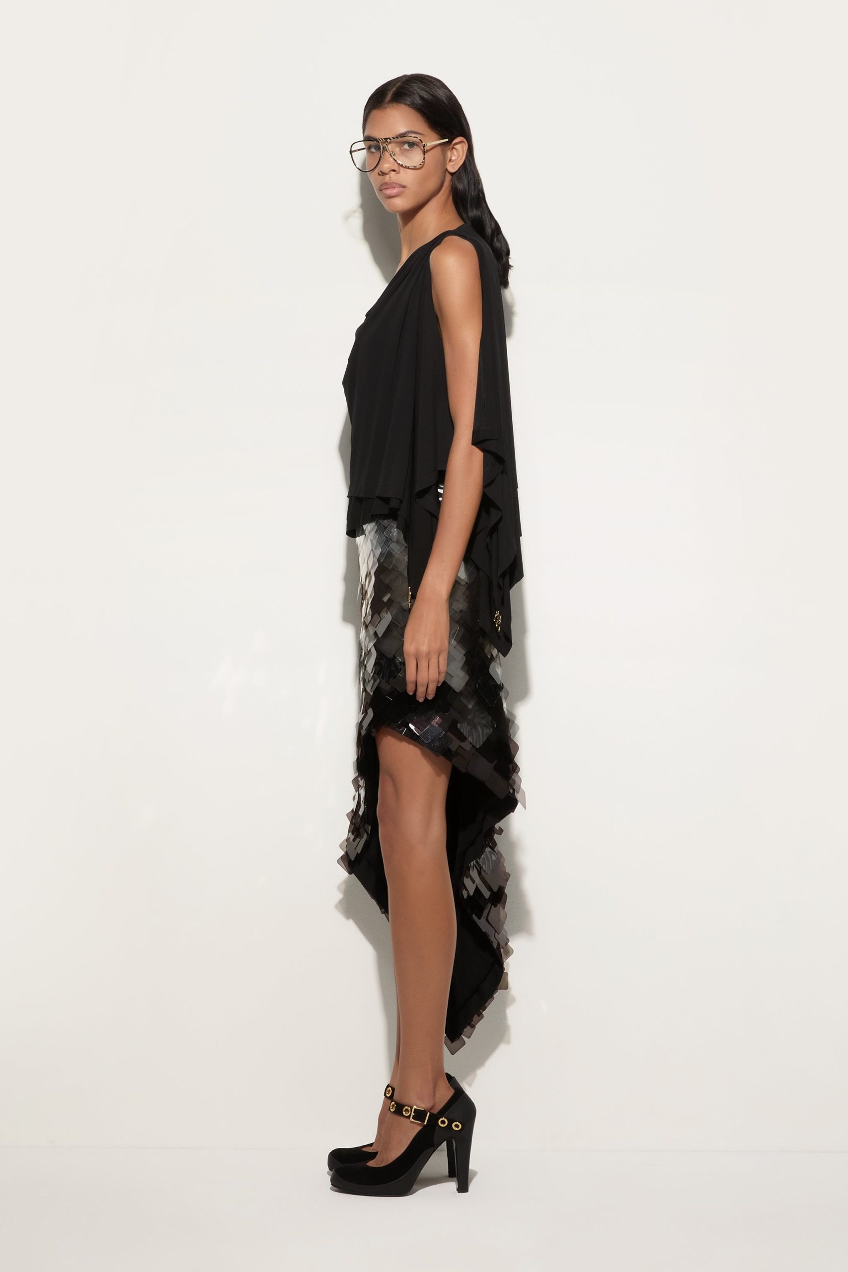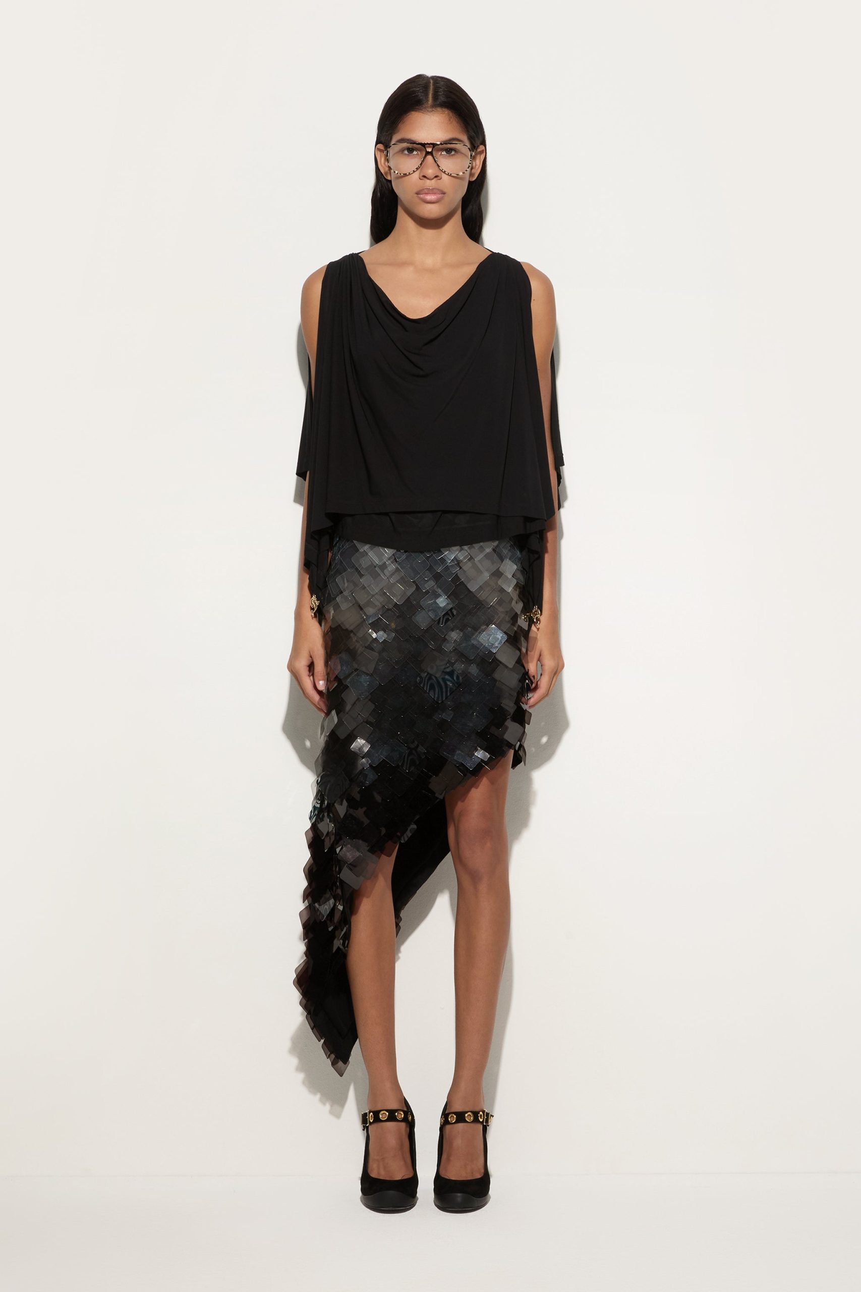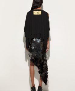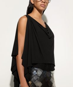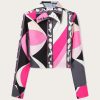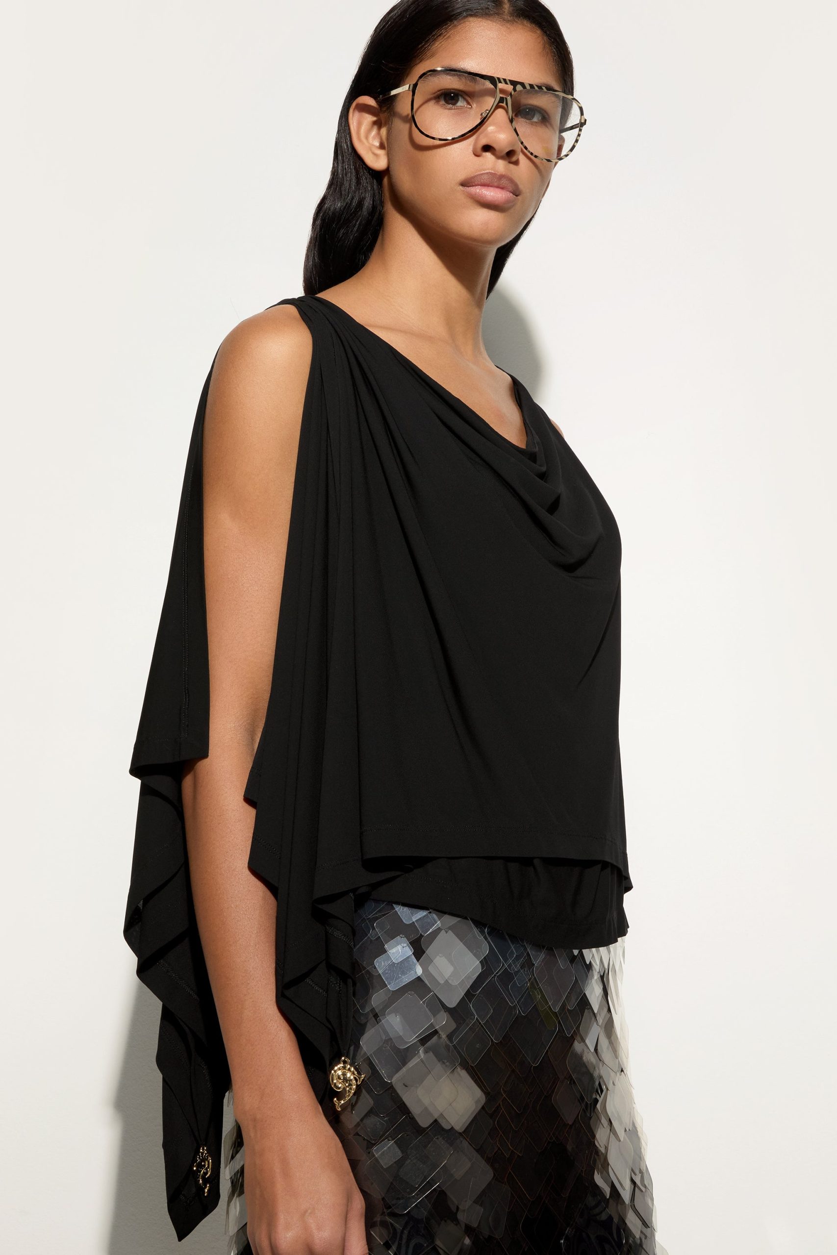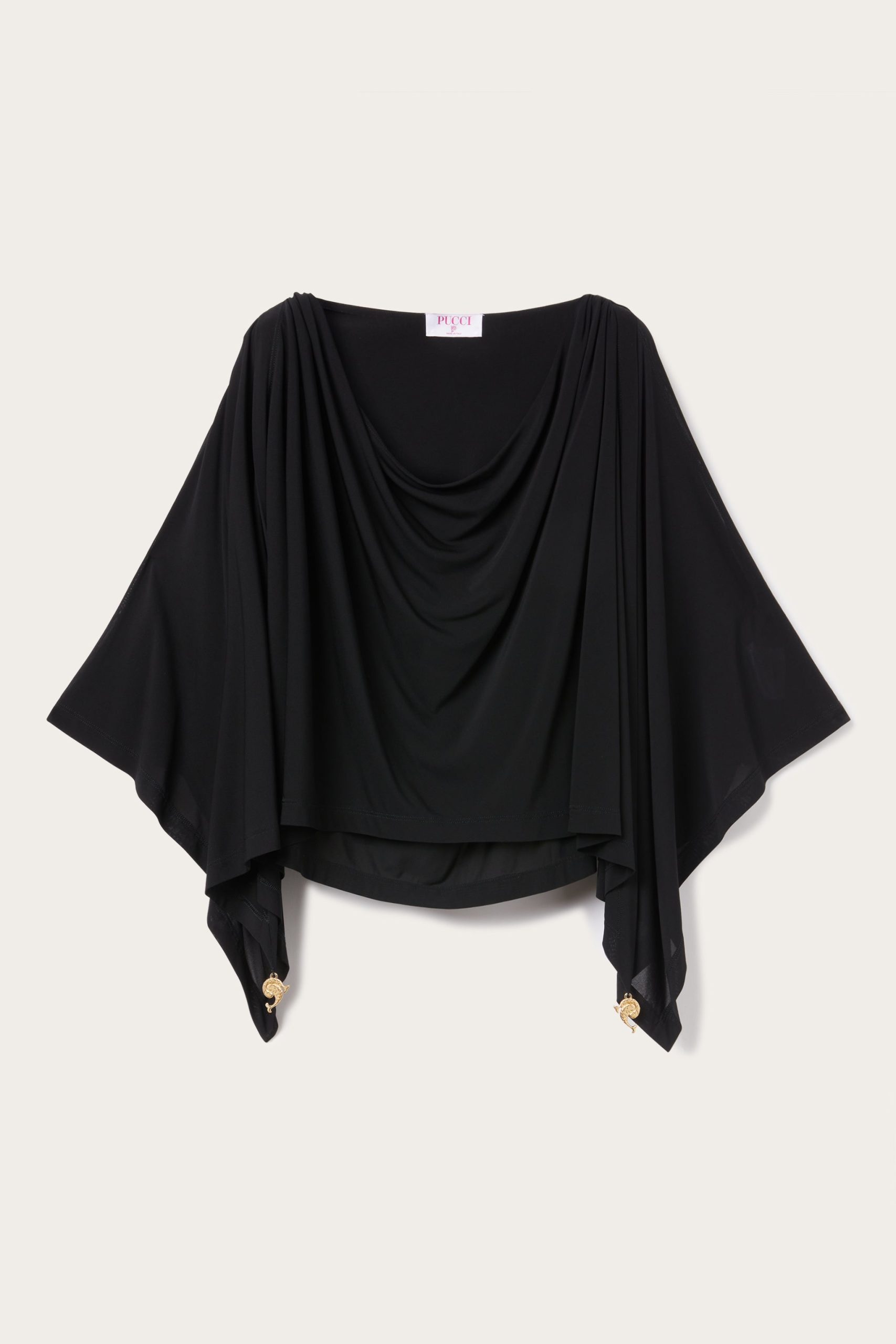 A garment that combines grace and movement, perfect for those who love an elegant yet relaxed style. Draped sleeves create a light and fluid effect, accompanying every gesture with elegance. The rounded neckline and loose fit that falls to the waist make this top ideal for those seeking comfort without sacrificing charm.The Pucci metal Pesci detail adds a playful and distinctive touch, recalling the unmistakable spirit of the brand. A versatile piece that pairs easily with tailored pants or skirts for a casual-chic look, perfect from day to evening.