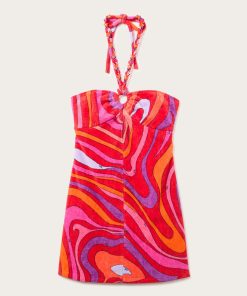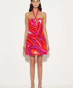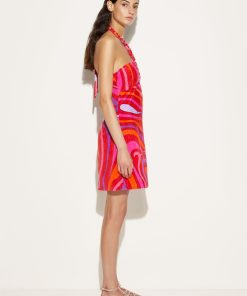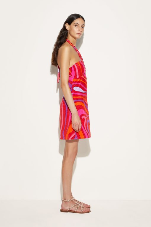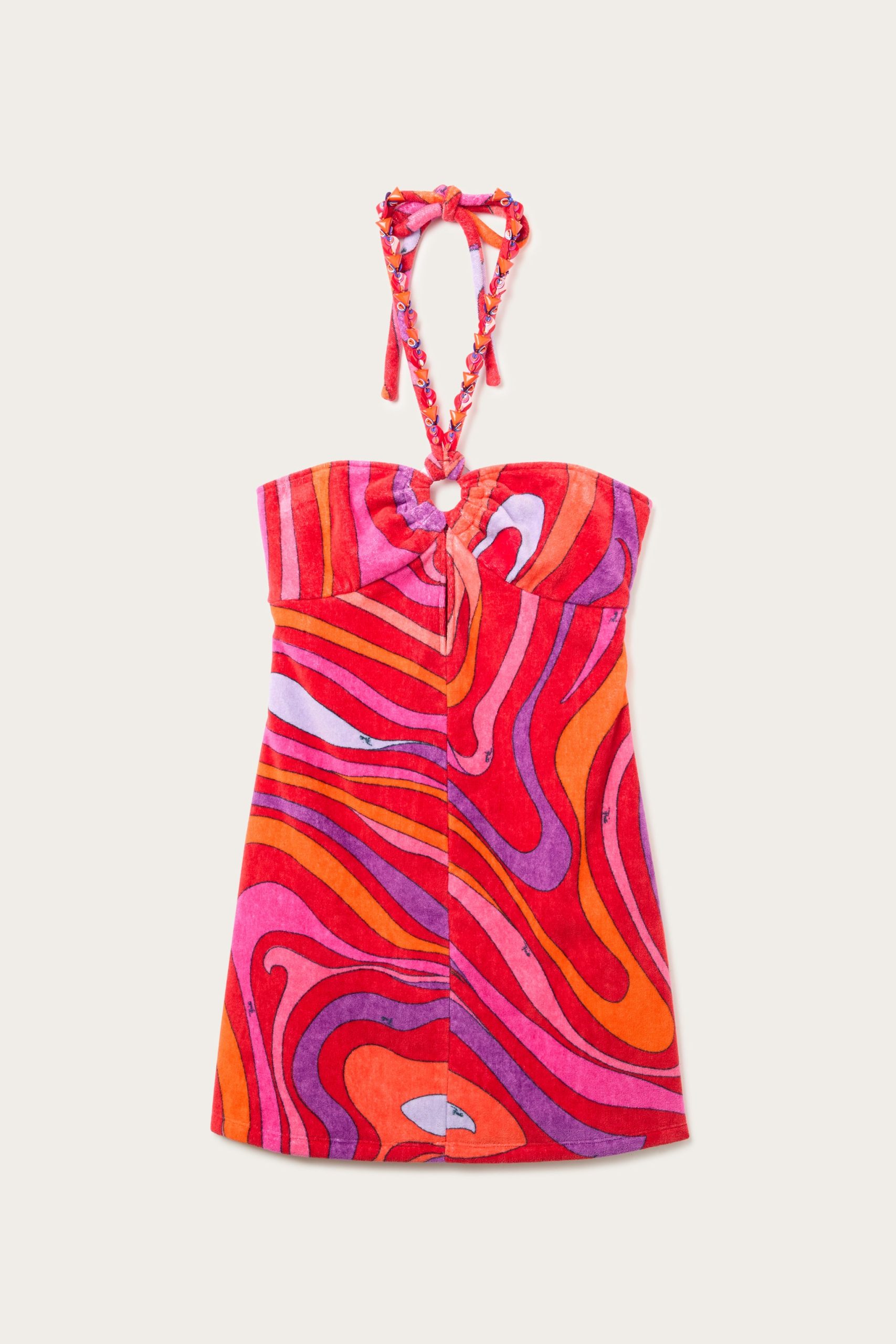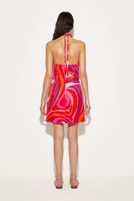 A garment that combines craftsmanship and creativity, perfect for those who love unique details. This mini dress plays with contrasts and textures, thanks to the entirely handmade embroidery that embellishes the edges with triangles and sequins of different sizes and colors. A bright and playful detail that recalls the Pucci fish logo and the brand’s vibrant energy. The eyelet opening at the chest and laces around the neck add a sensual and contemporary touch, while the 100% cotton fabric ensures comfort, soft texture and durability. The Marmo print in coral and fuchsia emphasizes the movement and fluidity of the design, making it a true piece of wearable art.