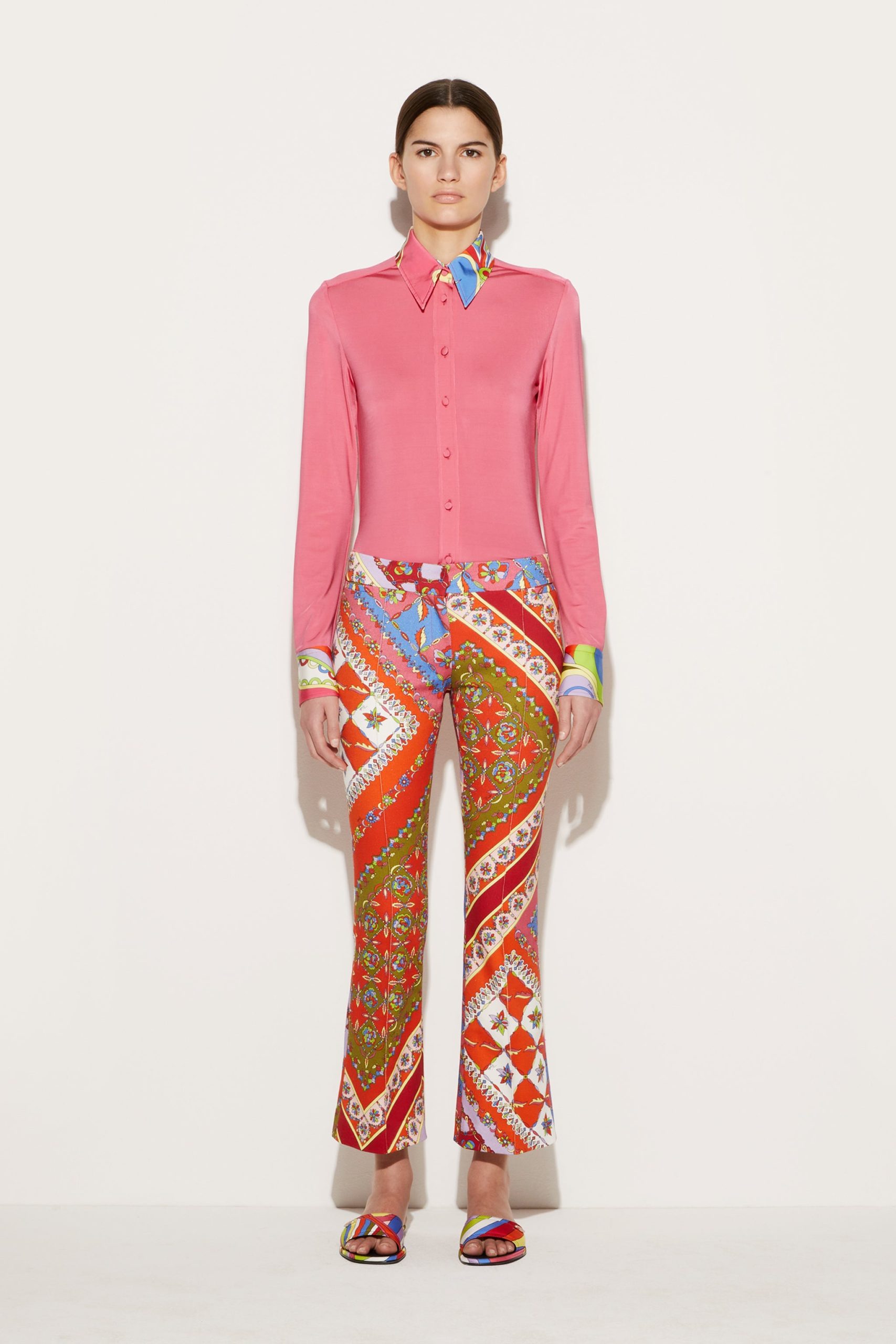 These trousers combine a tailored silhouette with Pucci’s kaleidoscopic pattern play. They’re cut to a low-waisted design that gently flares out at the hem and are decorated with the bold Festa print in a mix of joyful hues.