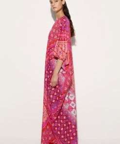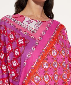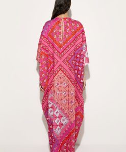 An icon of lightness and sophistication, this long caftan embodies the casual elegance typical of Pucci style. Its loose-fitting design naturally envelops the body, offering comfort and freedom of movement. Made of 100% cotton, it is perfect for warmer days, thanks to its cool and airy texture. The coral and fuchsia Festa print gives a vibrant and sophisticated touch, celebrating the brand’s energy and color dynamism.