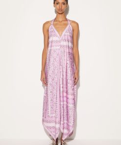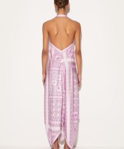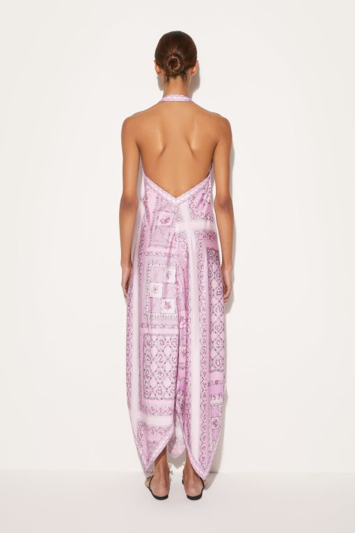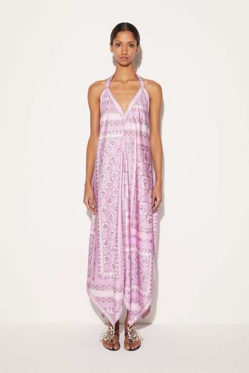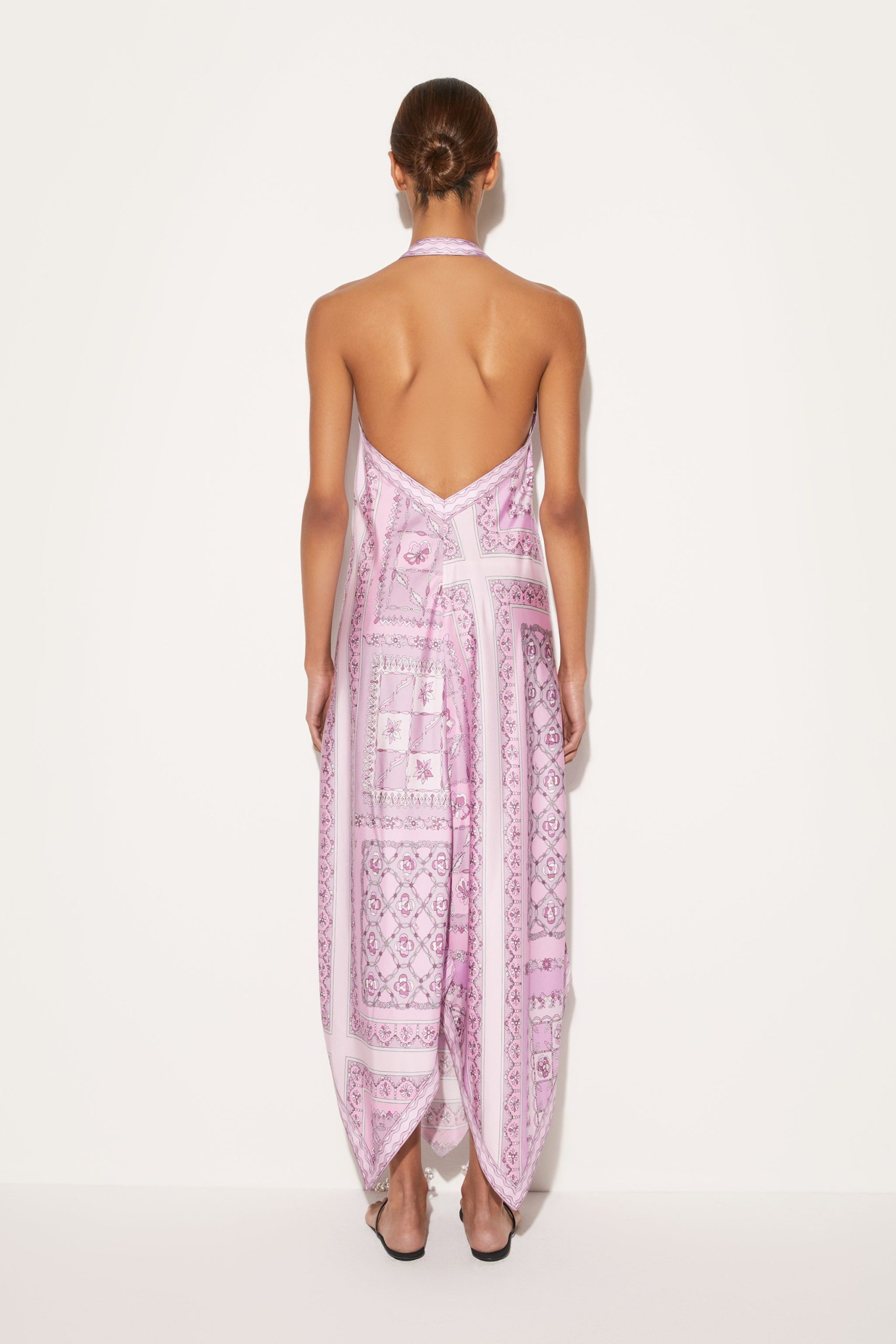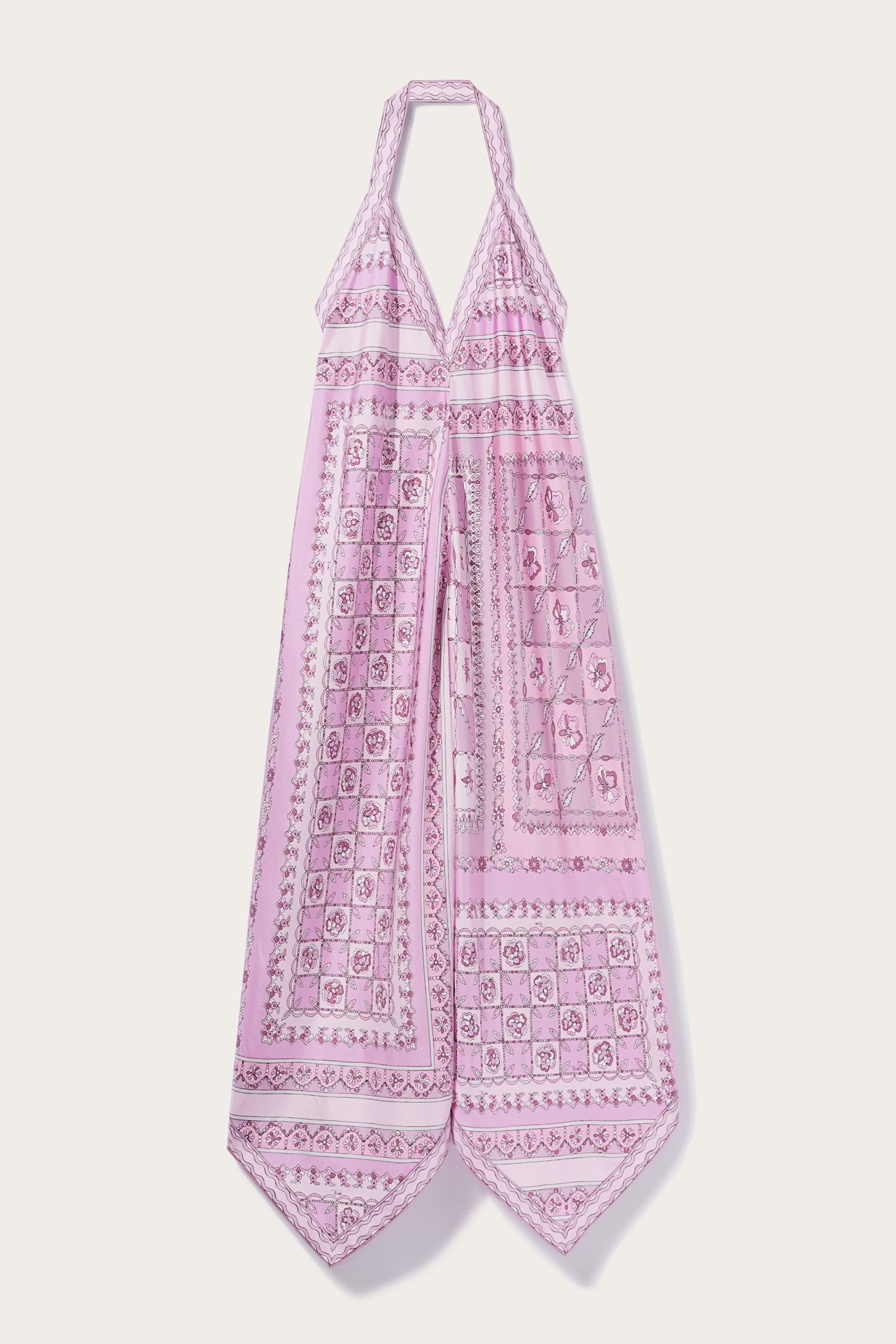 Pucci’s Festa print enlivens this silk-twill dress in sweet shades of pink. It’s cut to a halterneck silhouette that falls to a handkerchief hem, evoking the house’s iconic scarves.